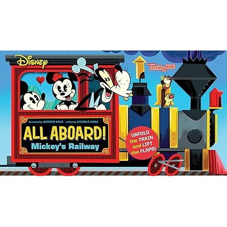 In Disney All Aboard! Mickey’s Railway, illustrator Andrew Kolb invites young readers to take a train ride with Mickey in this accordion-fold board book, with flaps to lift on every page.