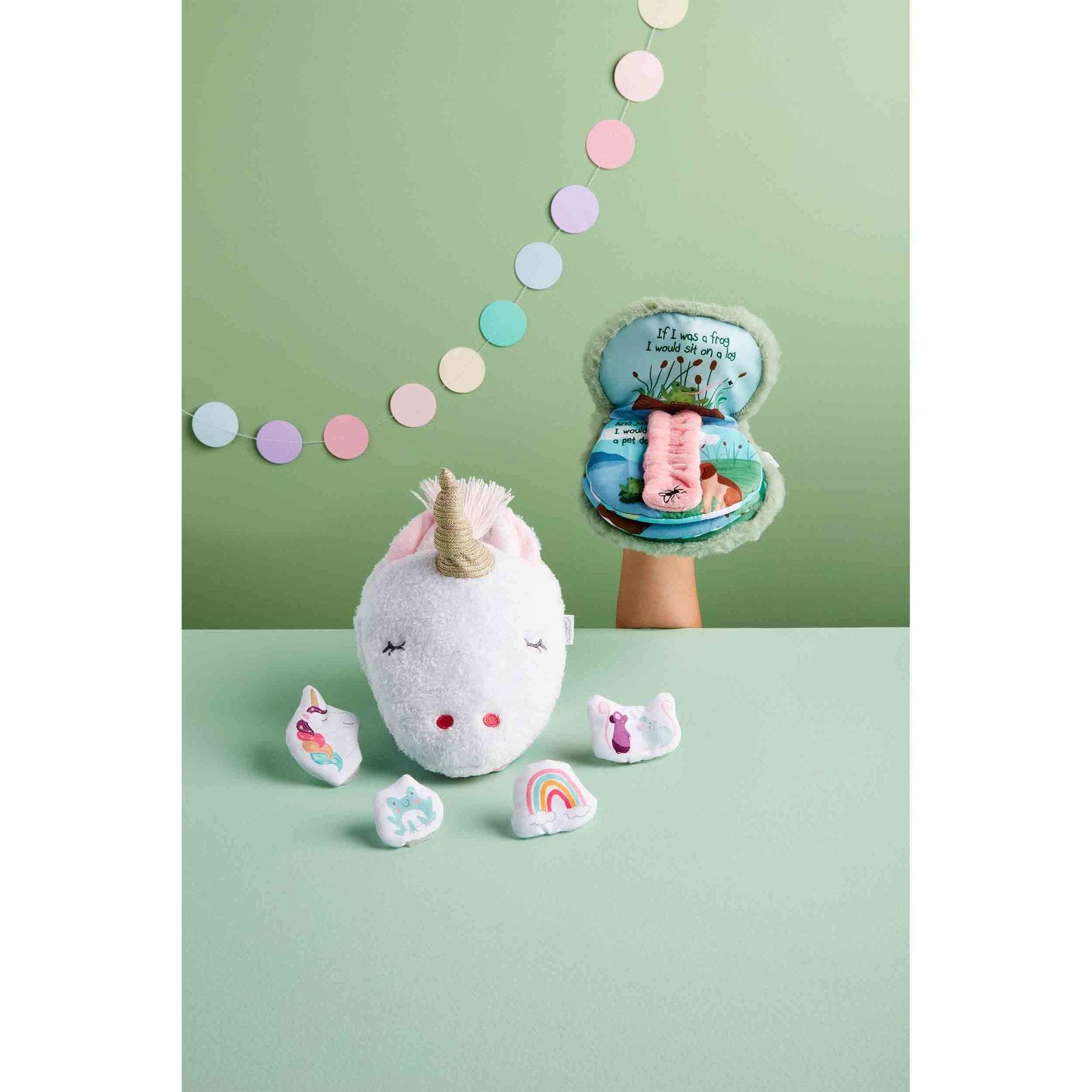 Bring Mr. Frog to life with our Frog Puppet Book. The faux fur and minky puppet book has a fly-catching tongue. The book also features a ribbiting sound chip. Don't forget to slide him over your hand for hopping fun. All Mud Pie books are soft, baby safe, originally illustrated and written.