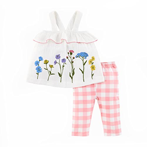 Spring is in the air with our Flower Embroidered Tunic and Legging Set. The two piece set comes with an embroidered cotton gauze tunic. The tunic features a white background with a chest ruffle and bright floral details. The tunic also comes with gingham cotton spandex capris.