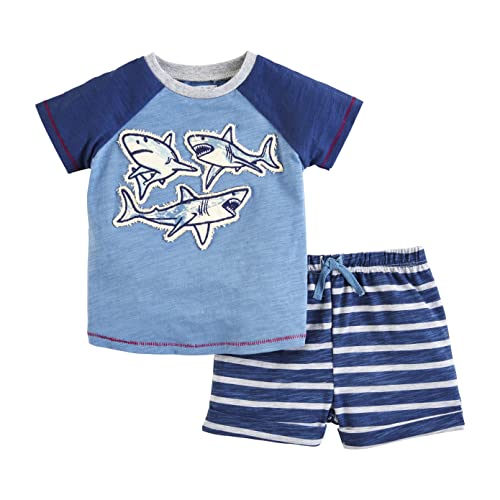 Teach your little one to dream as big as the ocean with our Shark Toddler Short Set. The two piece set comes with an appliqued cotton slub tee. The tee features shark images in the center. The tee comes with pull-on cotton slub shorts. The shorts feature a blue and white striped pattern.