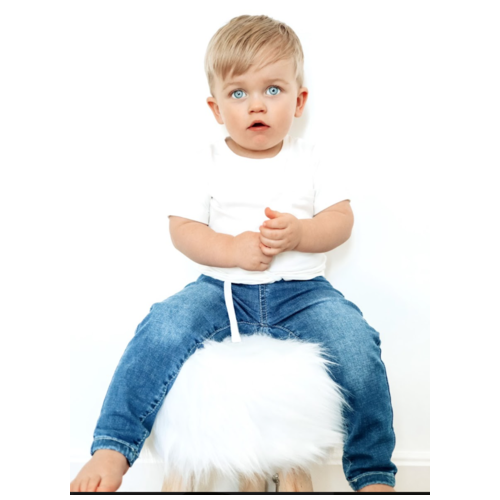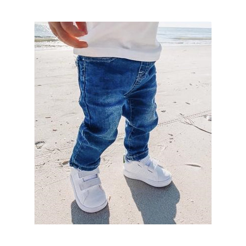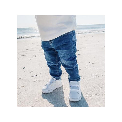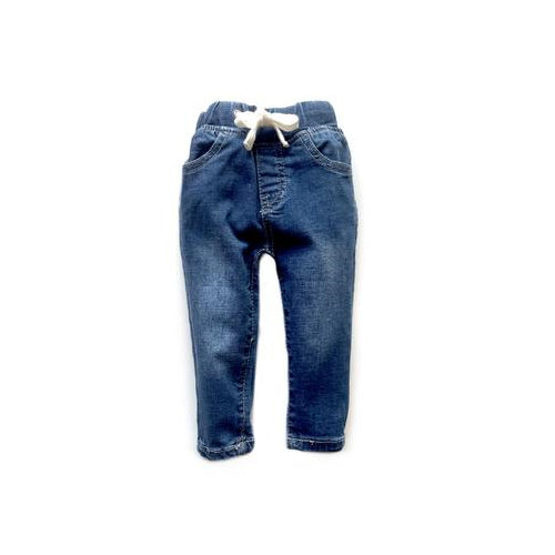 Color: Midwash. Unisex. Elastic waistband. Functioning drawstring. Mid-high rise back that completely covers diaper. Straight skinny leg fit. Four-way stretch denim for non-restricting movement. Front and back pockets perfect for storing treasures and treats. Easy to roll and grow with your little one.