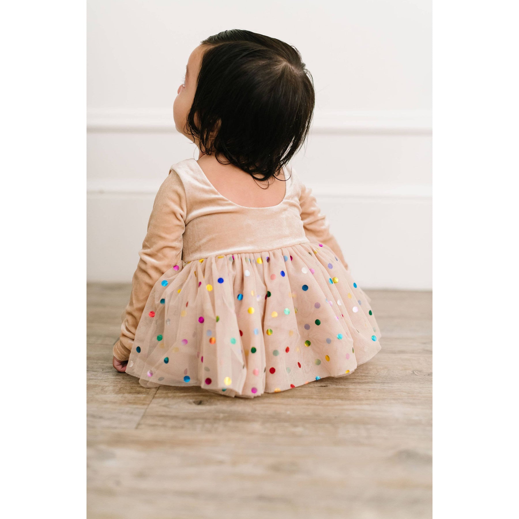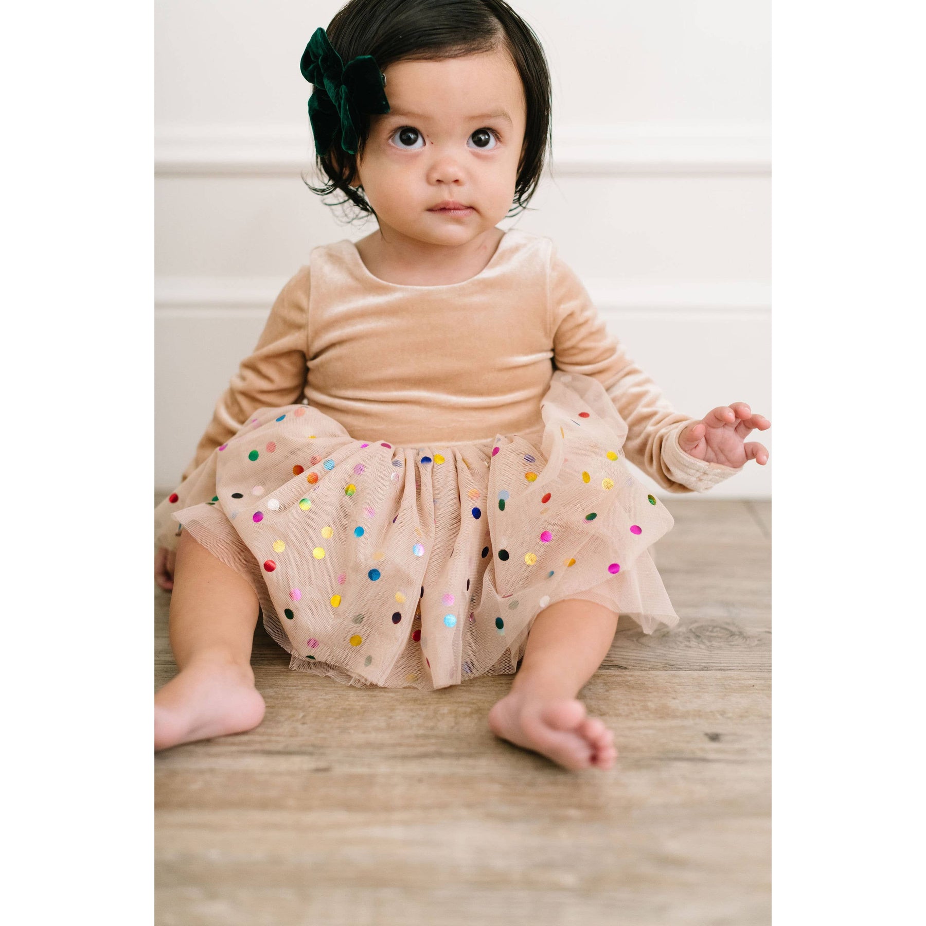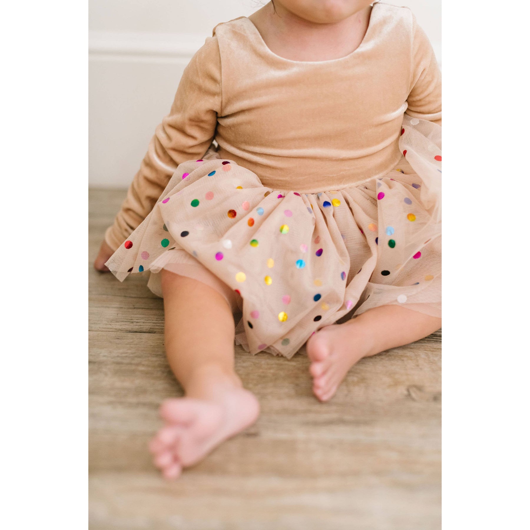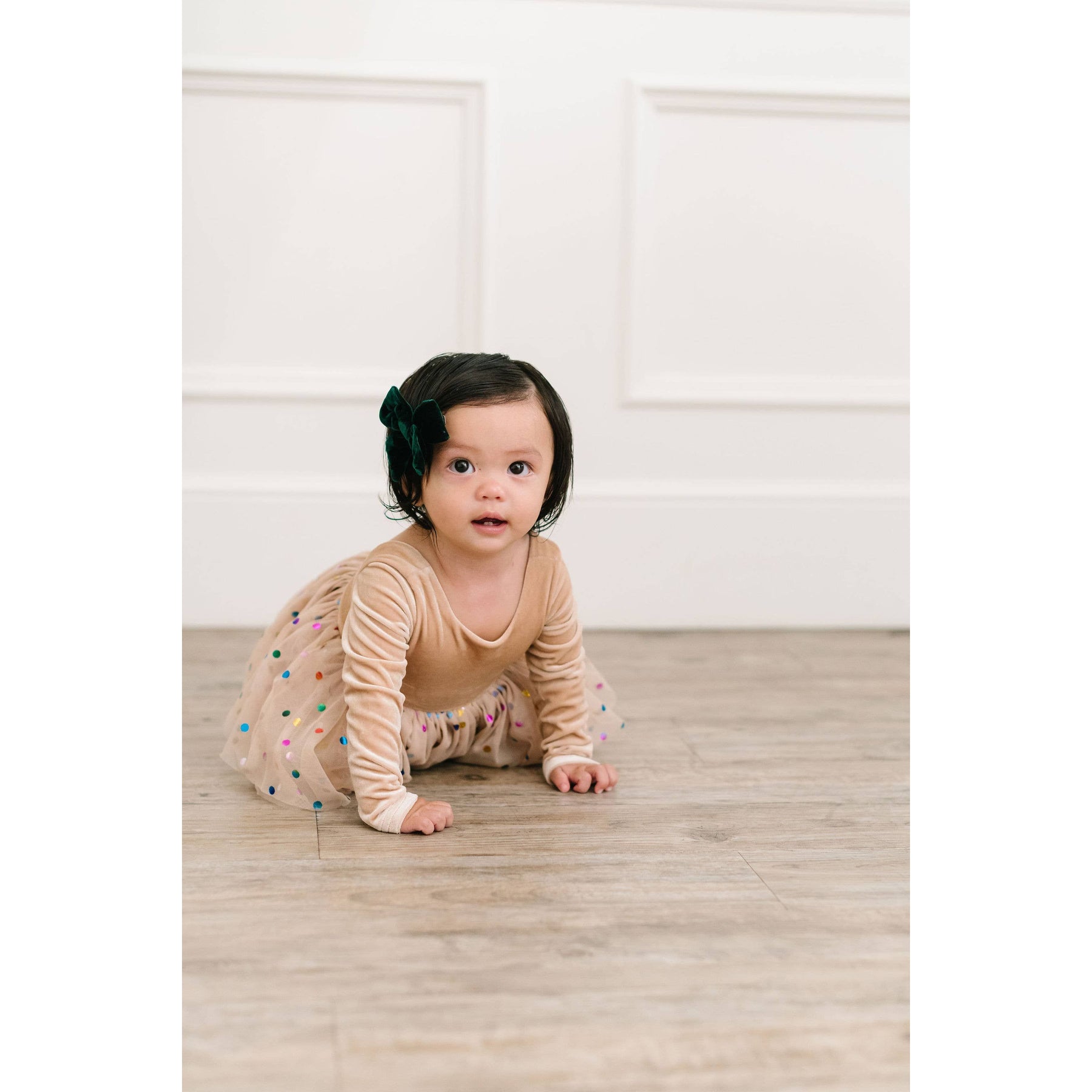 Our Carly Romper features long sleeves, a short tulle skirt and a 3 snap closure for easy diaper changes!