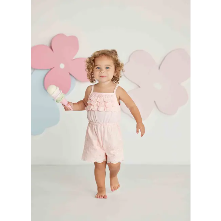 Our Pink Eyelet Toddler Romper is perfect for any occasion. The cotton lined eyelet sleeveless romper features a ruffle chest. The romper features an elastic waist and a scallop hem. The romper features a delicate light pink coloring. This is perfect for Spring and Summer celebrations.