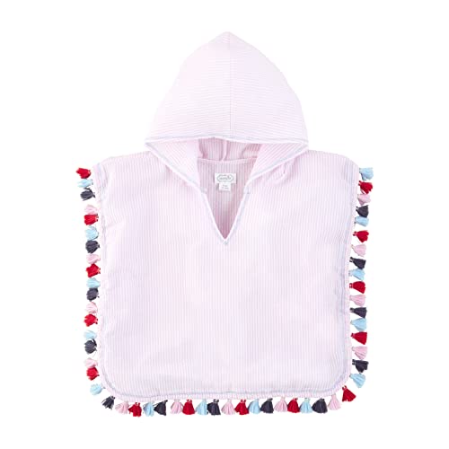 Get ready for pool days with our Girls' Seersucker Poncho Coverup. The poncho-style cover-up features a seersucker pattern. The cover up also features a hood and tassel trim. This cover up is lightweight and perfect for packing on beach vacations! Make sure to pair with our smiley sandals for the perfect pool look!
