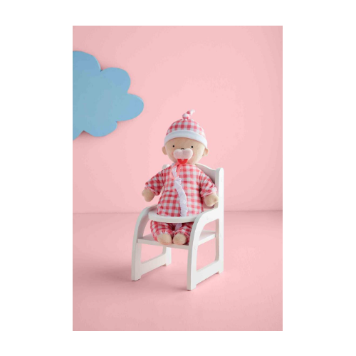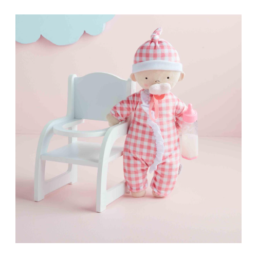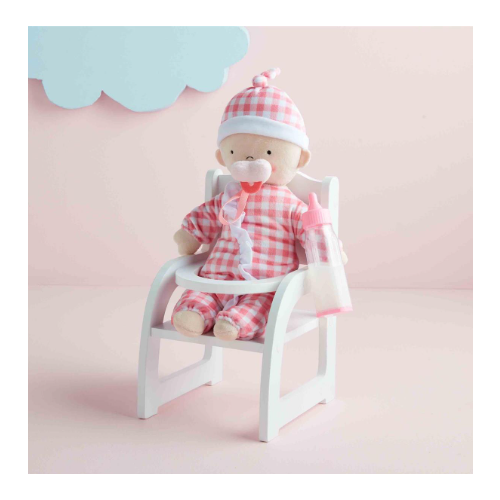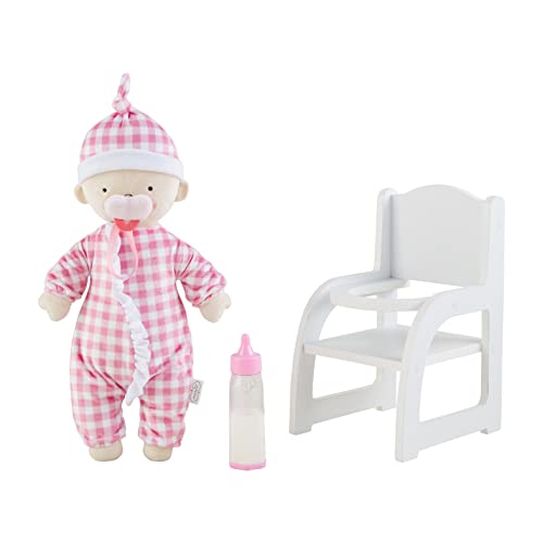 3-piece set. Huggable plush minky baby doll comes with "magic" milk bottle and wooden high chair.