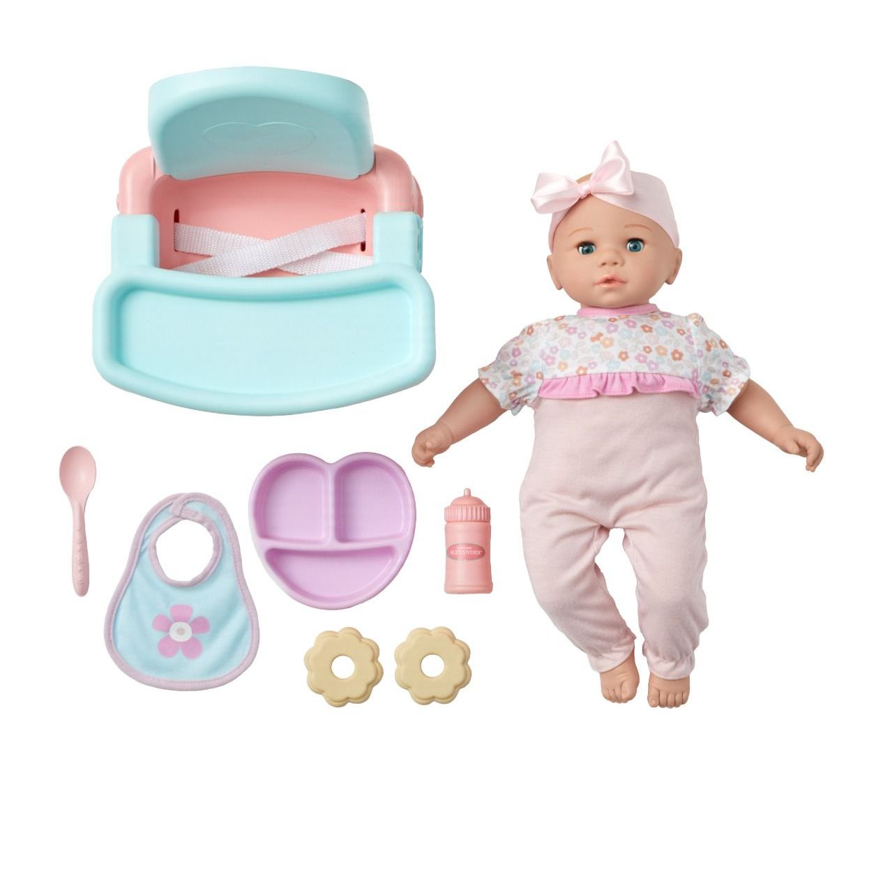 Our Sweet Smiles family is expanding with 4 new realistic 14-inch dolls. Snack Time baby comes with a highchair and bib for feeding fun. Puppet Play includes puppet friends for hours of imaginative play. Bear Sleep Sack features a cozy, bear ear adorned swaddle and sleep mask. Slumber Carrier baby comes tucked in her own Moses basket with handles for on the go play. Let the nurturing fun begin! This adorable 14 inch baby doll comes complete with highchair and bib for feeding fun. Comes with highchair, spoon, bib, bottle, bowl, and some snacks. She comes dressed in a floral top accented with ruffles, pink leggings and a bow headband. The baby has a soft body, a weighted bottom and molded head, legs, and arms so it feels so real to your child! The baby’s gently smiling face has sleepy eyes, facilitating bedtime play. Ages 12 mo+.