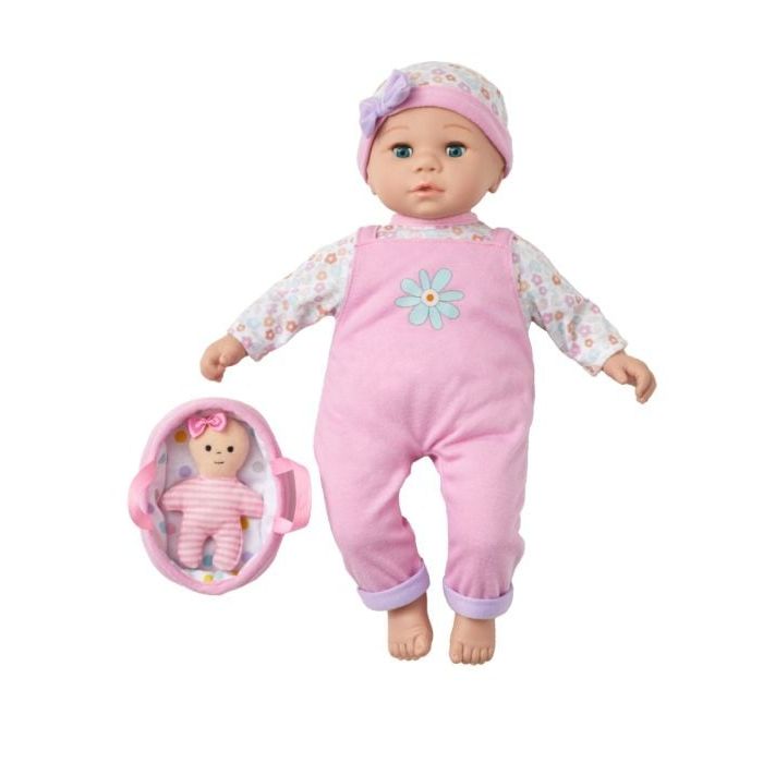 Our Sweet Smiles family is expanding with 4 new realistic 14-inch dolls. Snack Time baby comes with a highchair and bib for feeding fun. Puppet Play includes puppet friends for hours of imaginative play. Bear Sleep Sack features a cozy, bear ear adorned swaddle and sleep mask. Slumber Carrier baby comes tucked in her own Moses basket with handles for on the go play. Let the nurturing fun begin! These adorable 14-inch dolls, dressed in overalls are perfect for nurturing play. Baby's Best Friend has a mini baby in a Moses basket. Dressed in pink overalls and a floral undershirt with matching cap these little gal is ready for playtime. The baby has a soft body, a weighted bottom and molded head, legs, and arms so it feels so real to your child! The baby’s gently smiling face has sleepy eyes, facilitating bedtime play. Ages 12 mo+.