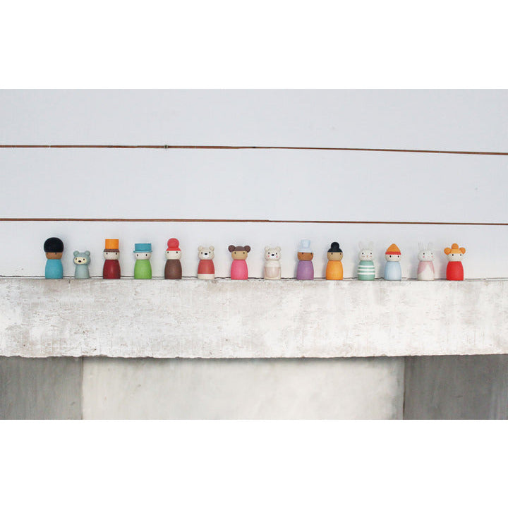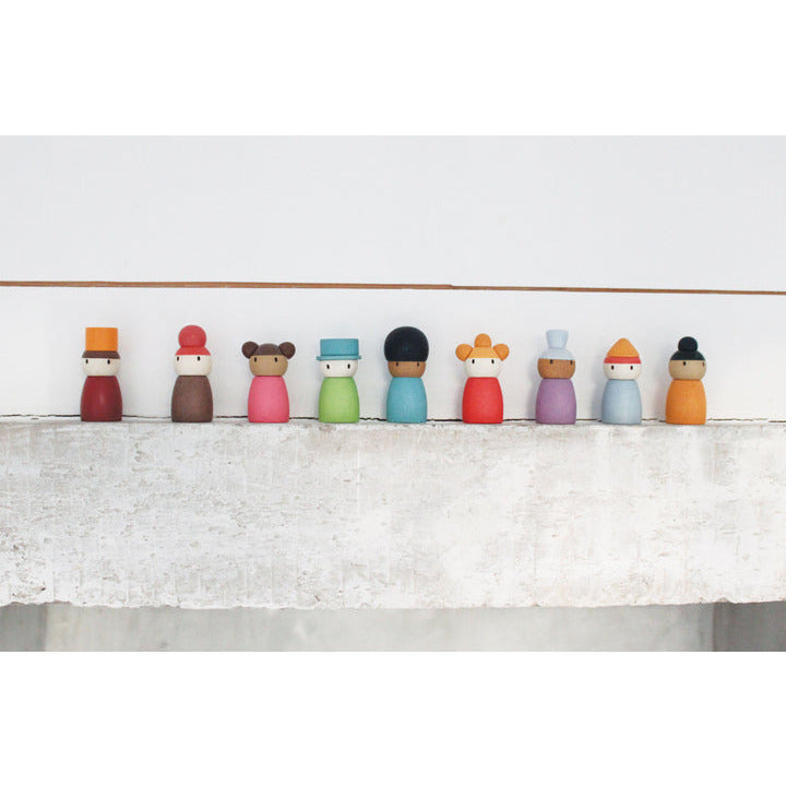 Part of our open-ended play, meet the 9 folks who reside at the happy hotel. Made from solid wood, colored with a soft water based stain, they can represent anyone you know. These little people are perfect for adding to any sort of creative or imaginative play, and can be perched easily on any surface.