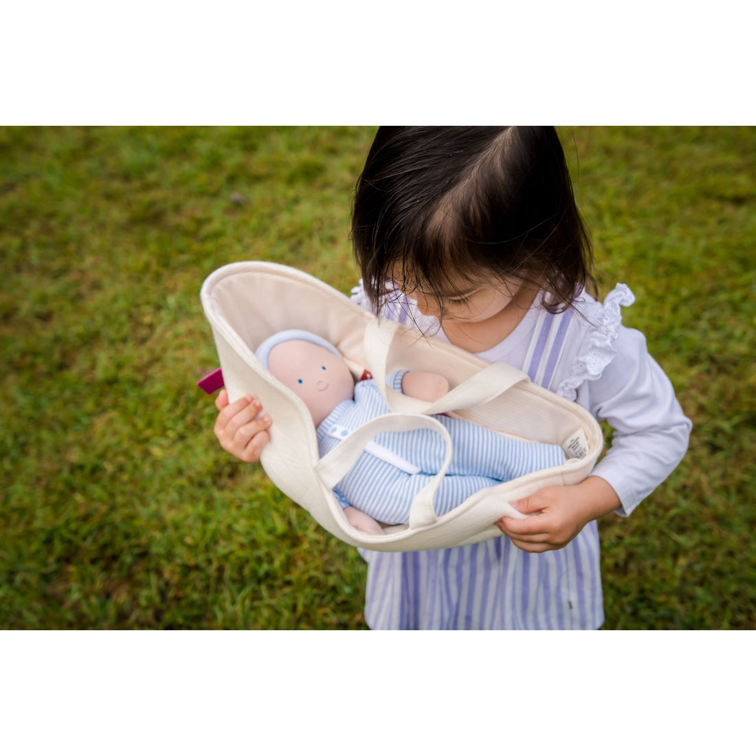 Baby Carry Cot- lovely carry cot made for your perfect little baby doll, as after all beautiful baby dolls deserve lovely carry cots. Your little one will love this special accessory. Gorgeous soft fabric make this a beautifully crafted carry cot for your baby doll to be carried around on play dates. This lovely carry cot is made of OCS 100 Certified Organic Cotton. Age Recommendation: 0+ months Size: 7" x 11" Inside of Cot - 100% Cotton yarn-dyed Single Jersey Outside of Cot - 100% Cotton Muslin
