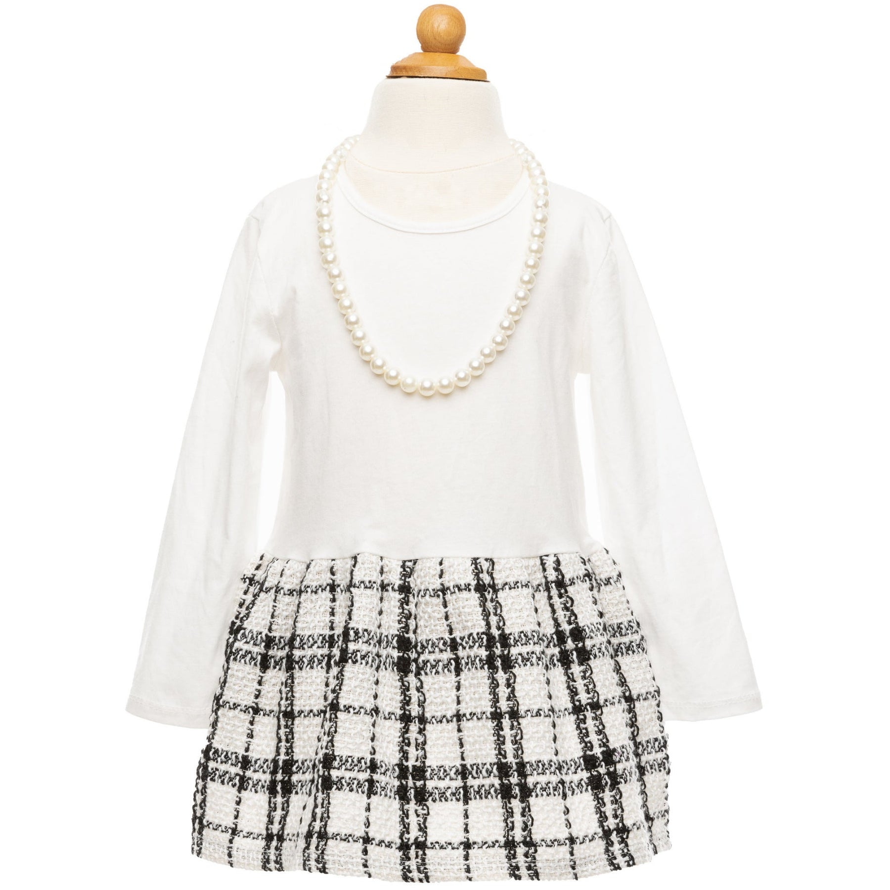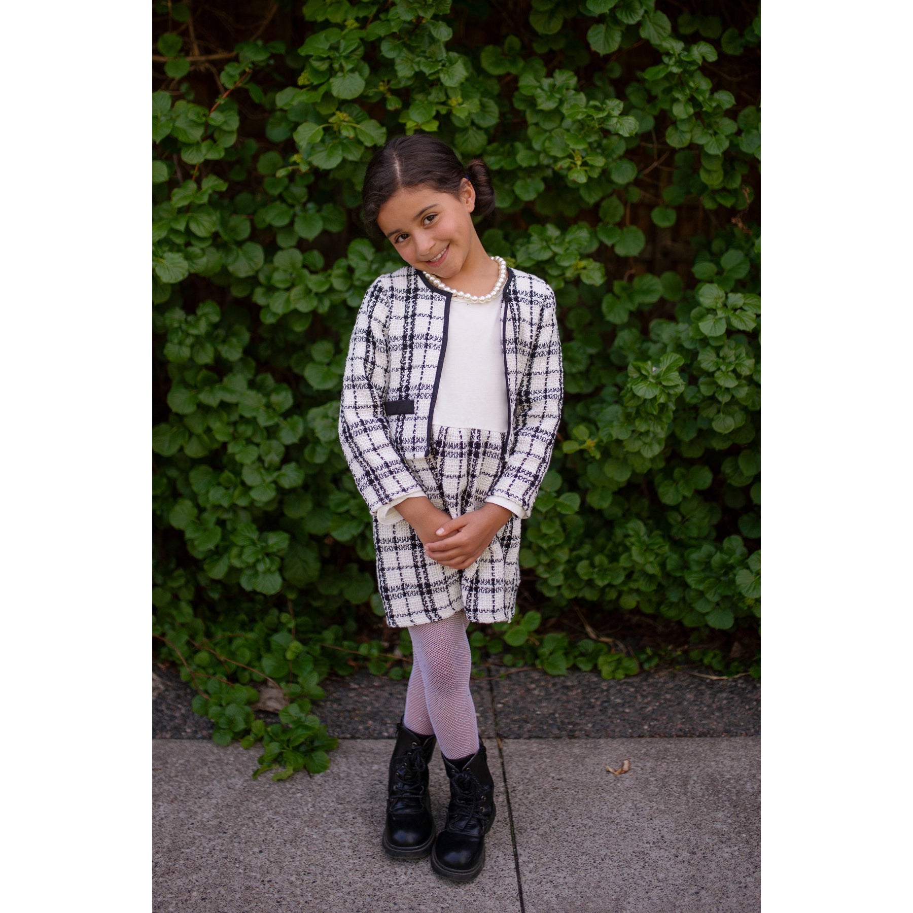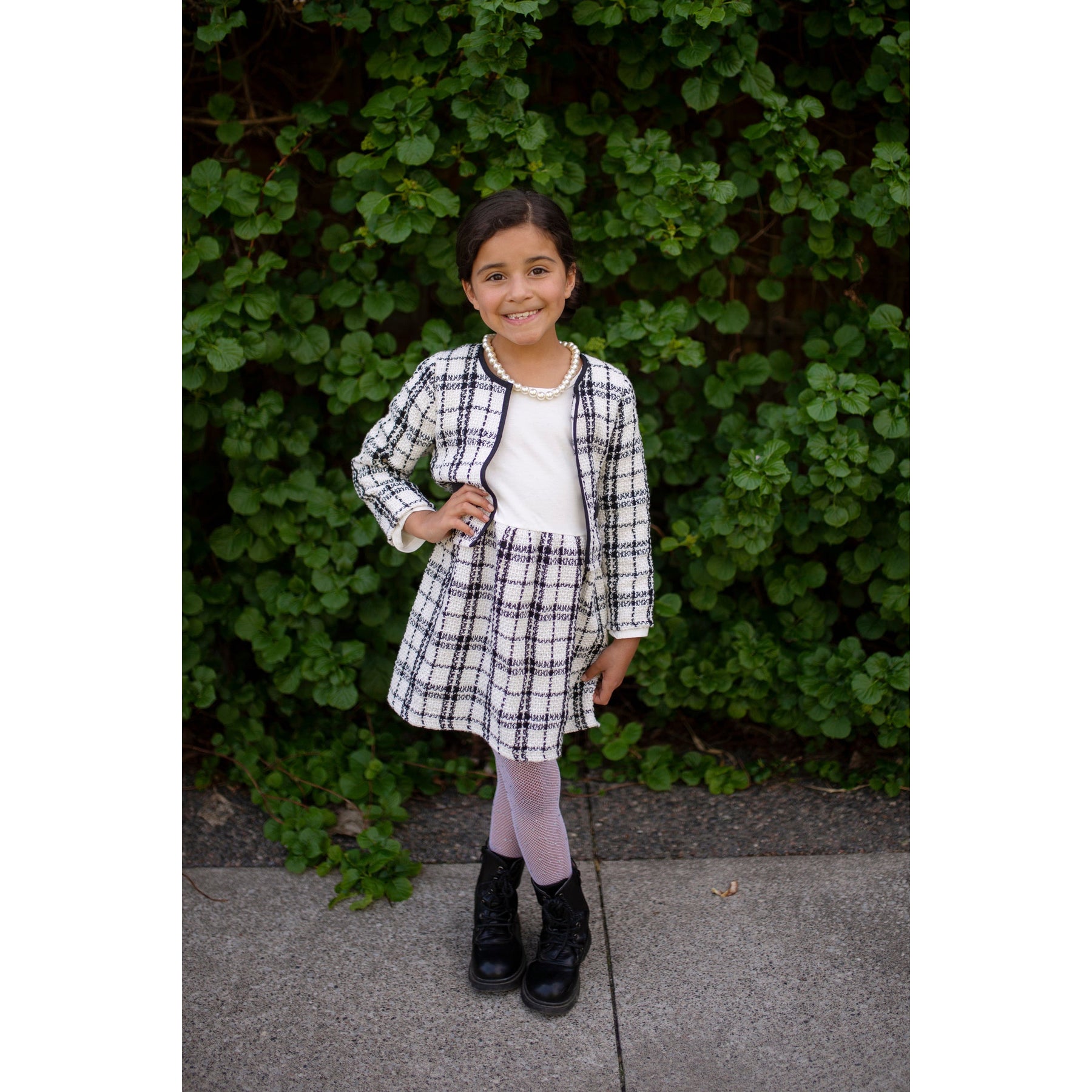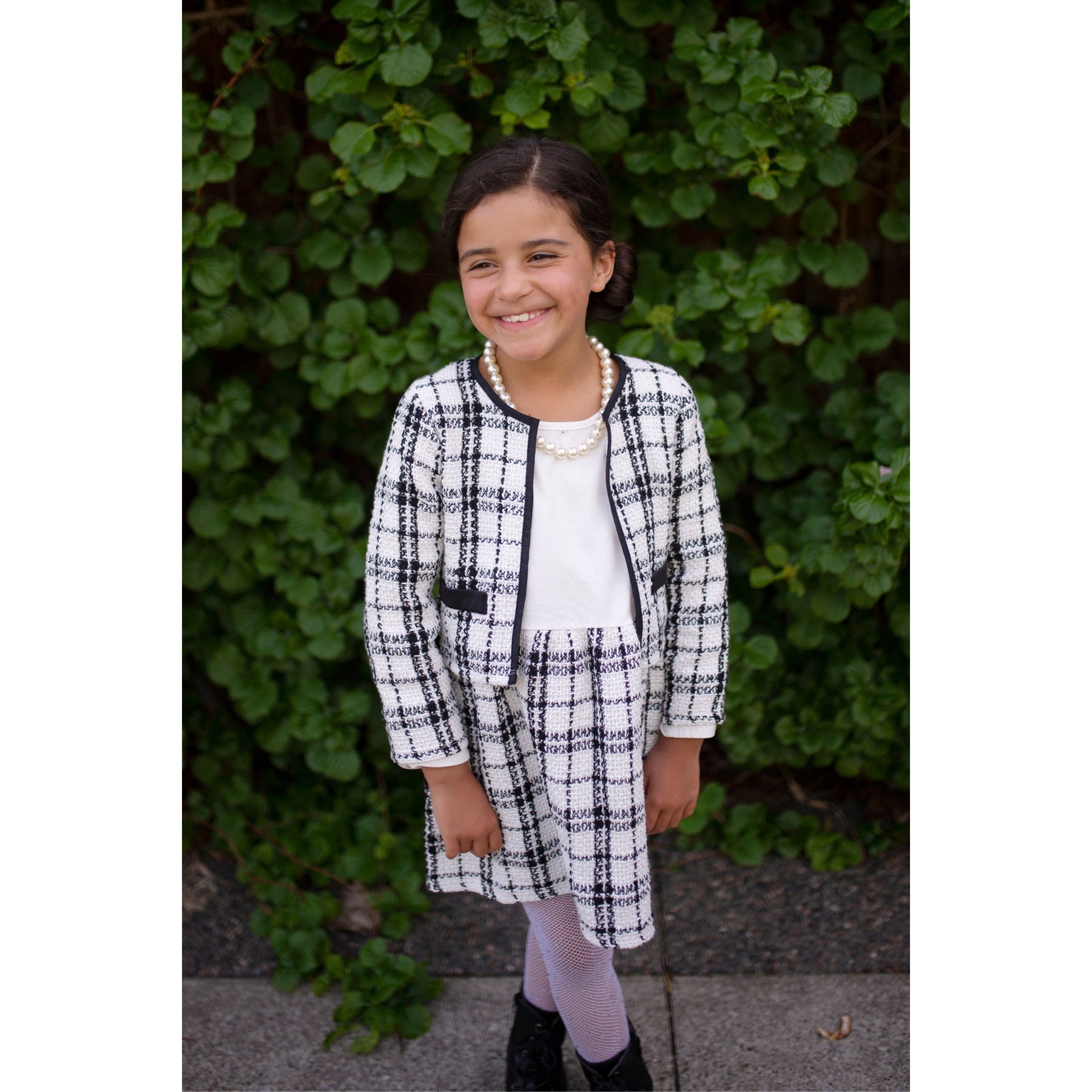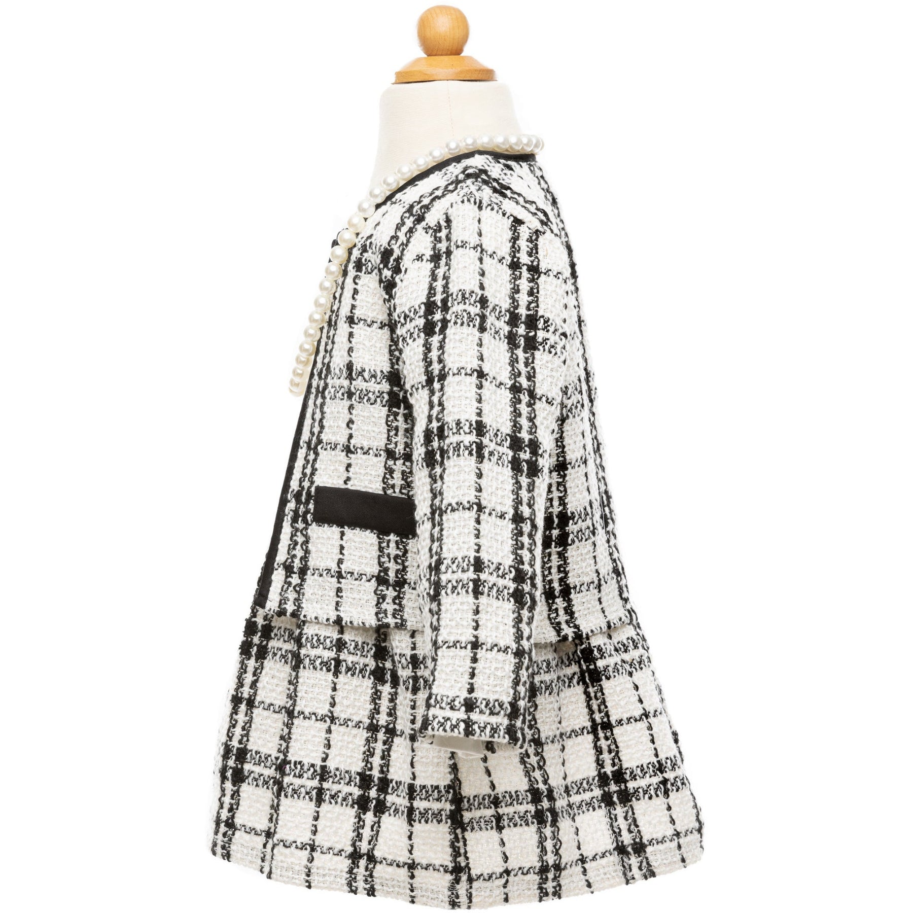 Channel your inner designer with our Coco the Fashionista set. Future fashion icons are sure to look the part in this classic cream & tweed dress and jacket set that is made complete by a strand of pearls.