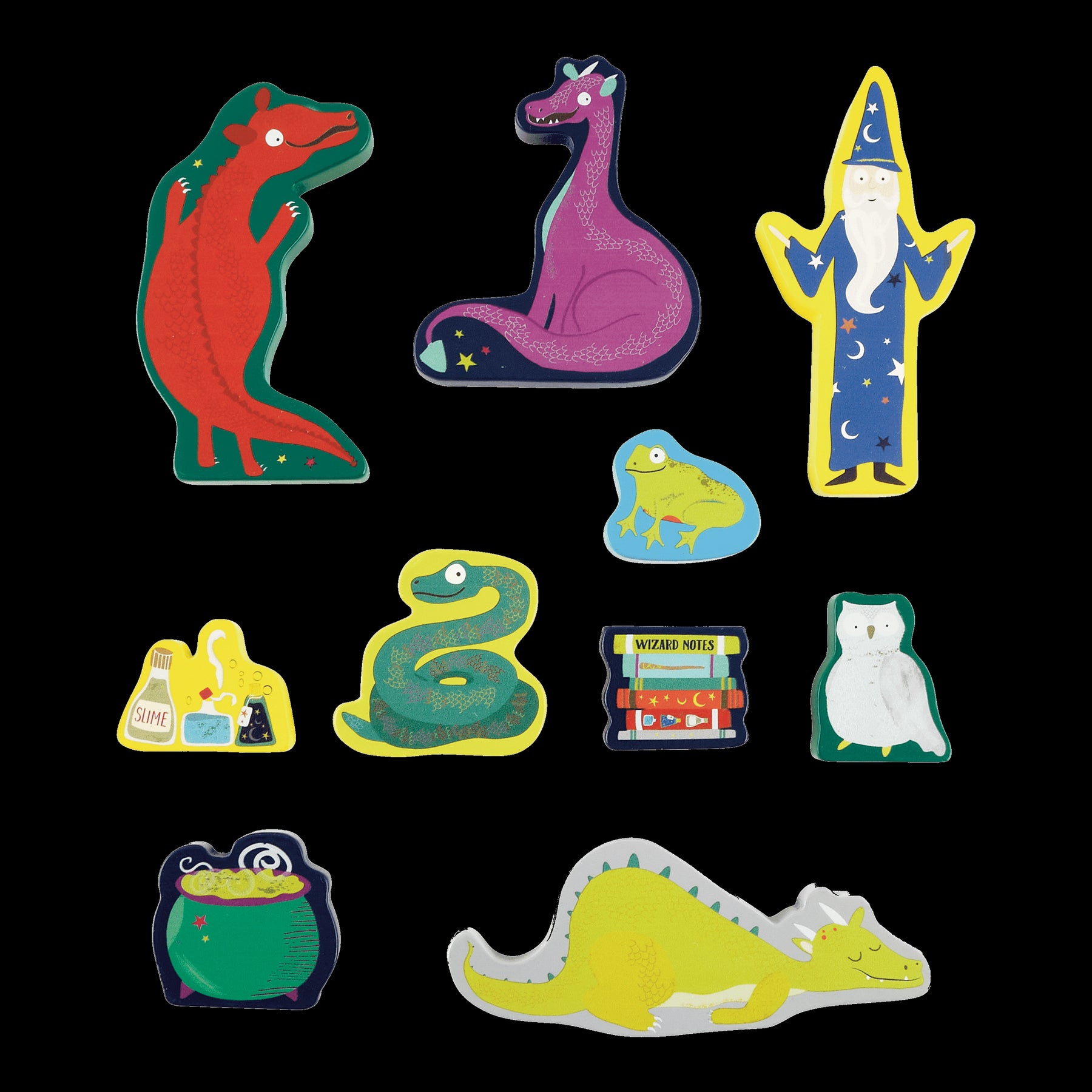 Spellbound Playbox is the smallest of the 4 designs. Featuring brand new graphics including playful dragons, wonderful wizards and spell casting magic. There are 10 painted double sided wooden pieces to play with including Wizards, Frogs, Potions and Dragons. Play hide and seek with the fun cut windows and doors. A handy storage bag including to hold all the pieces and there’s a carry handle to make it easy to carry too. Wonderful for imaginary play creating hours of fun.