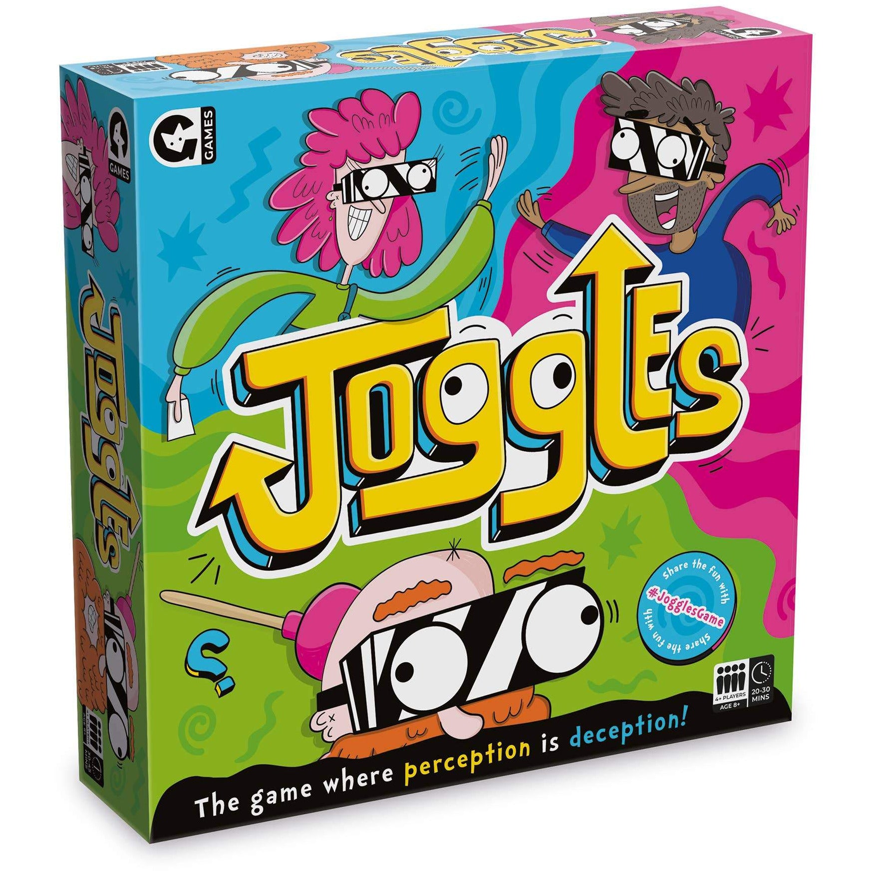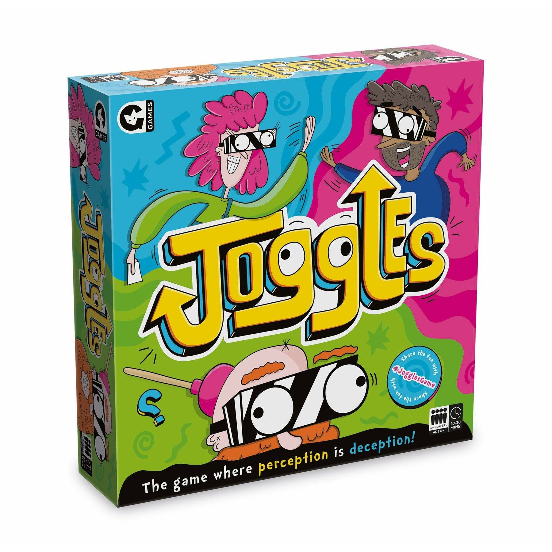 The hilarious party game where perception is deception. Put on the vision-altering Joggles and race to complete a series of tasks with your teammate. Throw the ball to each other, high-5 someone, write your name...easy peasy, right? Not in Joggles! Watch the chaos unfold as you're left wondering which way is which! Players: 2-6 Age: 8+ Contents: 2 pairs of Joggles, 64 cards, 4 coasters, ball
