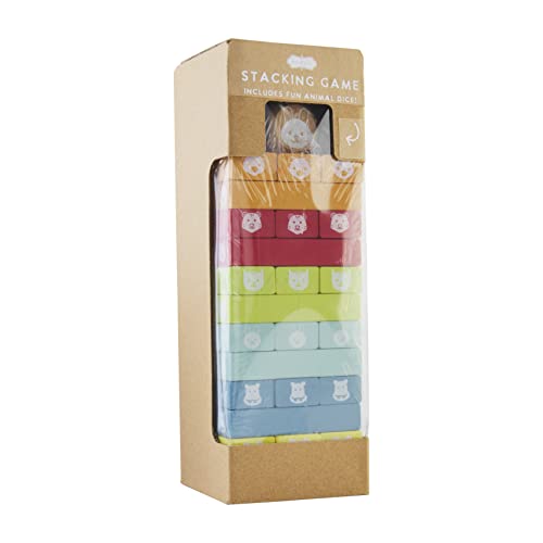 Wooden stacking block balance game. To play, roll the dice and remove any block that matches the animal on the die. Careful not to let the tower fall!