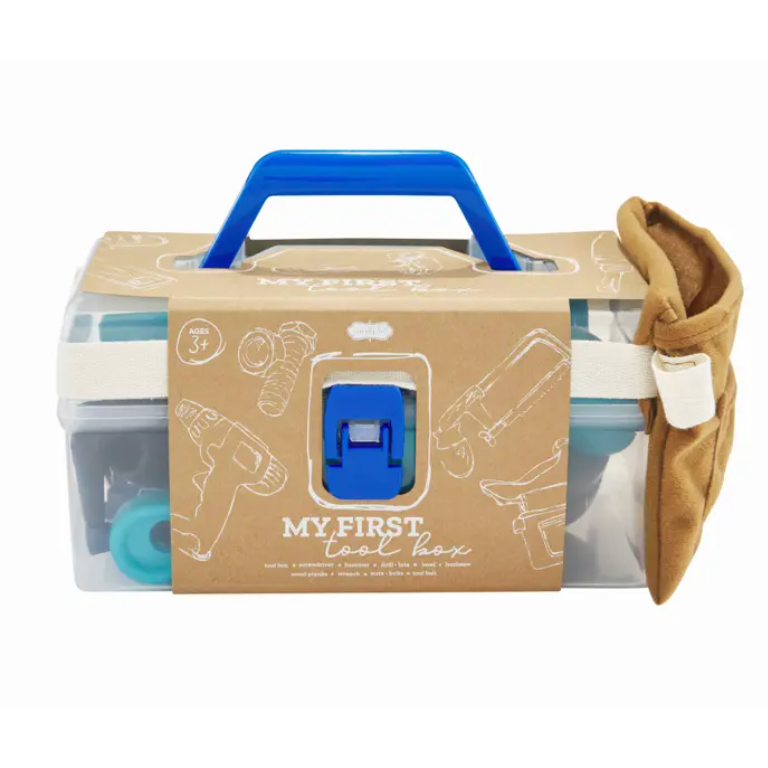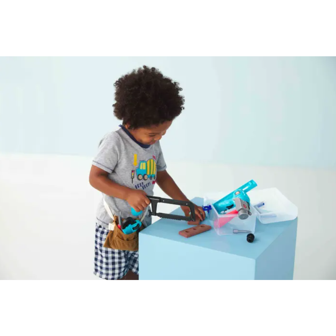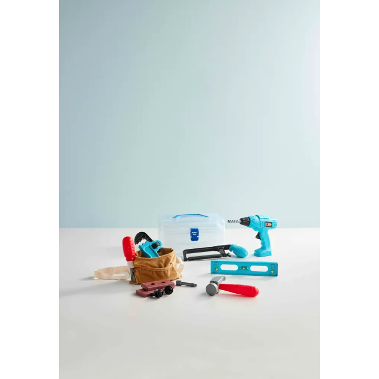 10-piece plastic play set includes: tool box, wearable tool belt, screwdriver, hammer, drill + bits with noise, level, hacksaw, wood planks, wrench and working nuts and bolts. Ages 3+.