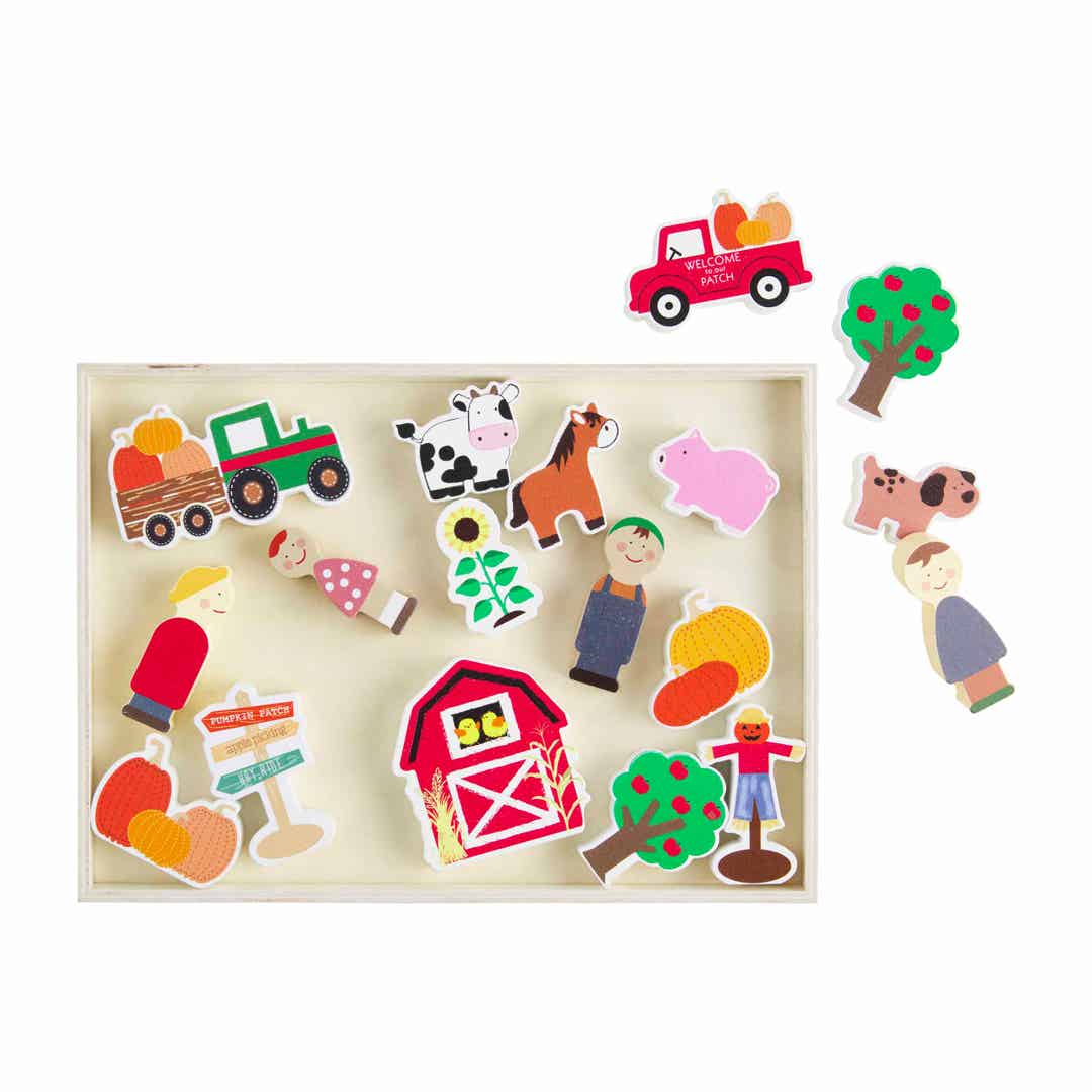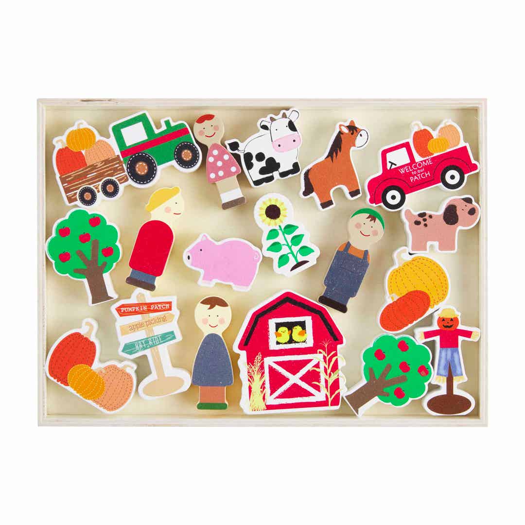 Get ready for all the pumpkin themed activities with our Pumpkin Patch Toy Set. The 18 piece set comes with chunky wood pumpkin patch figurines, including pumpkins, tractors, trees and even a scarecrow. This set is intended for children ages 3 and up. Set arrives in wood crate.