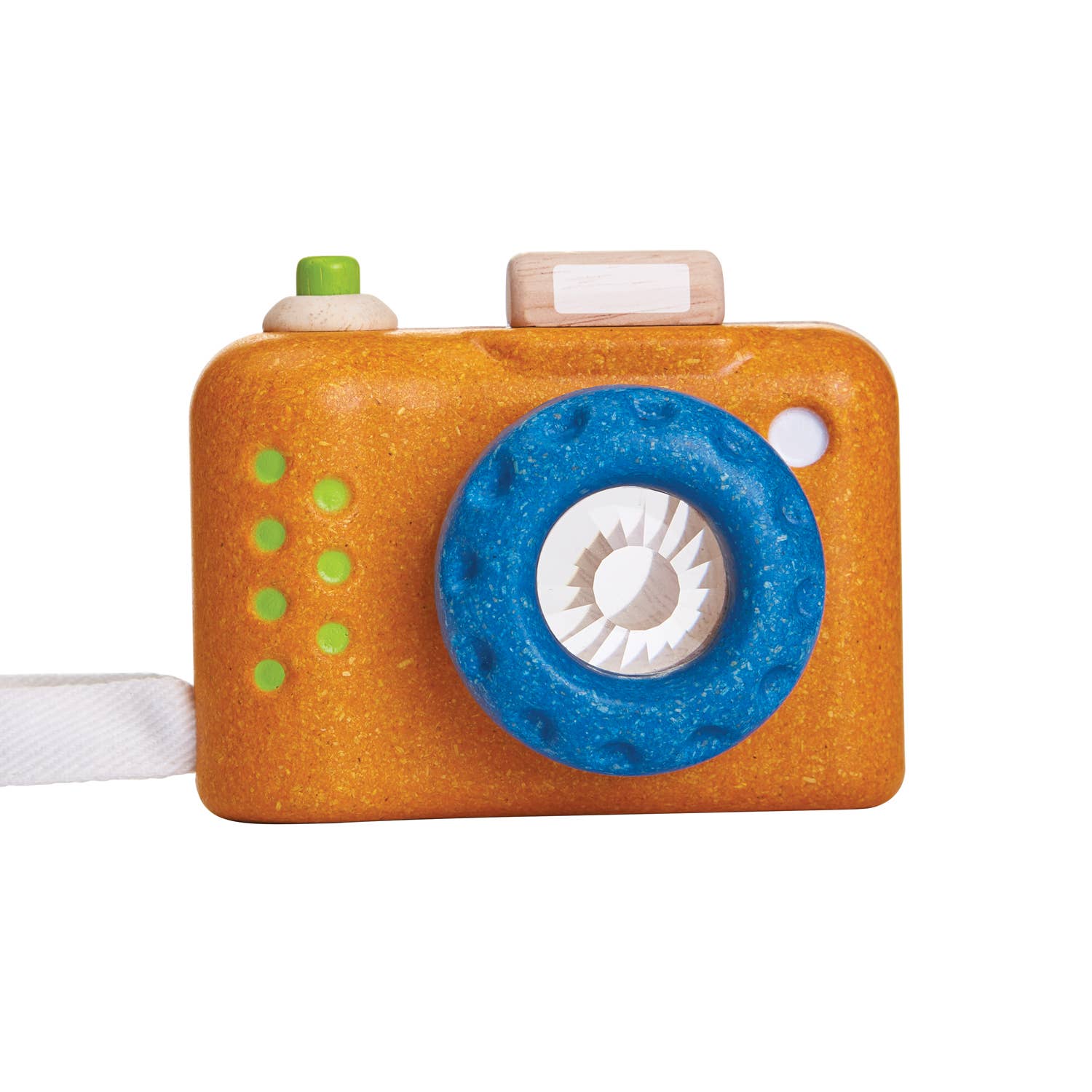 ROLE PLAY: WIth a clickable shutter button and adjustable kaleidoscope lens children can point and shoot in any direction that they choose! See the world through a unique lens both indoors and outdoors. Pretend play as a famous photographer bird watcher or part of the paparazzi! SUSTAINABLY-MADE: The My First Camera is crafted with PlanWood(TM) a PlanToys material made from surplus sawdust that results in a more flexible water-resistant wood and is pigmented with water-based and natural dyes that are free from harmful chemicals. Softened edges make the camera extra child-friendly and safe. TRIGGERS IMAGINATION: Unlock creativity and imaginative thinking by viewing the world through the kaleidoscope lens. Pretend play with the camera offers children the opportunity to storytell and make up scenarios that ultimately support their creative thought process. SUPPORTS DEVELOPMENT: Improve hand-eye coordination with a clickable shutter button and adjustable lens; enhance concentration ability while focusing on certain objects and landscapes; and develop language and social skills while adventuring around the park or house as a pretend freelance photographer. Suitable for kids 18 months and older.