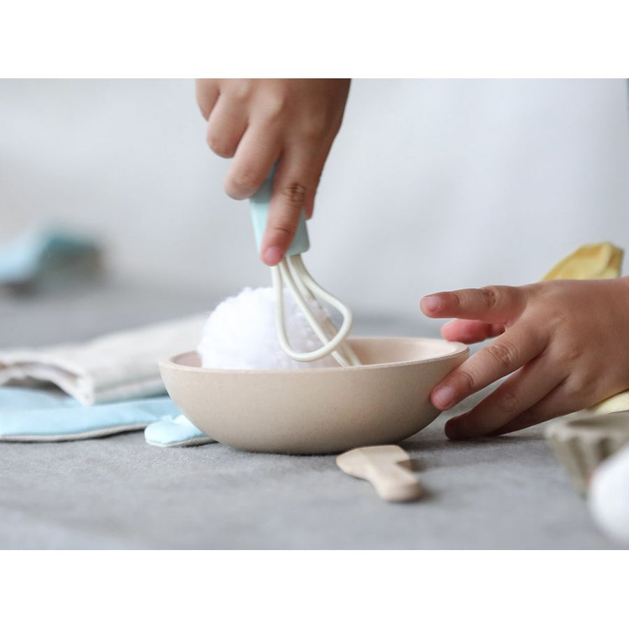 • The set comes with 1 whisk, 1 cup, 2 cupcakes, 1 baking tray, 1 spatula, 1 cream piping bag, 1 flour bag, 1 glove, and 1 flour pom pom