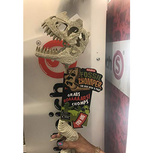 Fossil Chomper : The bite with a roar. Grabs ROAAAAAAAARS! CHOMPS Ages 5 & up Battery operate 2X1.5v included, This toy takes 2 AG 13' type batteries 9(included). To replace, unscrew cover note polarity of batteries, remove and replace with two new batteries and replace. Never let a child use this product unless battery door is secure. Batteries are small objects and could be ingested. Keep all batteries away from children.