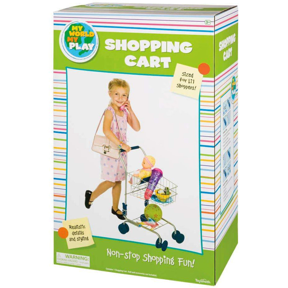 This realistic 24†tall cart features a metal frame, cushioned push handle, folding fabric seat, storage space below basket and pivoting front wheels. Cart is easy to assemble for play; easy to fold for storage. Toys not included. 3yr+
