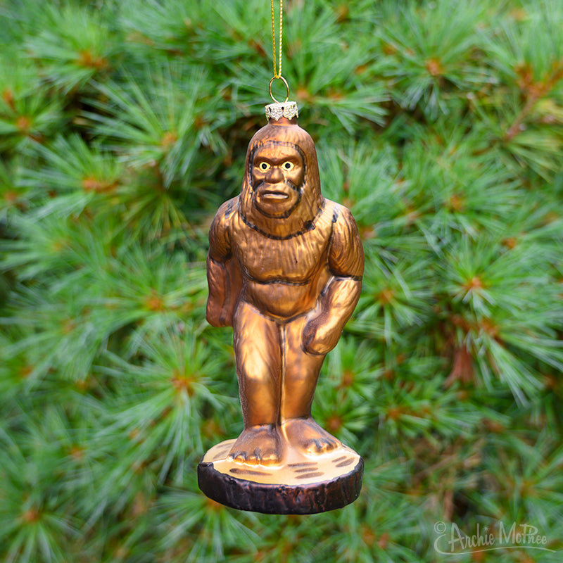 Hide this 5-1/4" (13.3 cm) tall hand-blown glass Bigfoot Ornament on your tree and your whole family becomes Bigfoot hunters. Beautifully sculpted to look like everyone’s favorite hairy forest dweller, this Bigfoot ornament includes a string for hanging, but can also stand on its own. Perfect for all Bigfoot fans! Illustrated acetate tube.