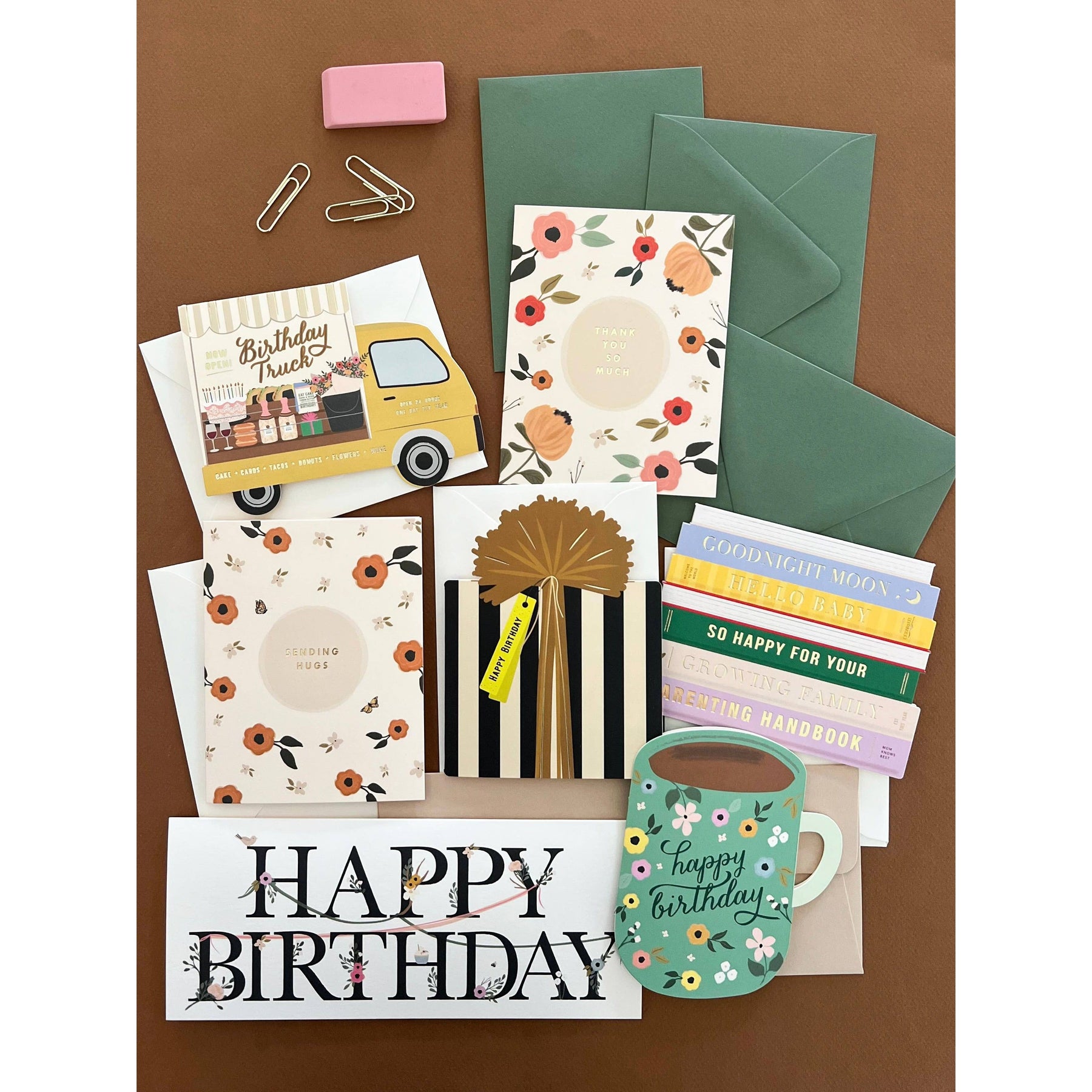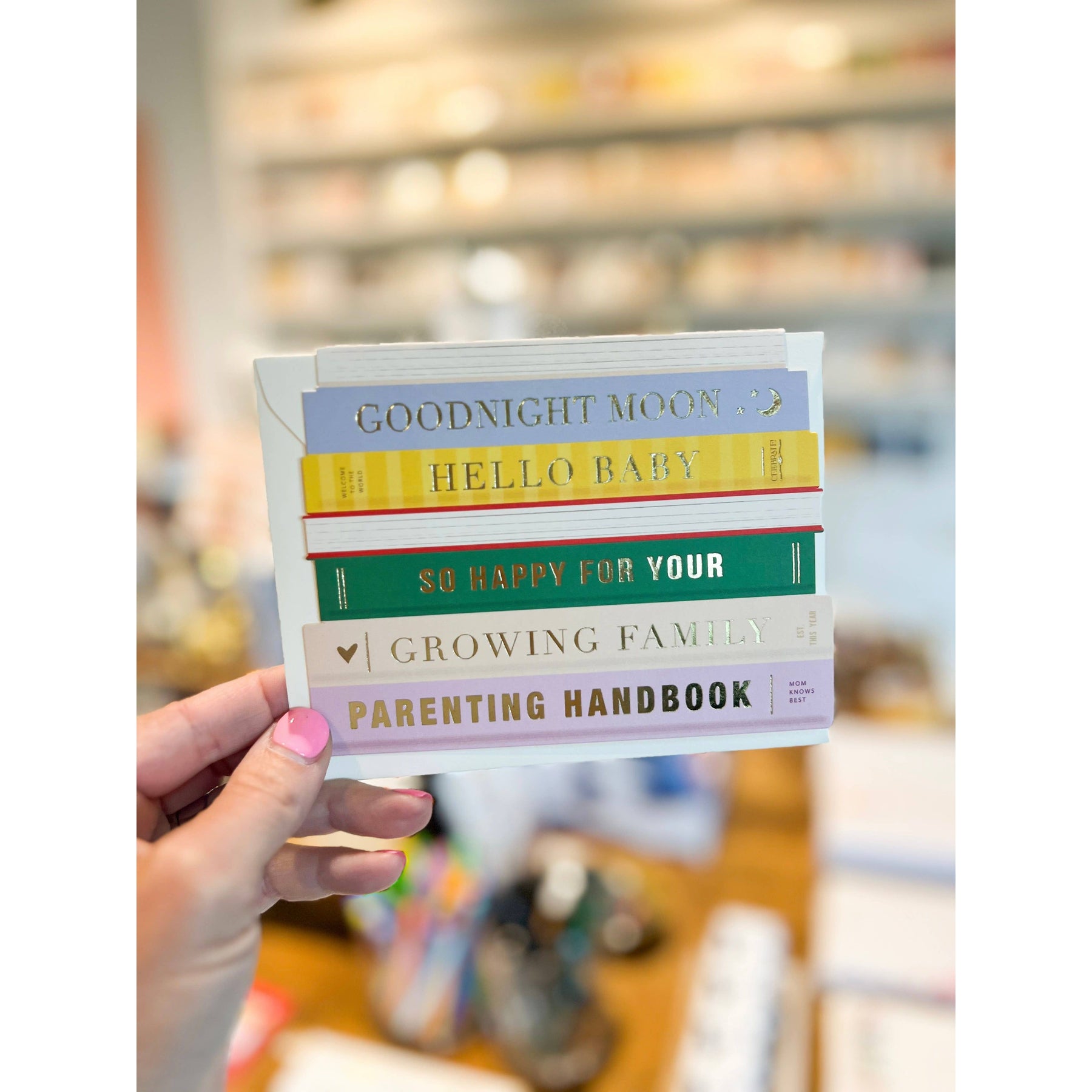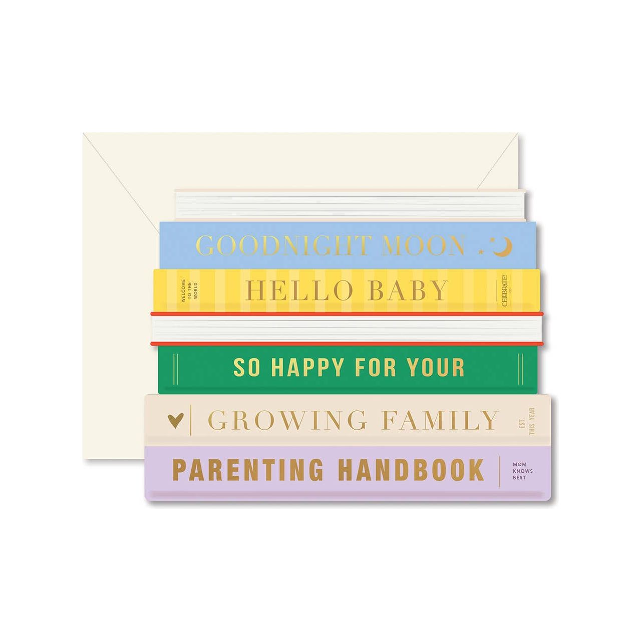 The cutest stack to celebrate a new baby! Creative die-cut with gold foil accents 4.25 x 5.5 folded card, blank interior Our greeting cards come individually packaged in a plastic sleeve.