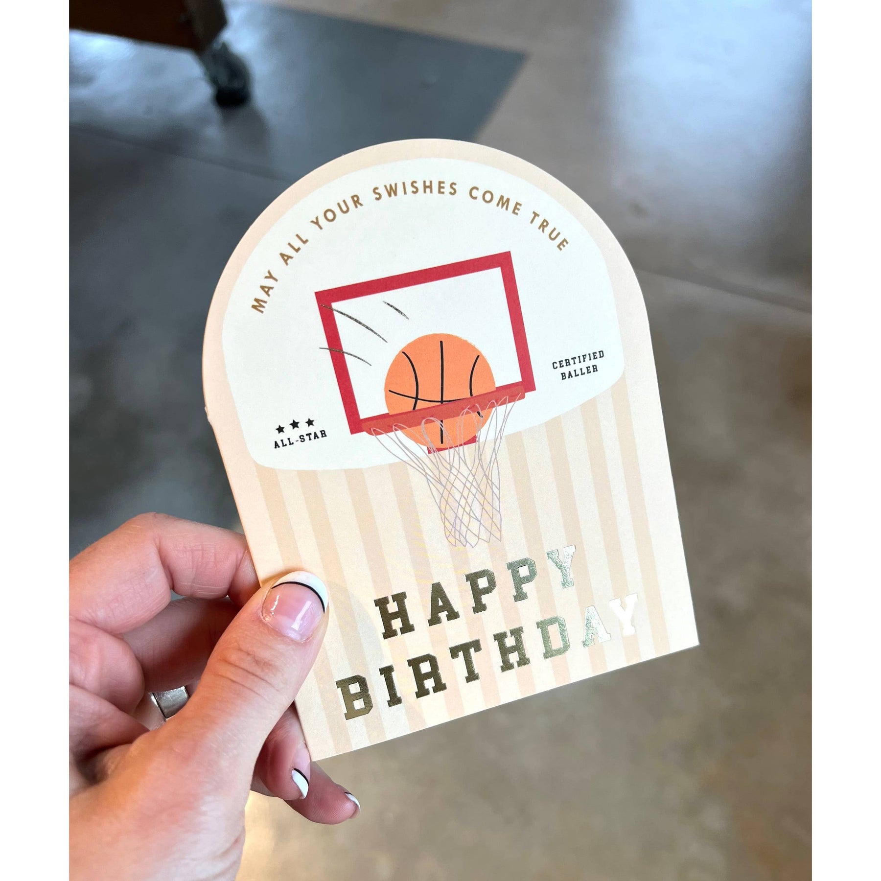 A fun birthday card for the baller in your life with full color and gold foil, ivory matte envelope. 4.25" x 5.5" arch die-cut folded card. Blank interior. Our greeting cards come individually packaged in a plastic sleeve.