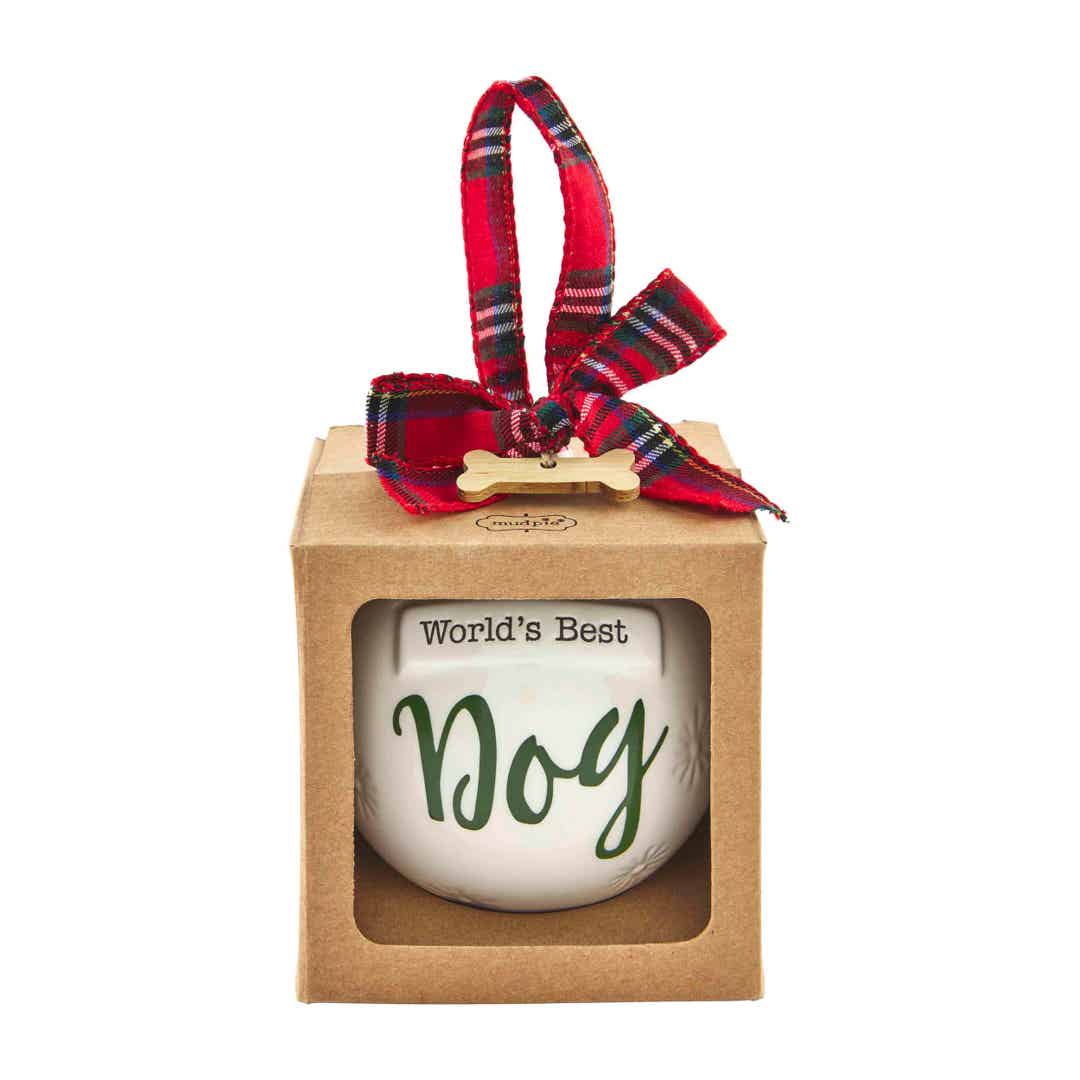 Celebrate the world's best dog with our Best Dog Ornament. The ceramic sentiment ornament features a tartan hanger. The ornament features the sentiment "World's Best Dog". The ornament also has a wood accent charm. The ornament arrives in a box, made for gifting.