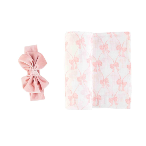 2-piece set. Muslin swaddle blanket. Comes with soft bow headband.