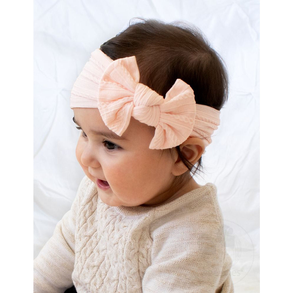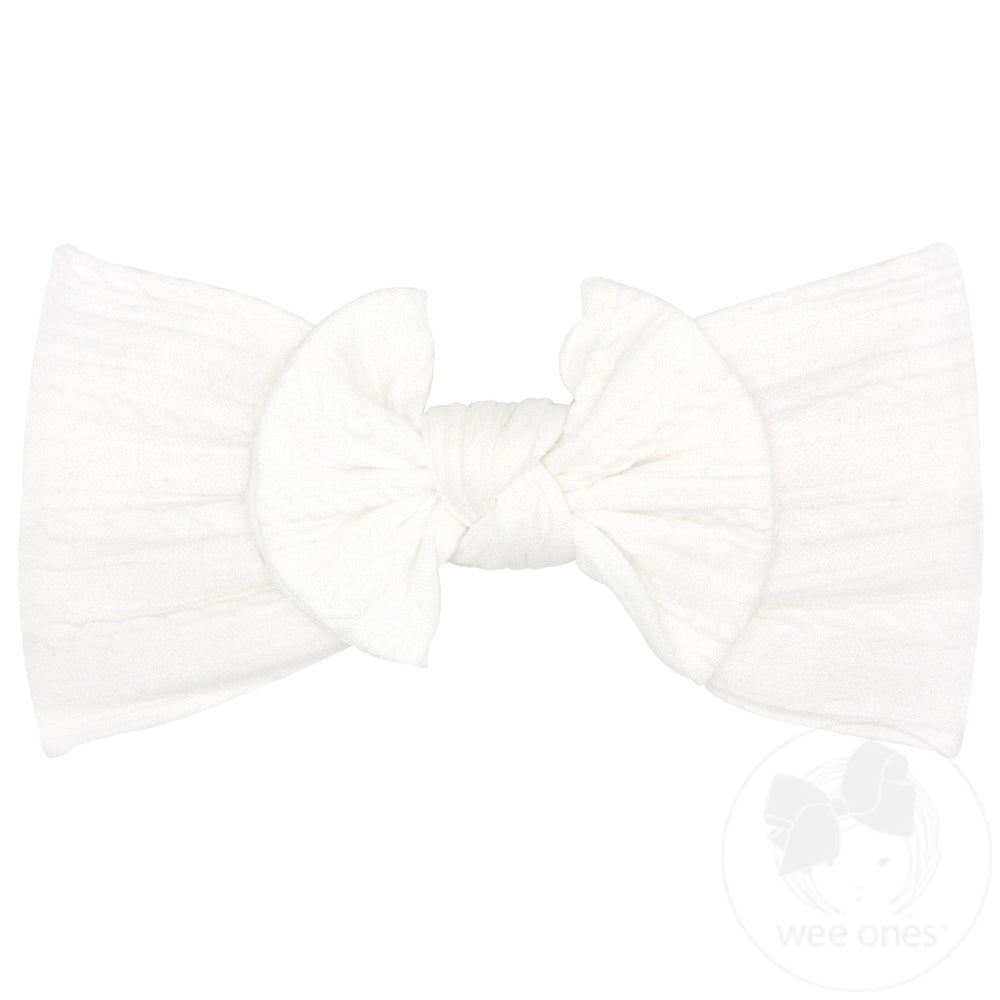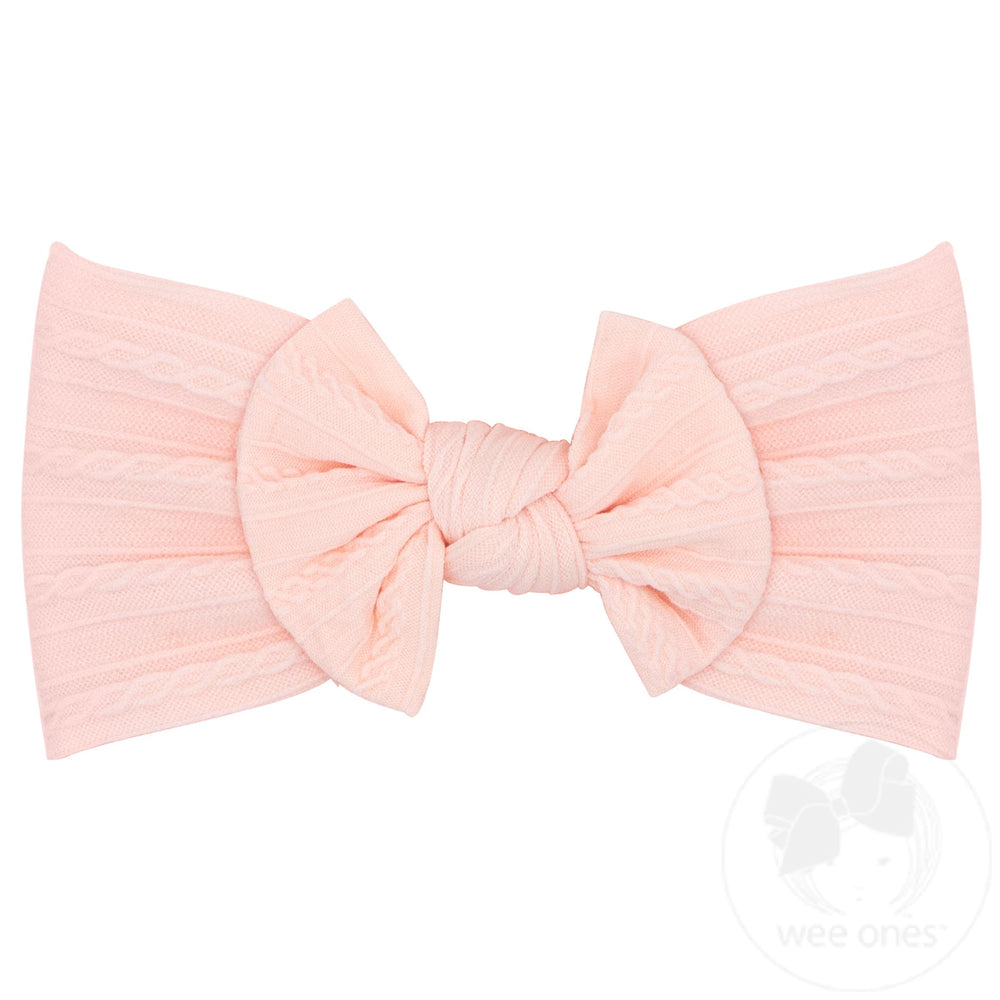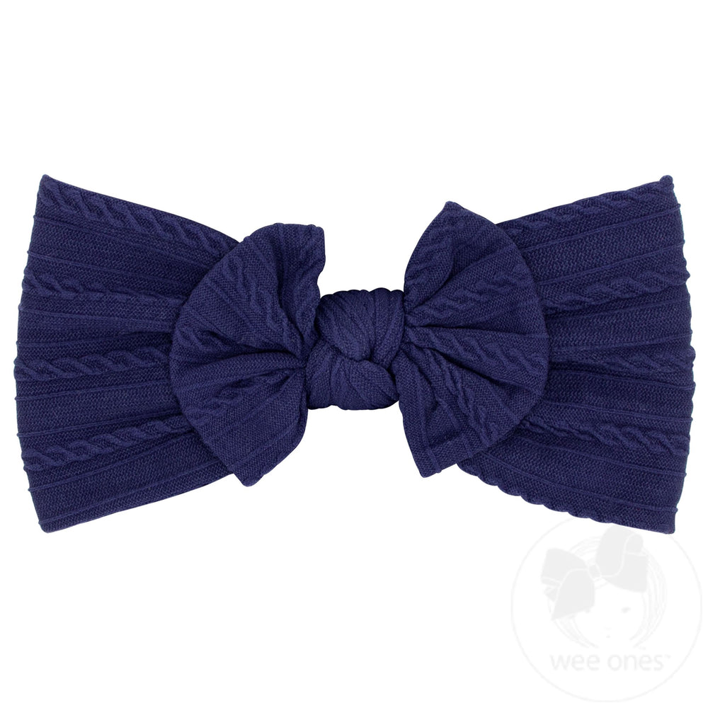 Soft cable knit nylon headband for infant and toddler girls with matching 4" bowtie. Band is 2 3/4" wide. One size fits 3 months and up.