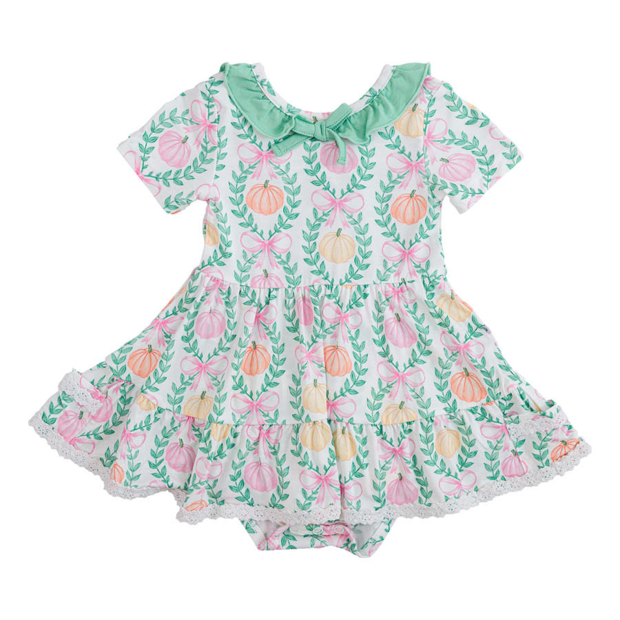 Made for the tiniest pumpkins in the patch! This darling infant dress features a pastel pumpkin print with delicate bow details, bringing all the charm of autumn in one perfect twirl. Crafted from our signature bamboo blend for softness and stretch, it includes an easy snap closure for quick diaper changes and all-day comfort. A must-have for fall photo ops, festive outings, or simply twirling into the season.