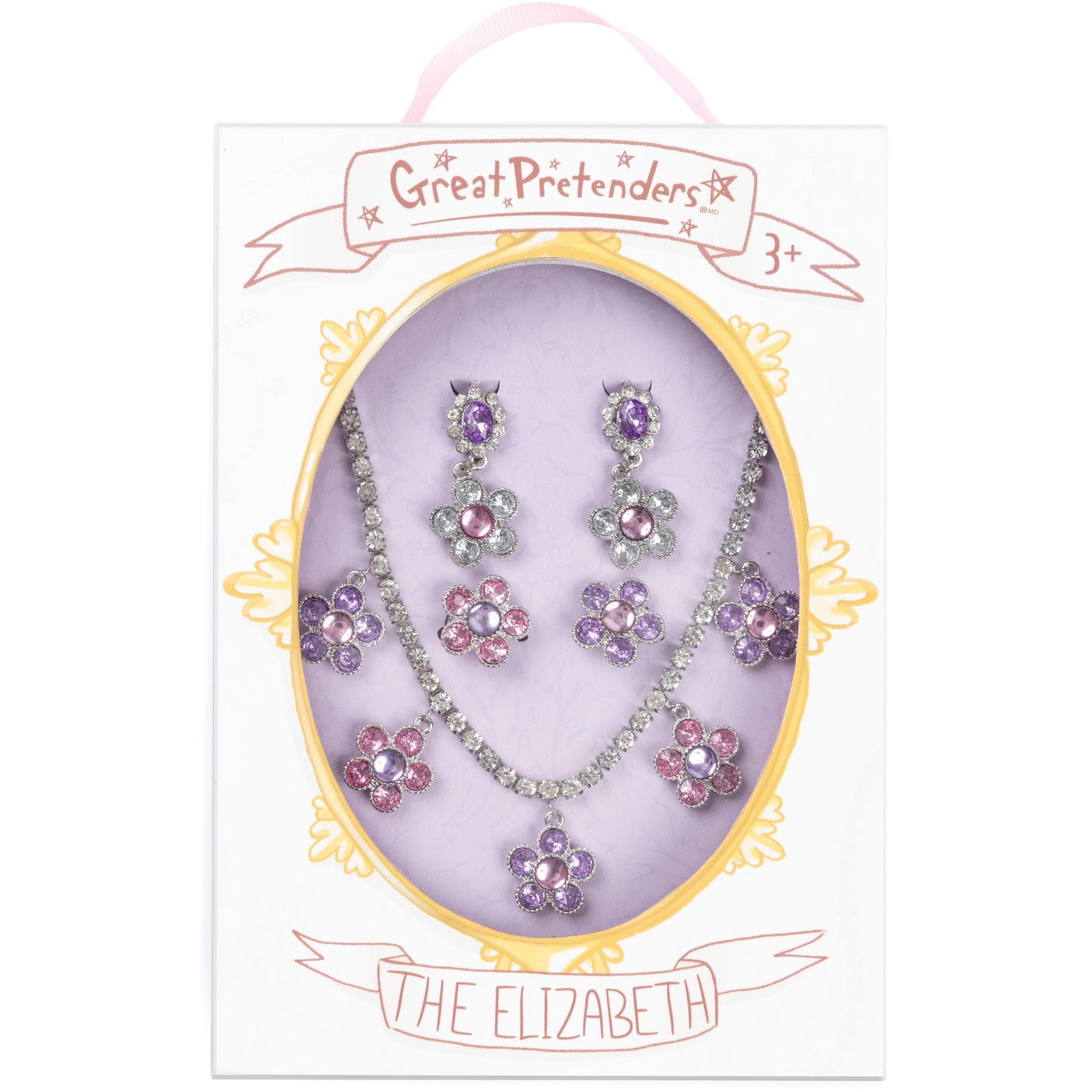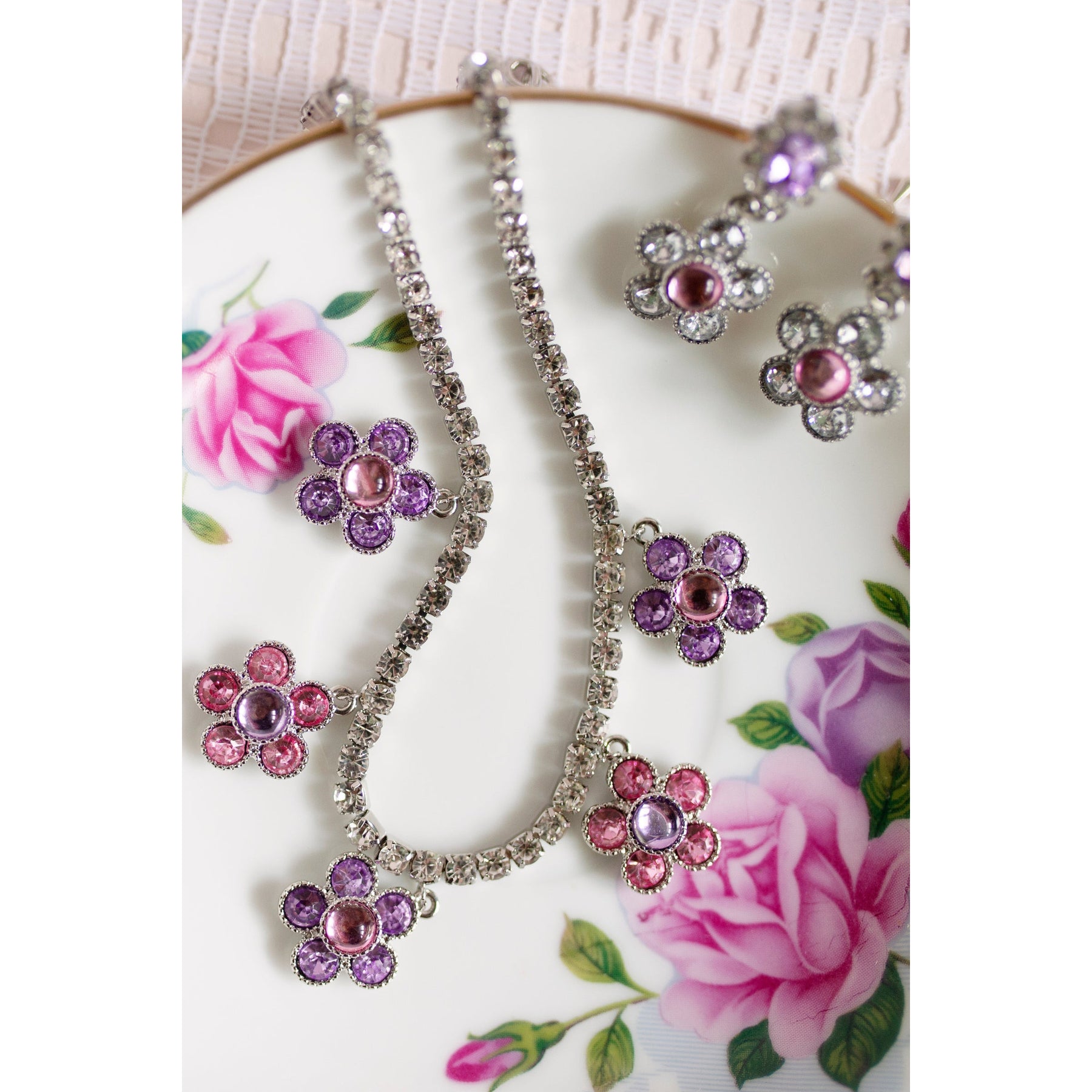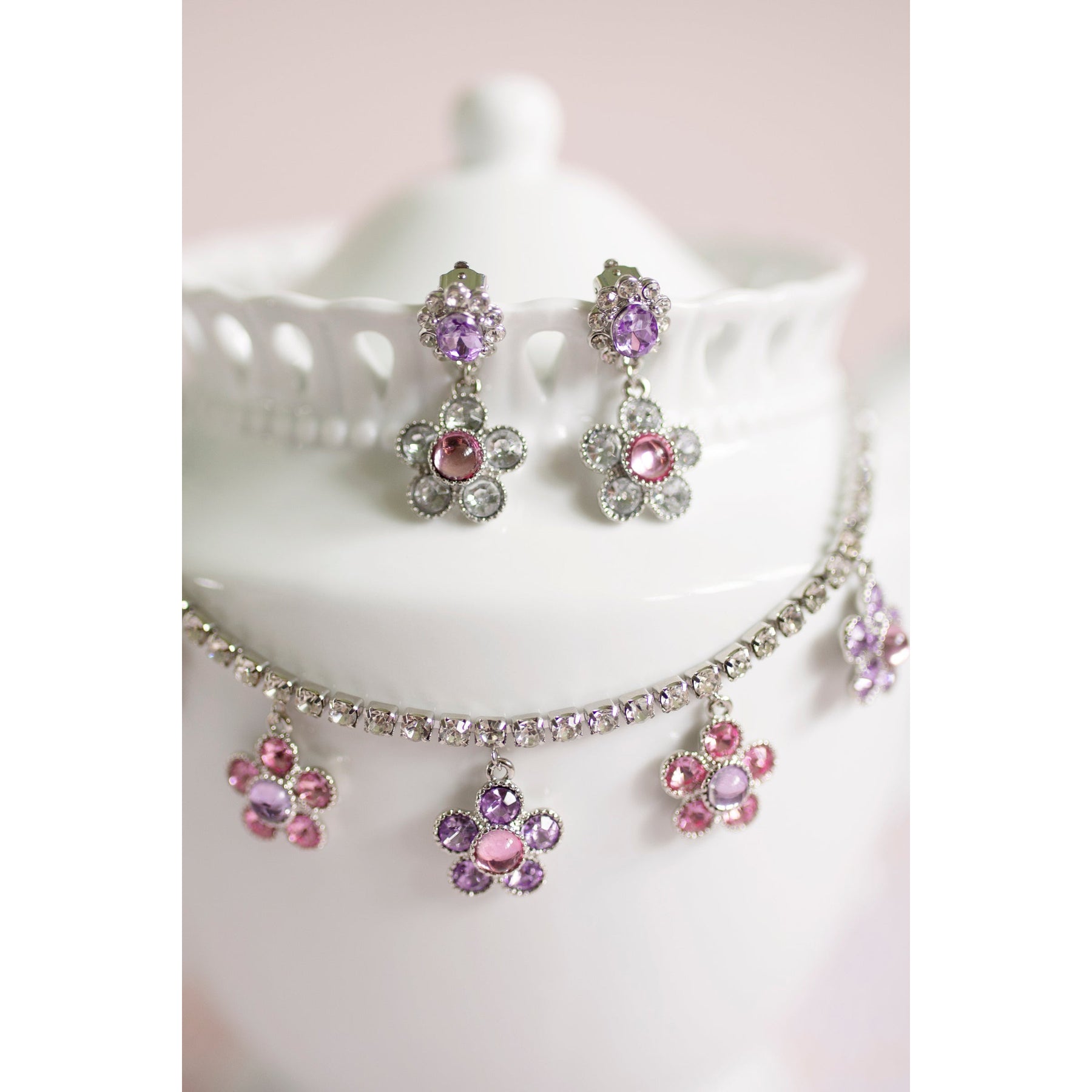 Sweet meets sophistication in The Audrey 5-piece jewellery set. This elegant boxed set includes two rings, a pair of clip-on earrings, and a matching necklace, all accented by floral-shaped charms and studded with soft pink, diamond, and lilac coloured gems.