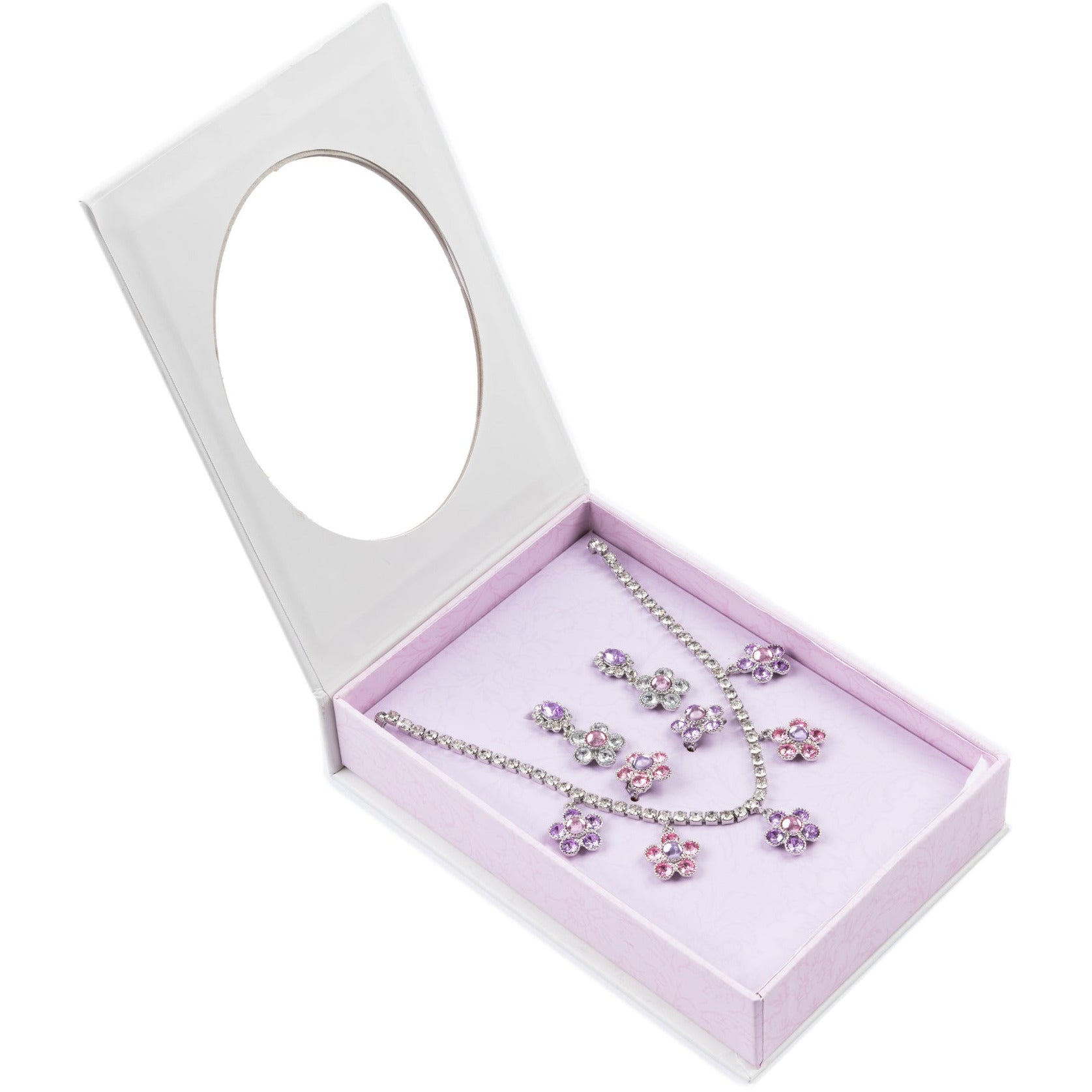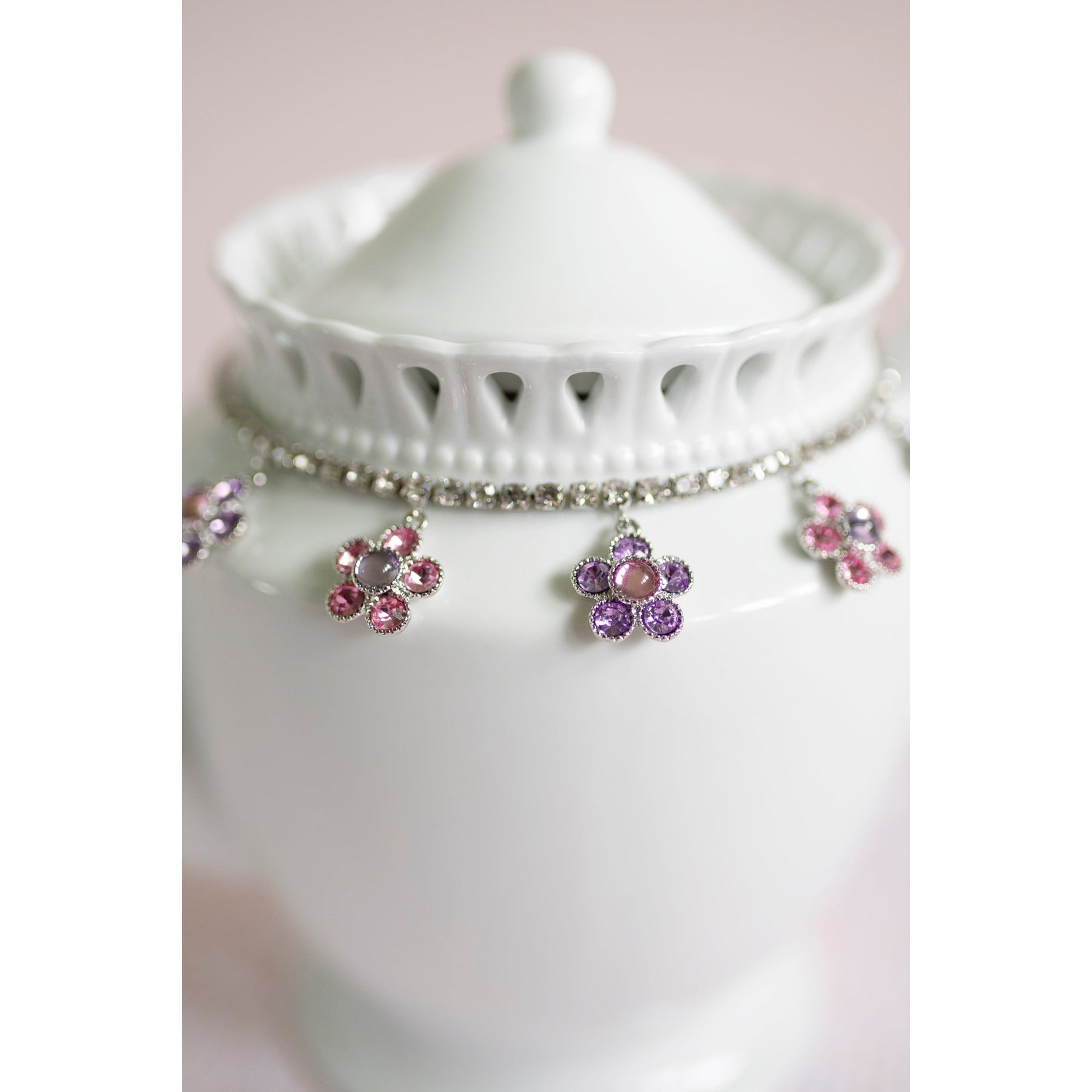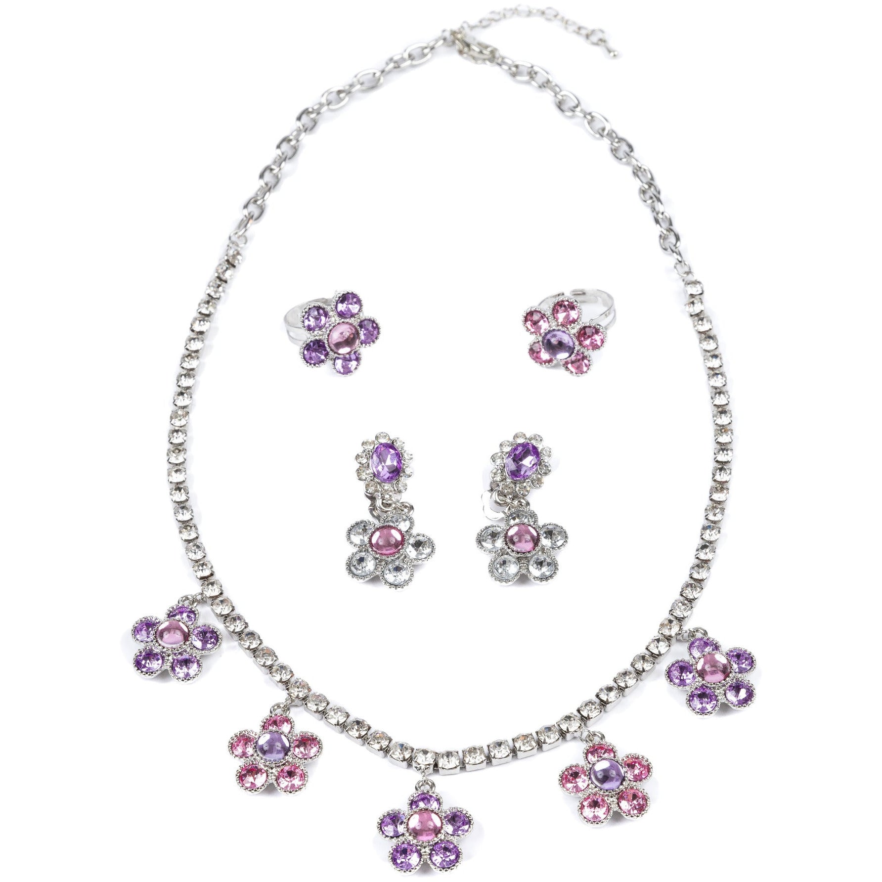 Sweet meets sophistication in The Audrey 5-piece jewellery set. This elegant boxed set includes two rings, a pair of clip-on earrings, and a matching necklace, all accented by floral-shaped charms and studded with soft pink, diamond, and lilac coloured gems.