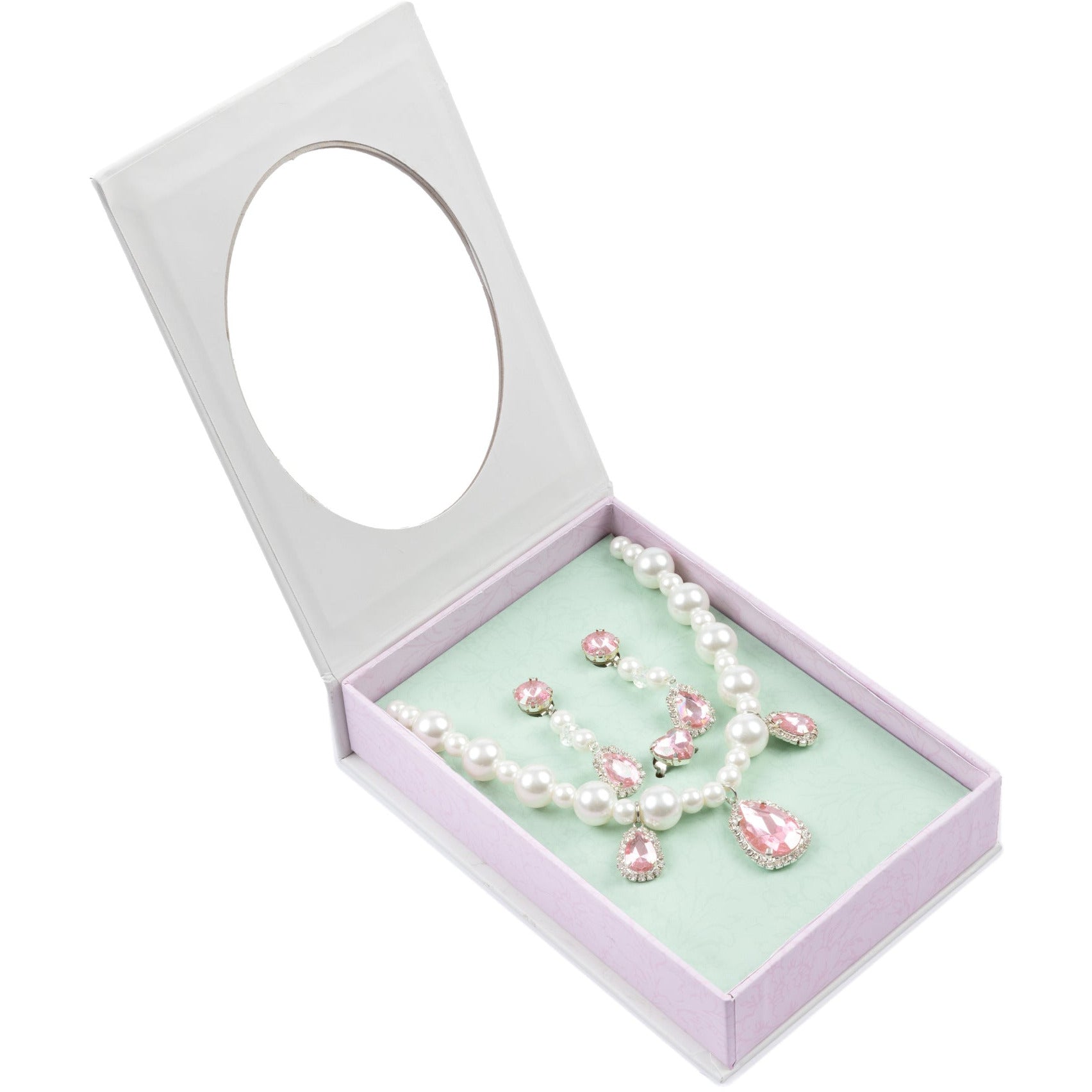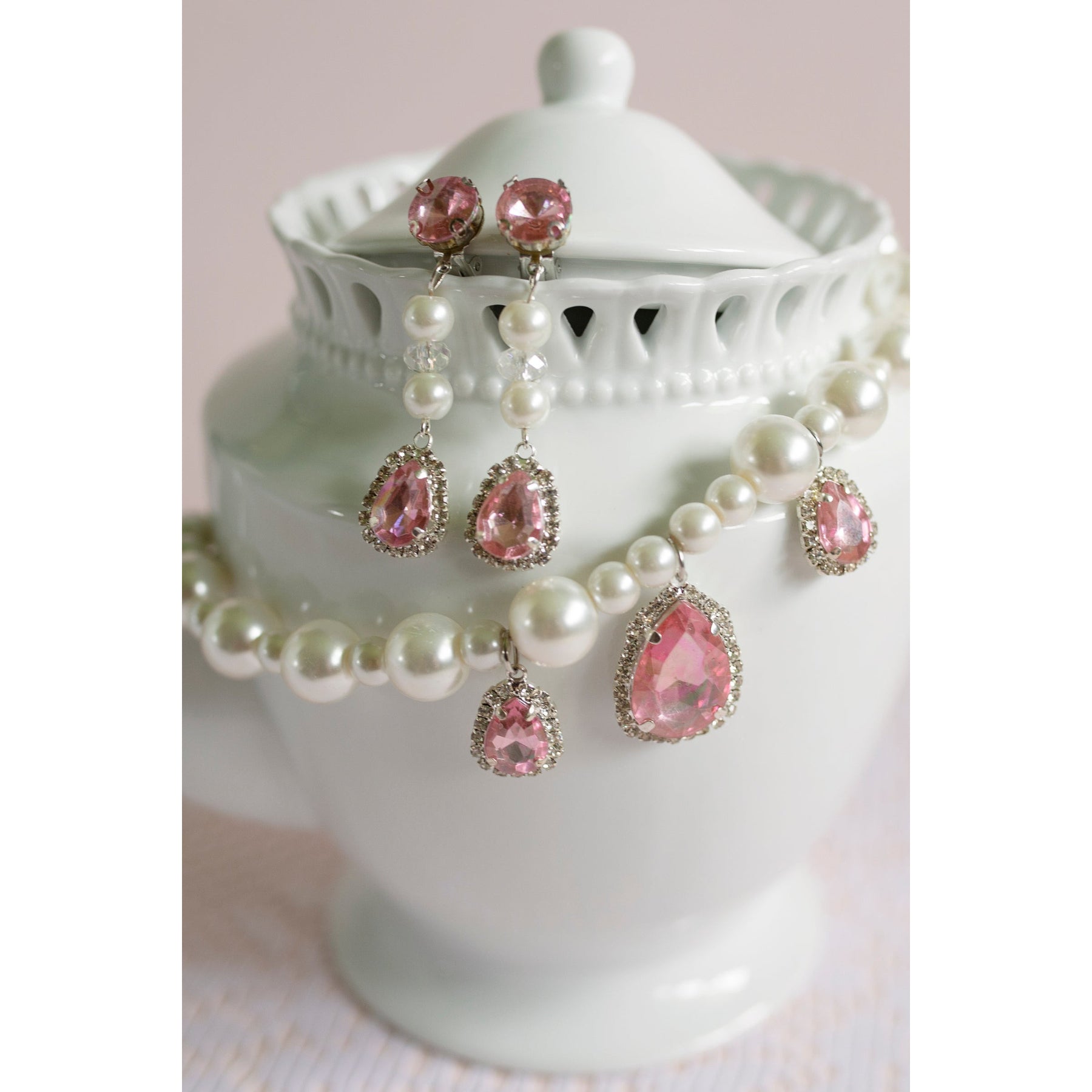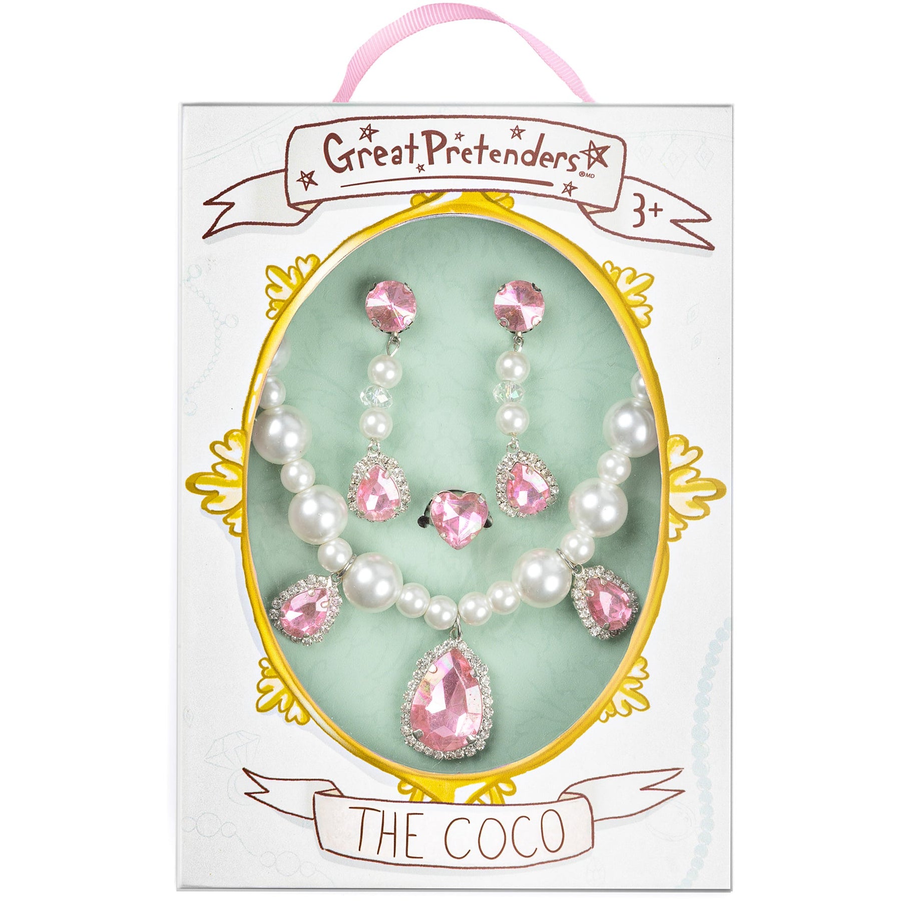 Bold pink gems pair with soft and elegant pearls in The Coco 4-piece jewelry set. This beautiful boxed-set includes dangly clip-on earrings, a heart-shaped ring, and a coordinating pearl necklace with jeweled tear-drop charms.