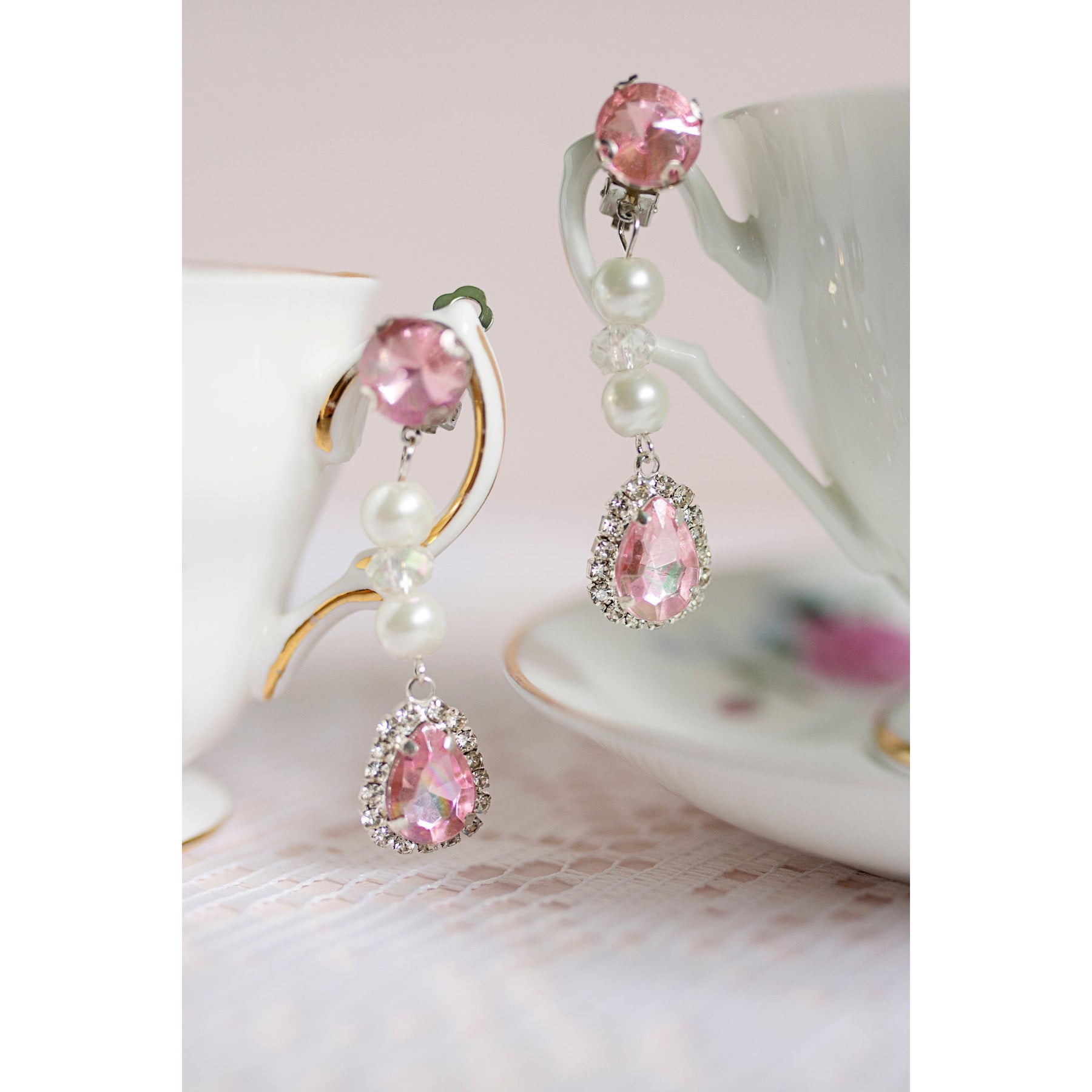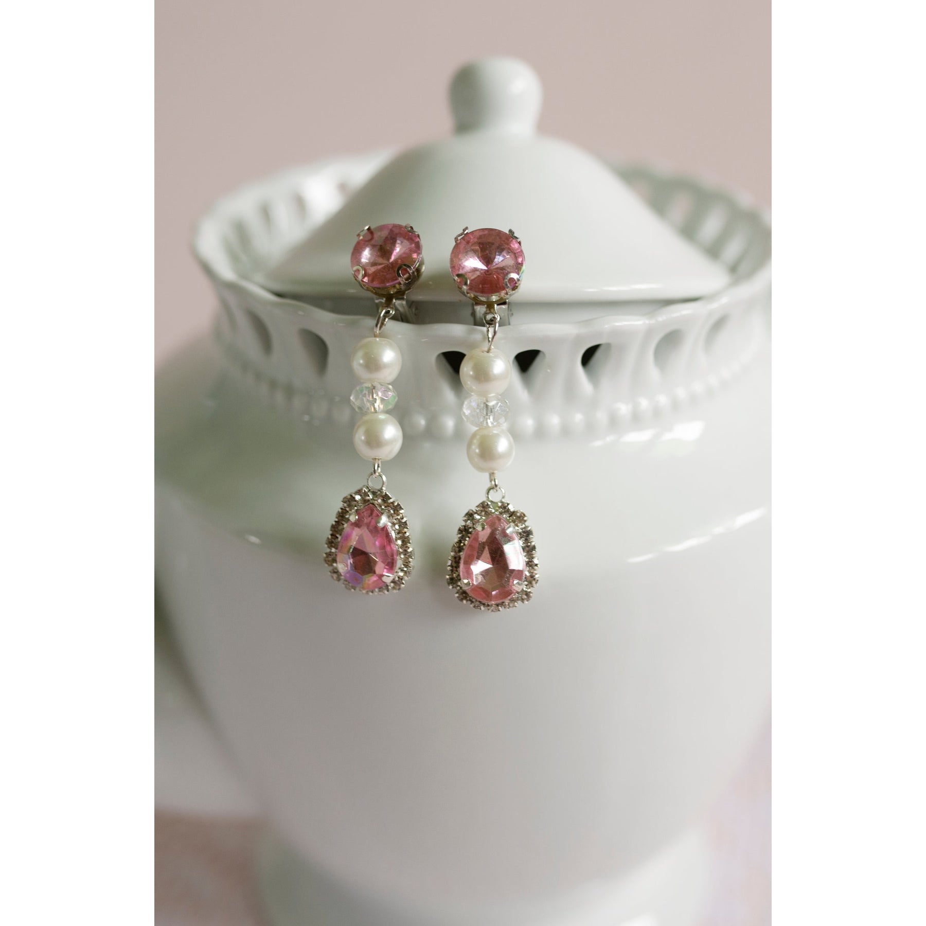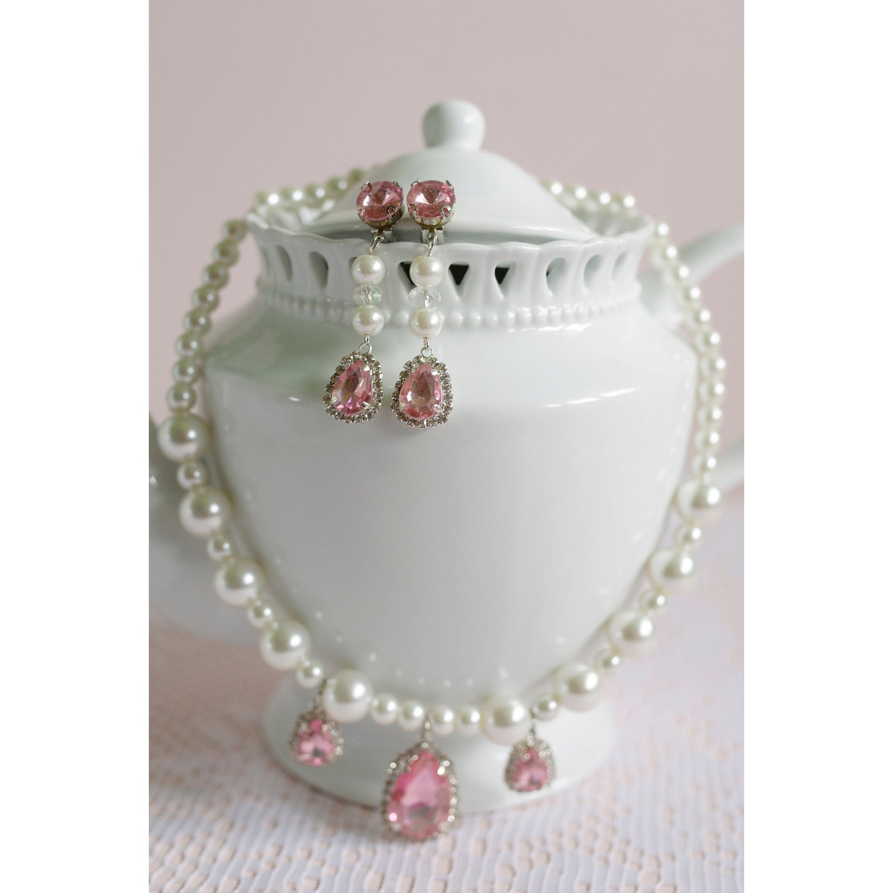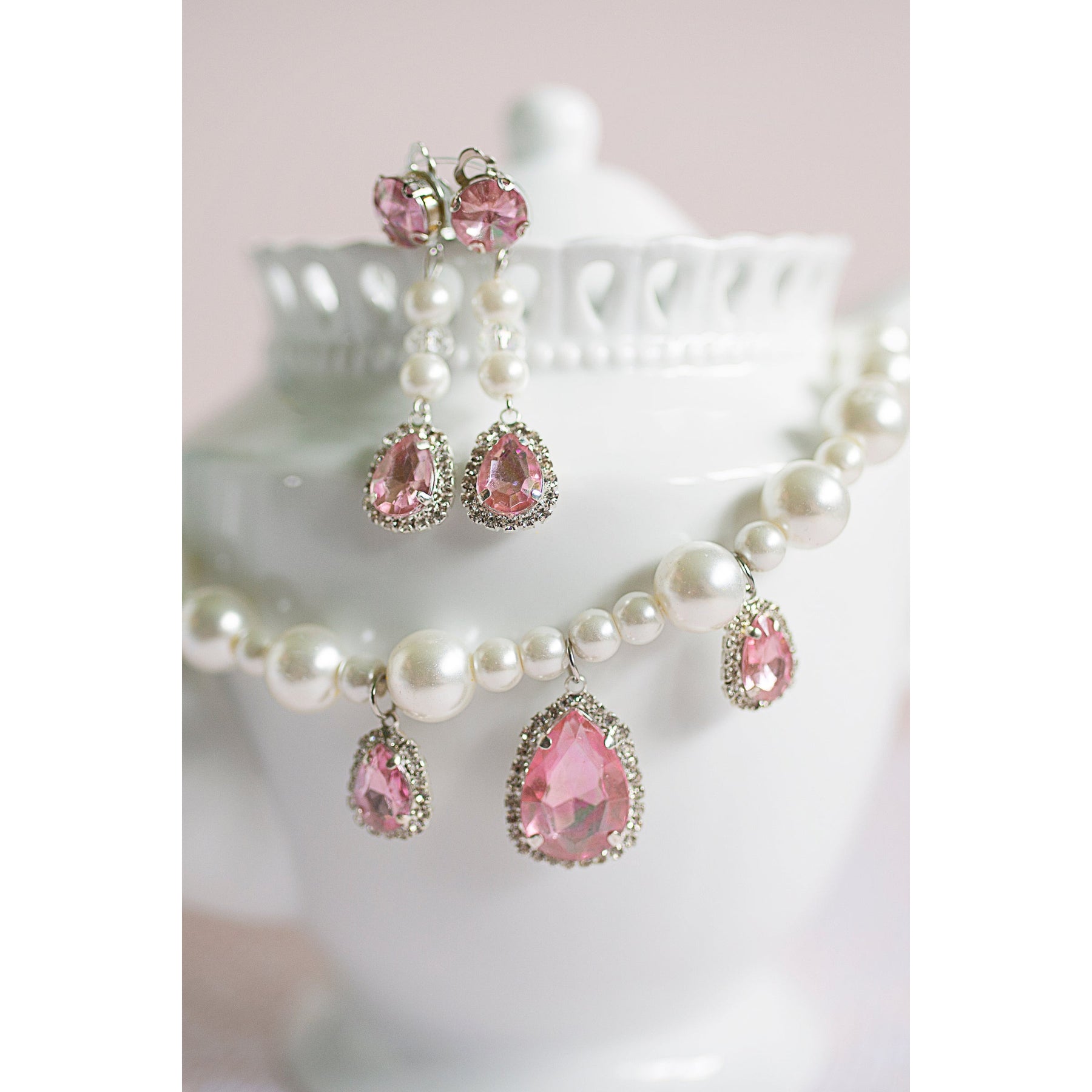 Bold pink gems pair with soft and elegant pearls in The Coco 4-piece jewelry set. This beautiful boxed-set includes dangly clip-on earrings, a heart-shaped ring, and a coordinating pearl necklace with jeweled tear-drop charms.