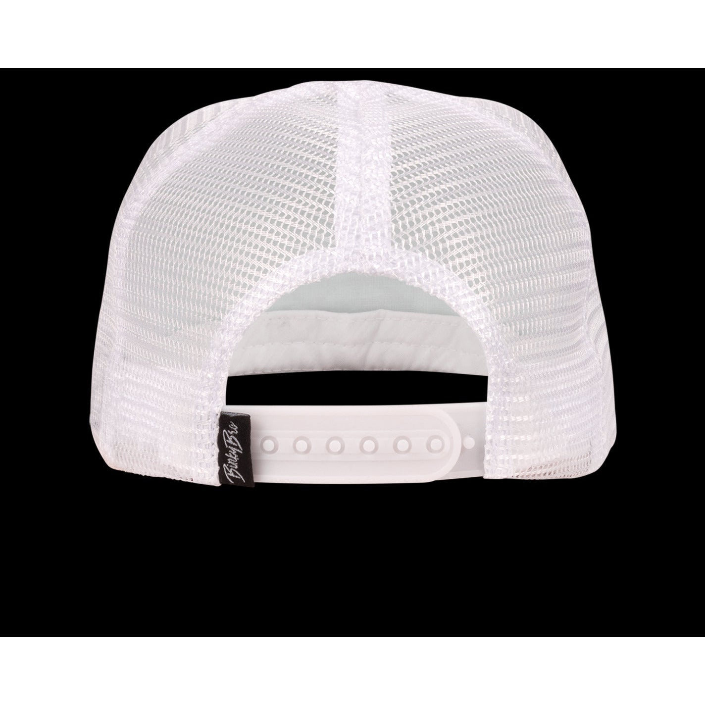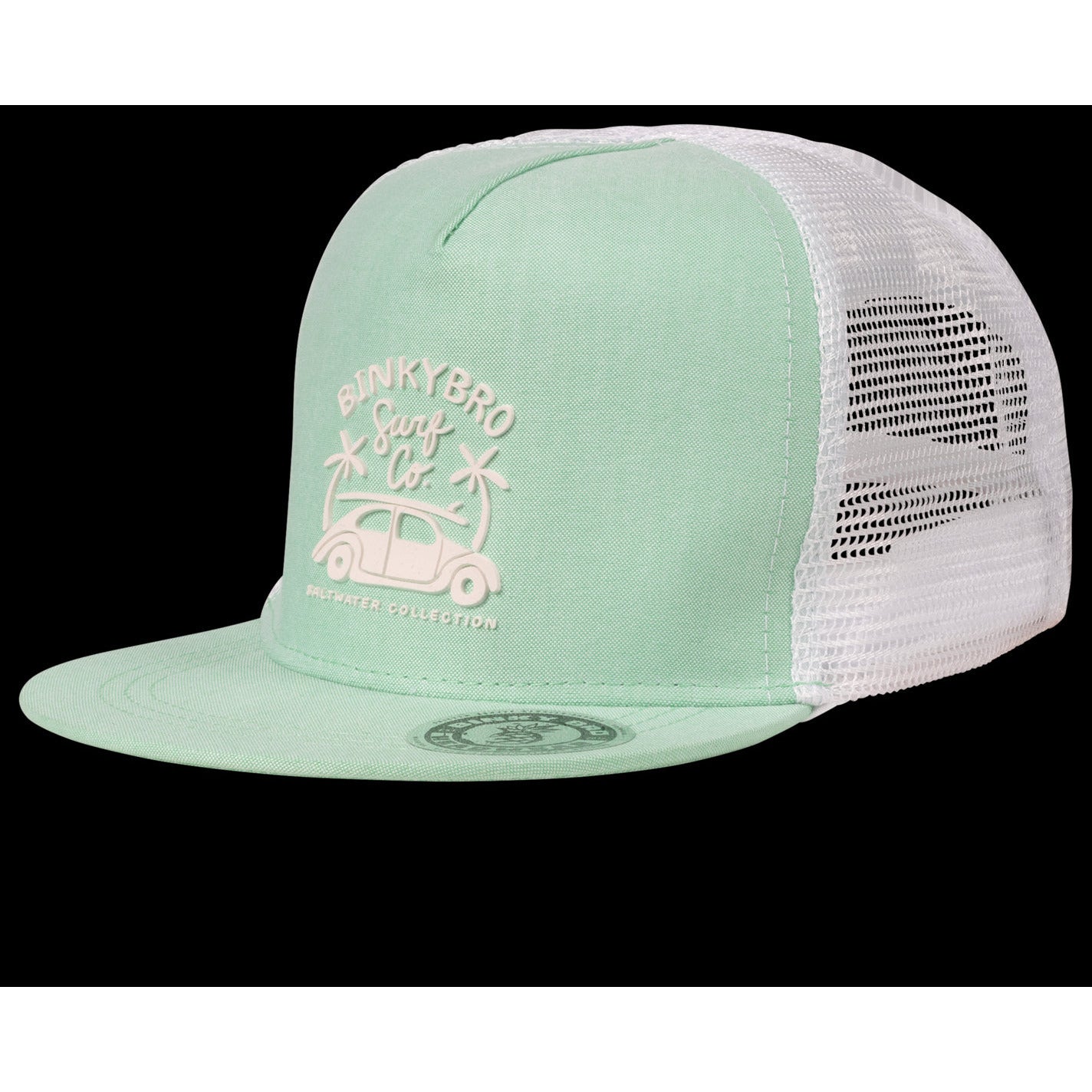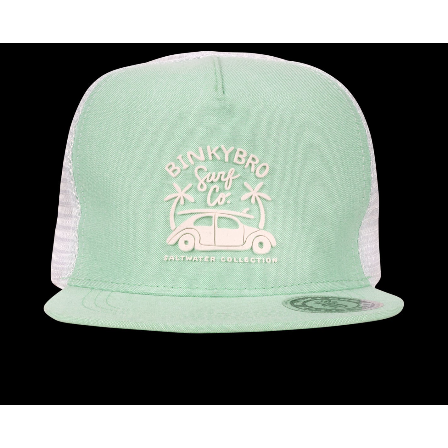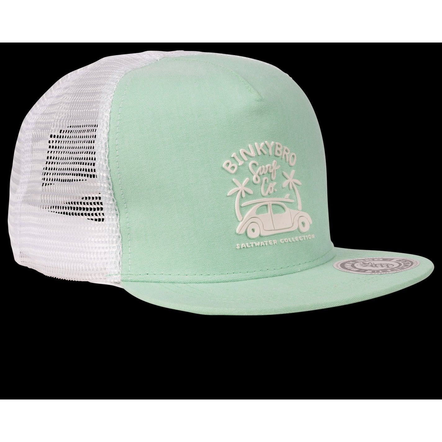 The Cabrillo Snapback has a white retro BinkyBro logo on front, light green/teal paneling on the front, and white mesh paneling on back.