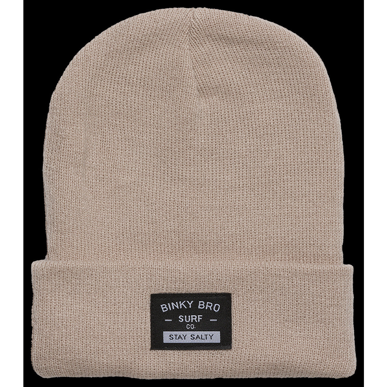 Our Beige Jackson Hole beanie is 100% acrylic. It has a "BinkyBro Surf Co" embroidered patch on the front. Sizes are currently available in newborn, infant, toddler, youth, and adult.