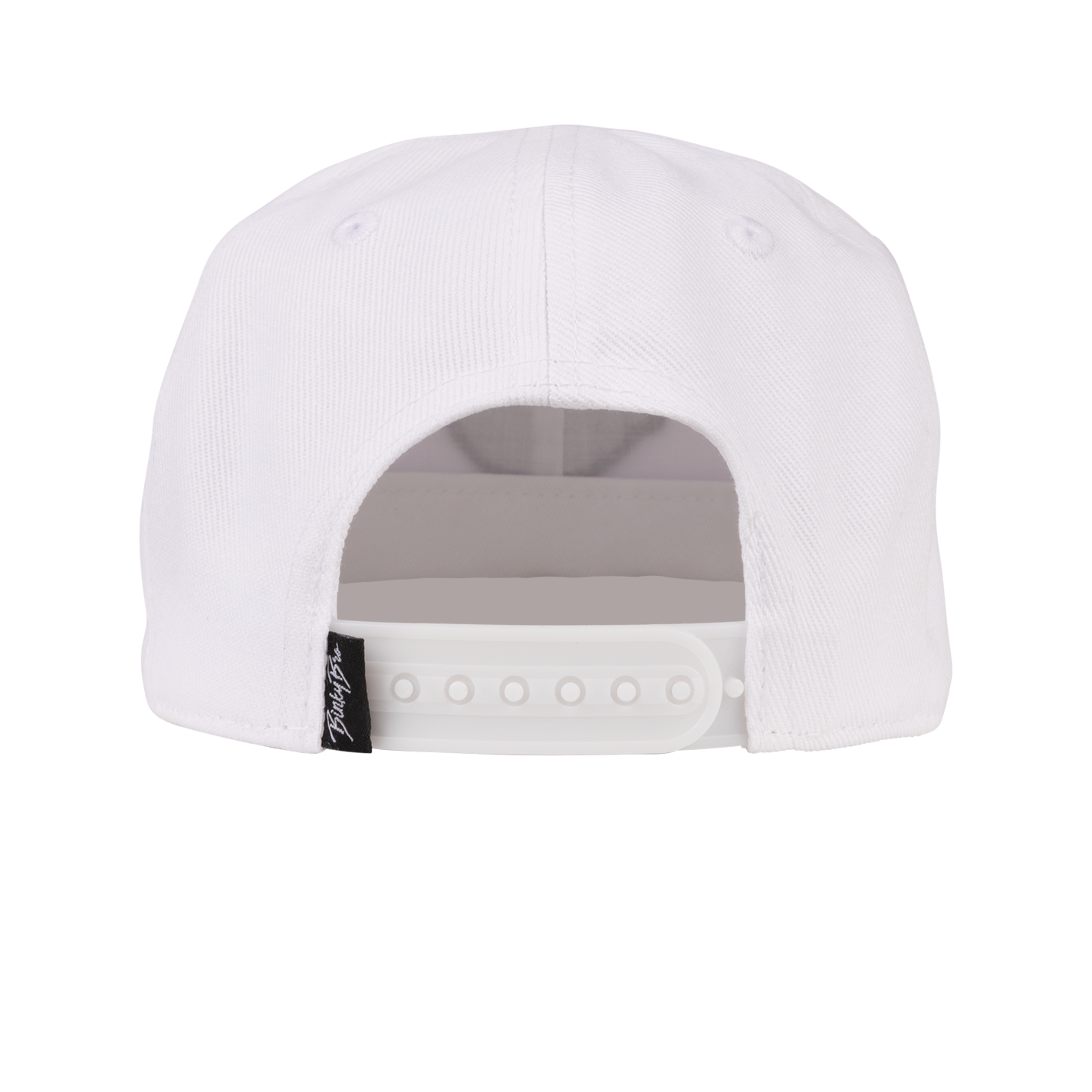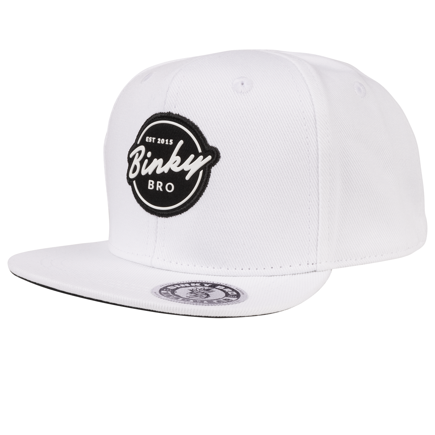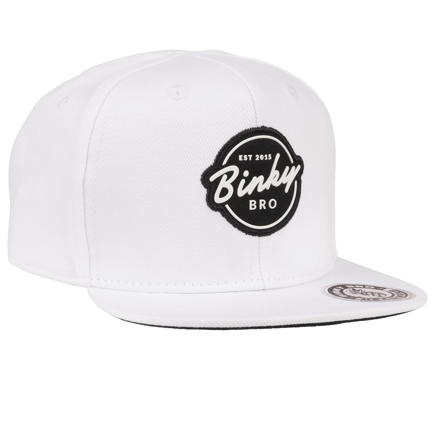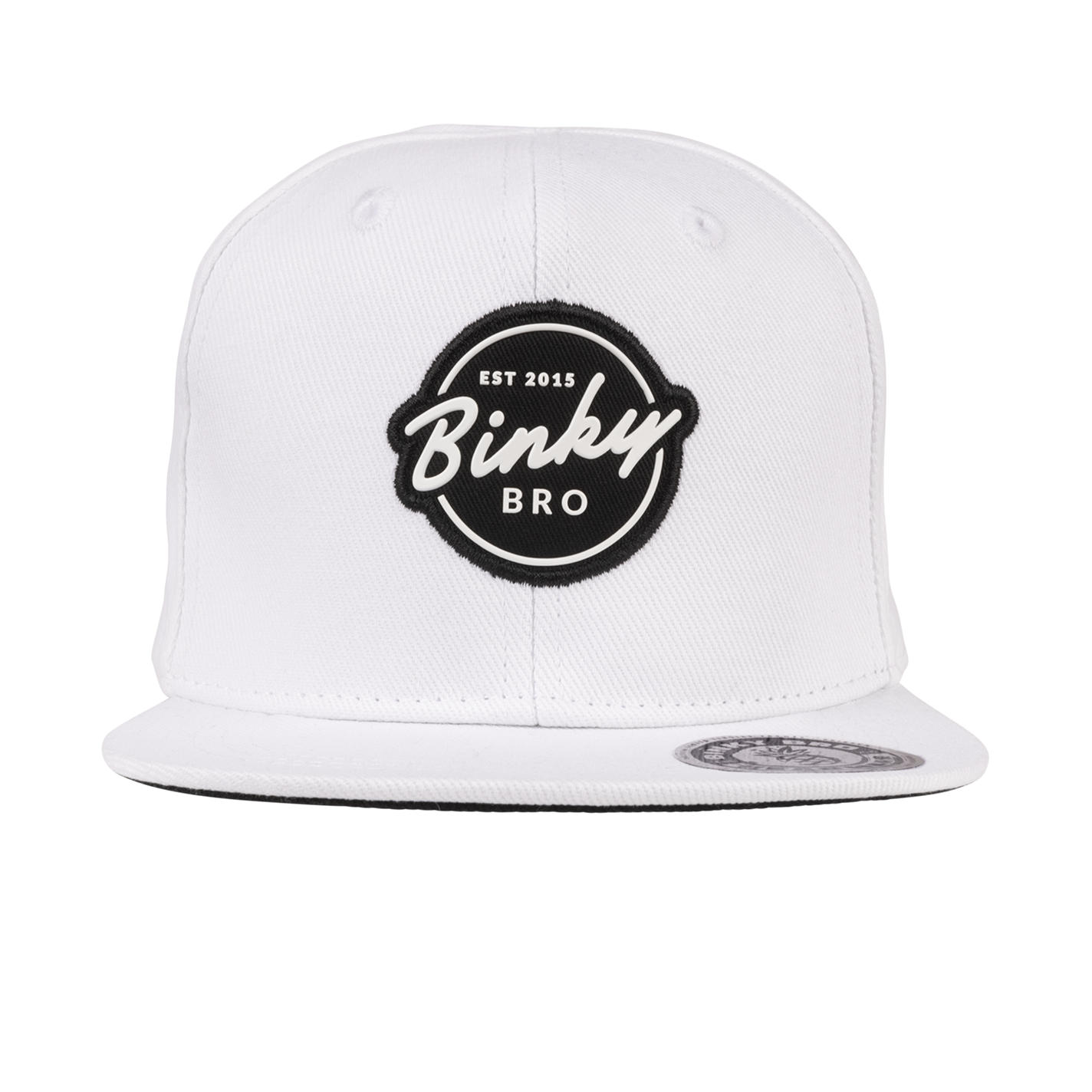 Our Maline Snapback has white paneling, a white brim (with black underneath), and a black and white "BinkyBro est 2015" embroidered patch. This hat is 100% cotton.