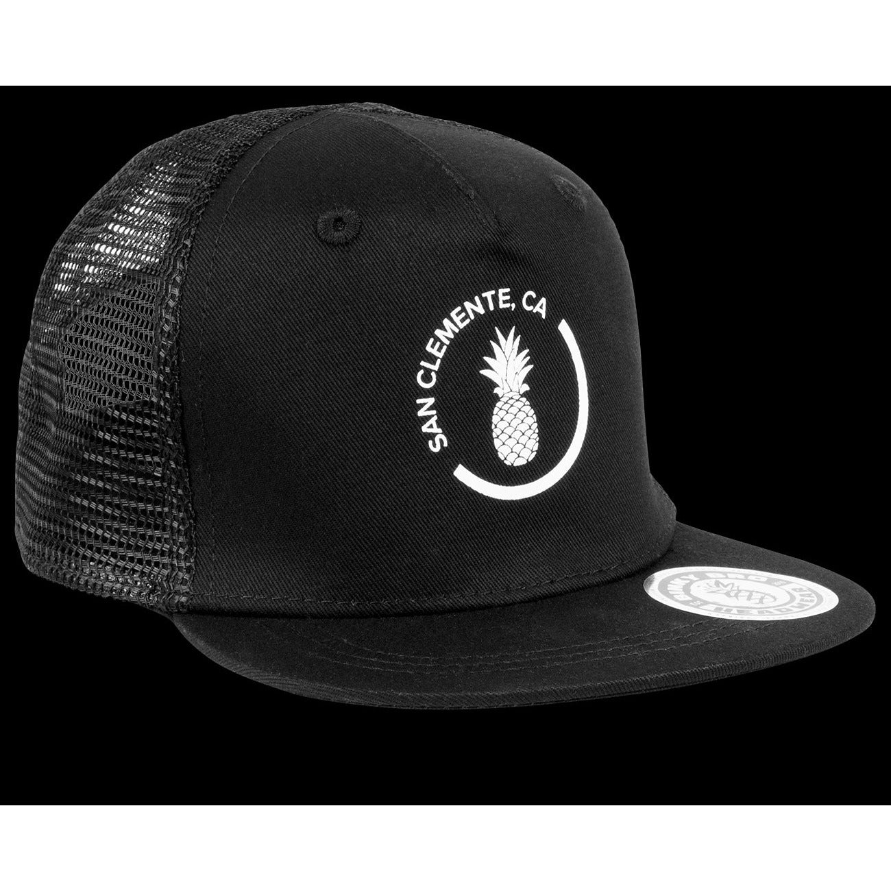 The San Clemente infant/baby, toddler, youth snapback hat has a black brim and panels, a white "San Clemente" logo on front, black mesh paneling, with a snapback.