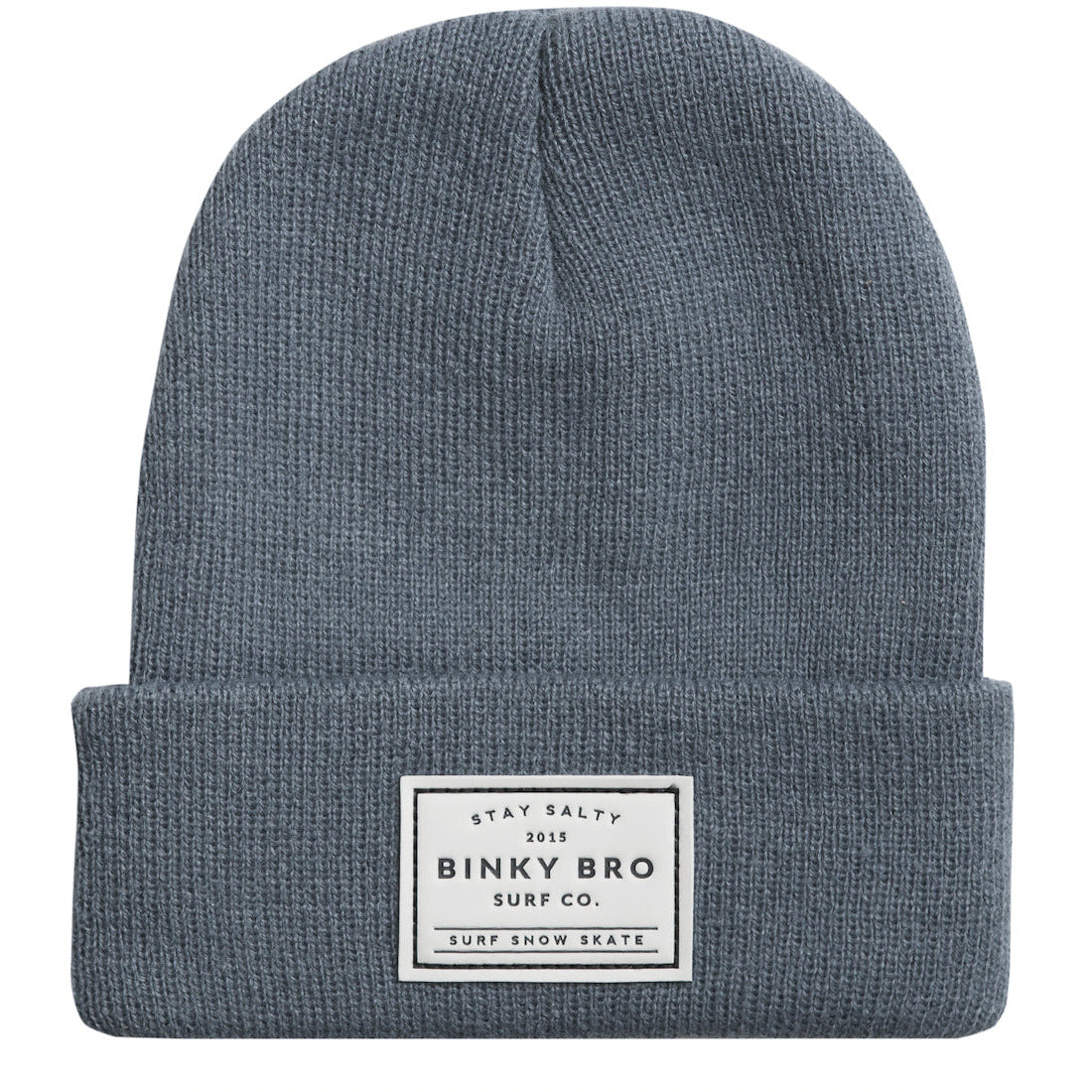 Our slate blue Tahoe beanie is 100% acrylic. It has a "BinkyBro Surf Co--Surf|Snow|Skate" embossed patch on the front. Sizes are currently available in newborn, infant, toddler, youth, and adult.