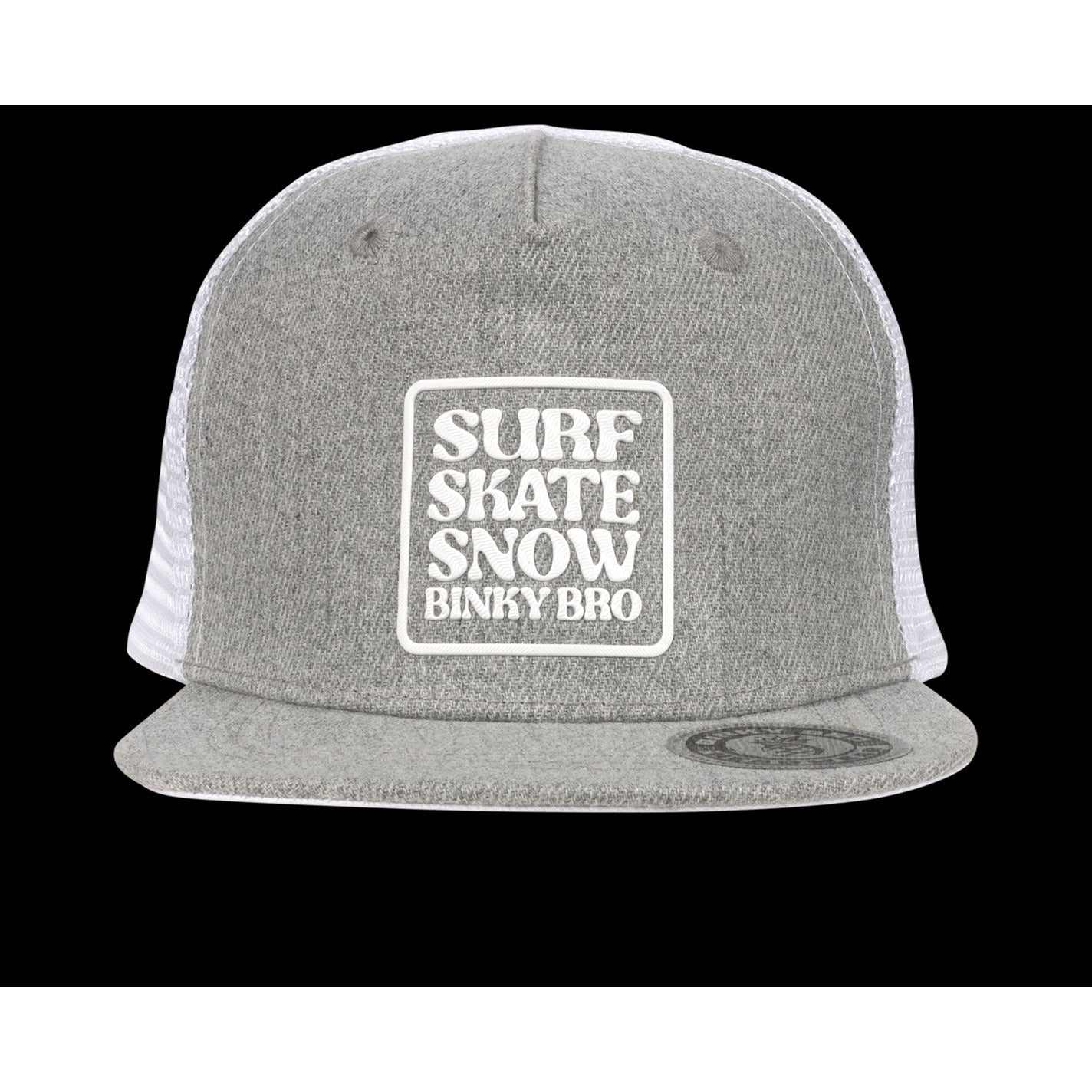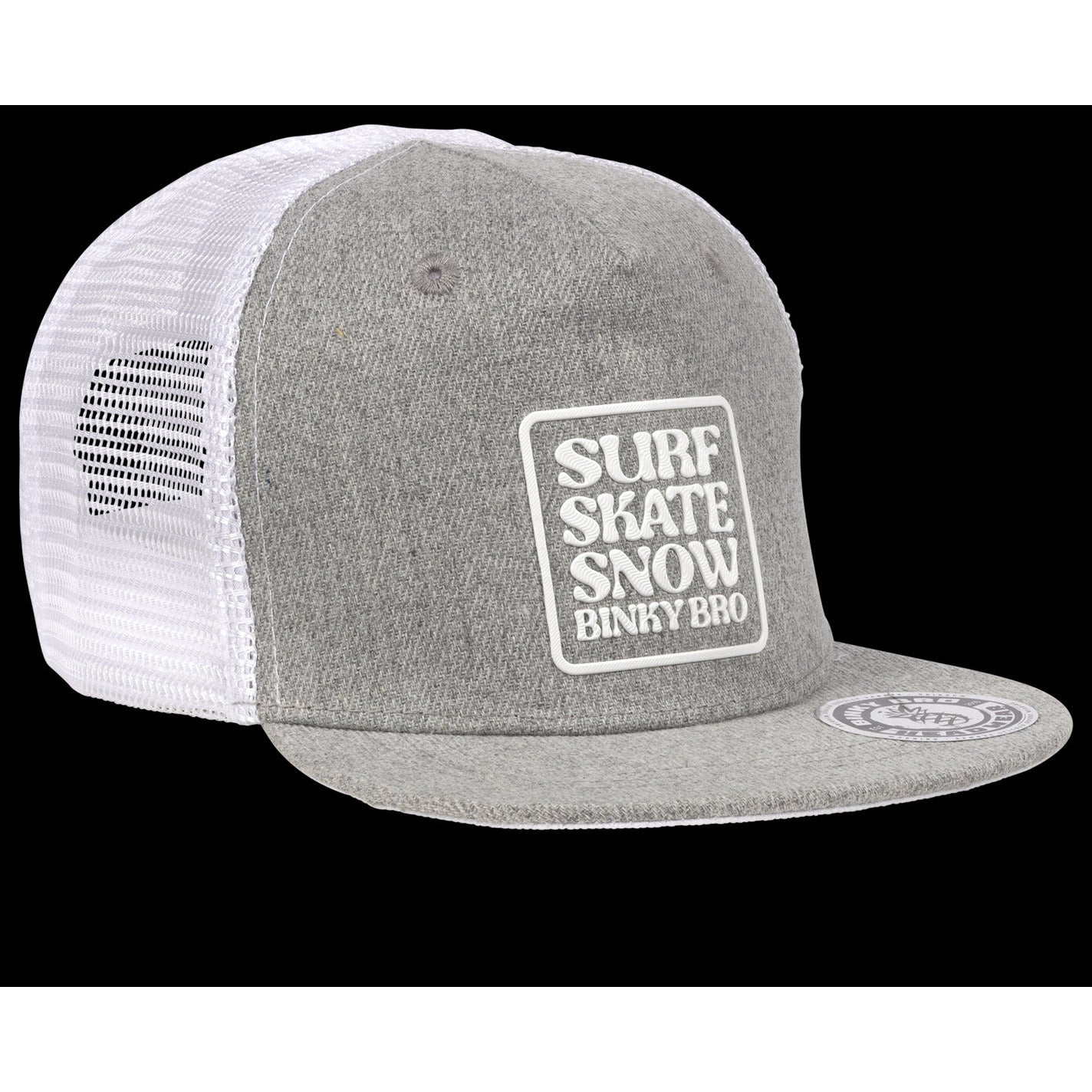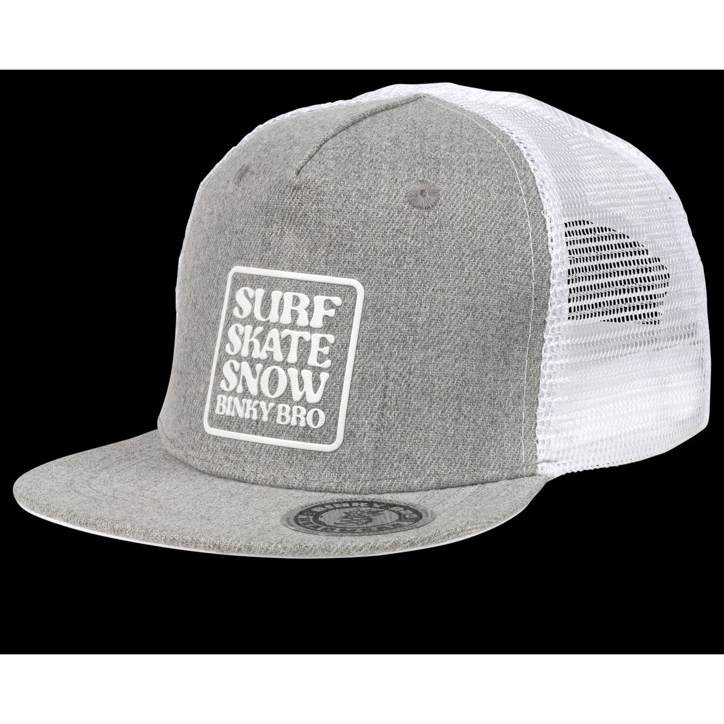 The Veracruz Snapback has a white BinkyBro logo on front, light charcoal front paneling, and white mesh on the back panels. The front bill is also a light charcoal color.