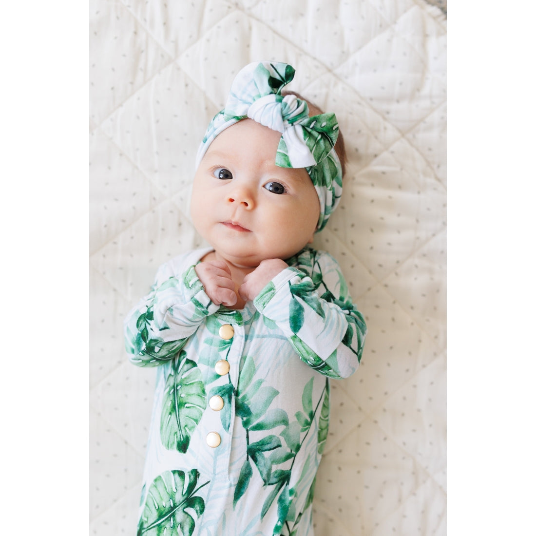 Fabric: Our headbands are made out of 95% viscose from bamboo and 5% spandex to provide a soft, stretchy fabric to fit comfortably on baby's head. Fit: Newborn to 4 months with an adjustable bow for a perfect fit Style: Our original print designs are made to be fun, vibrant and reflect a Florida lifestyle. Care: Machine wash cold with like colors, tumble dry low, do not bleach. Print was designed in collaboration with Jessa Bray!