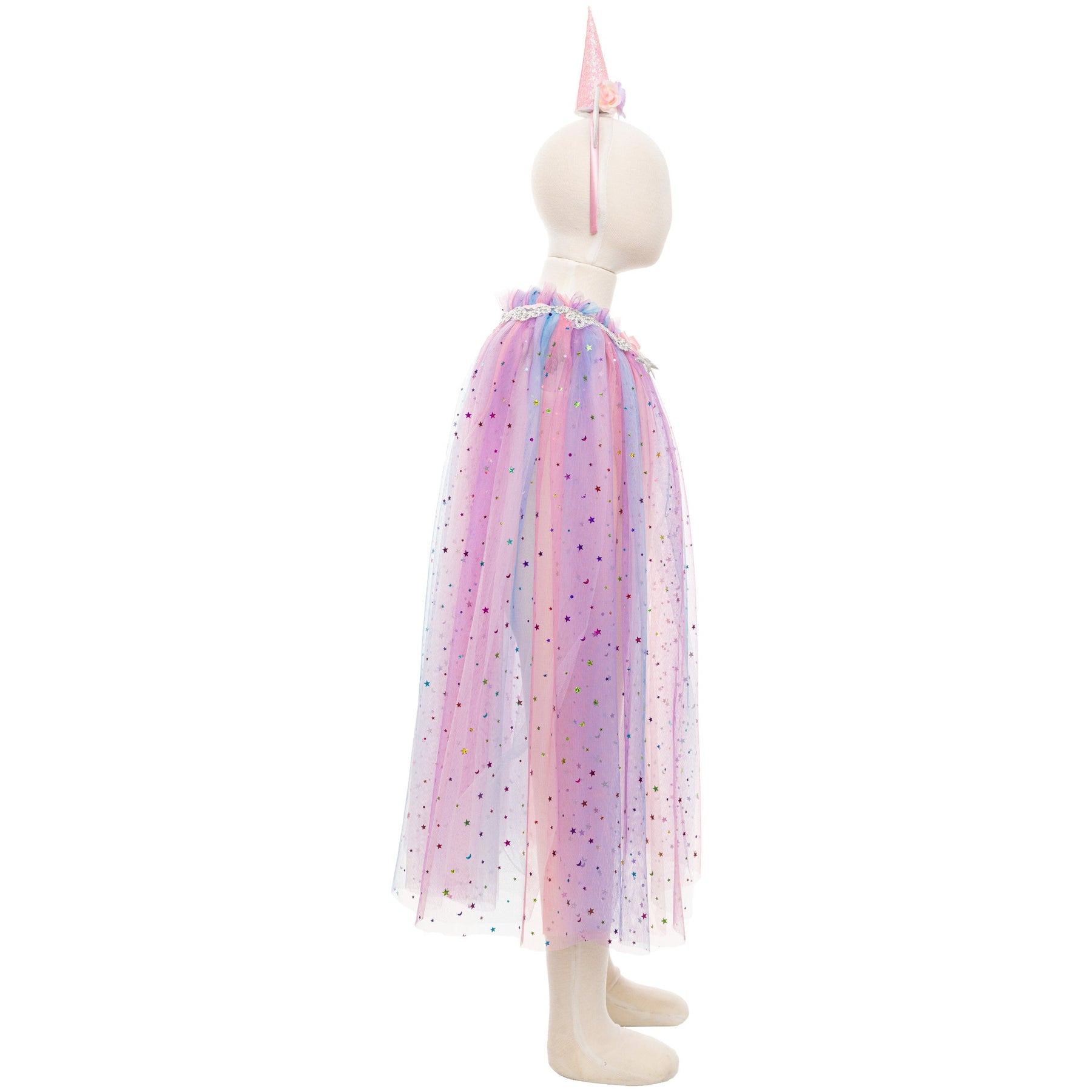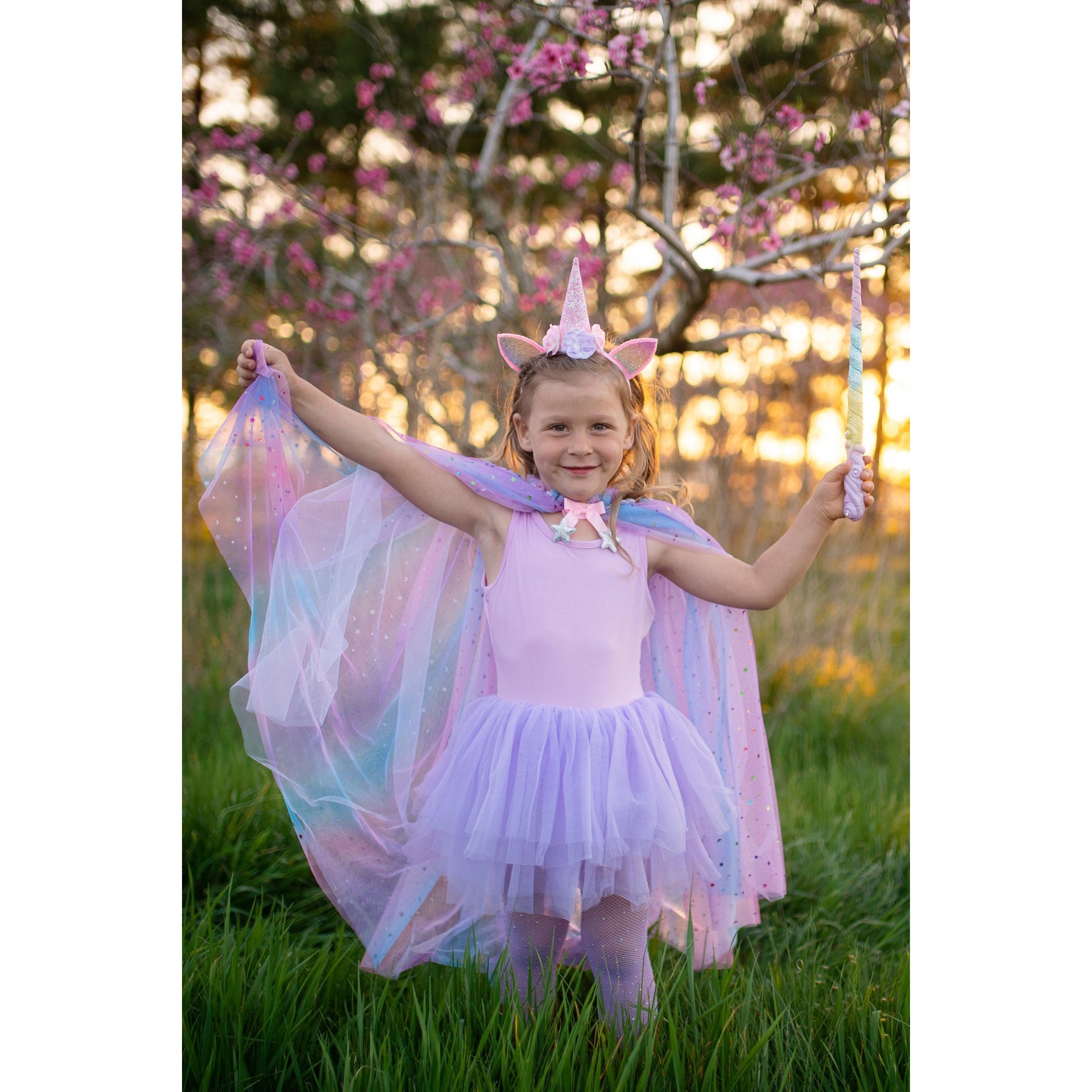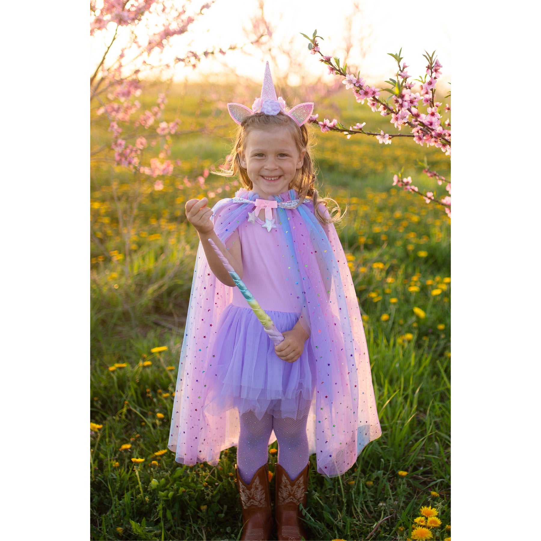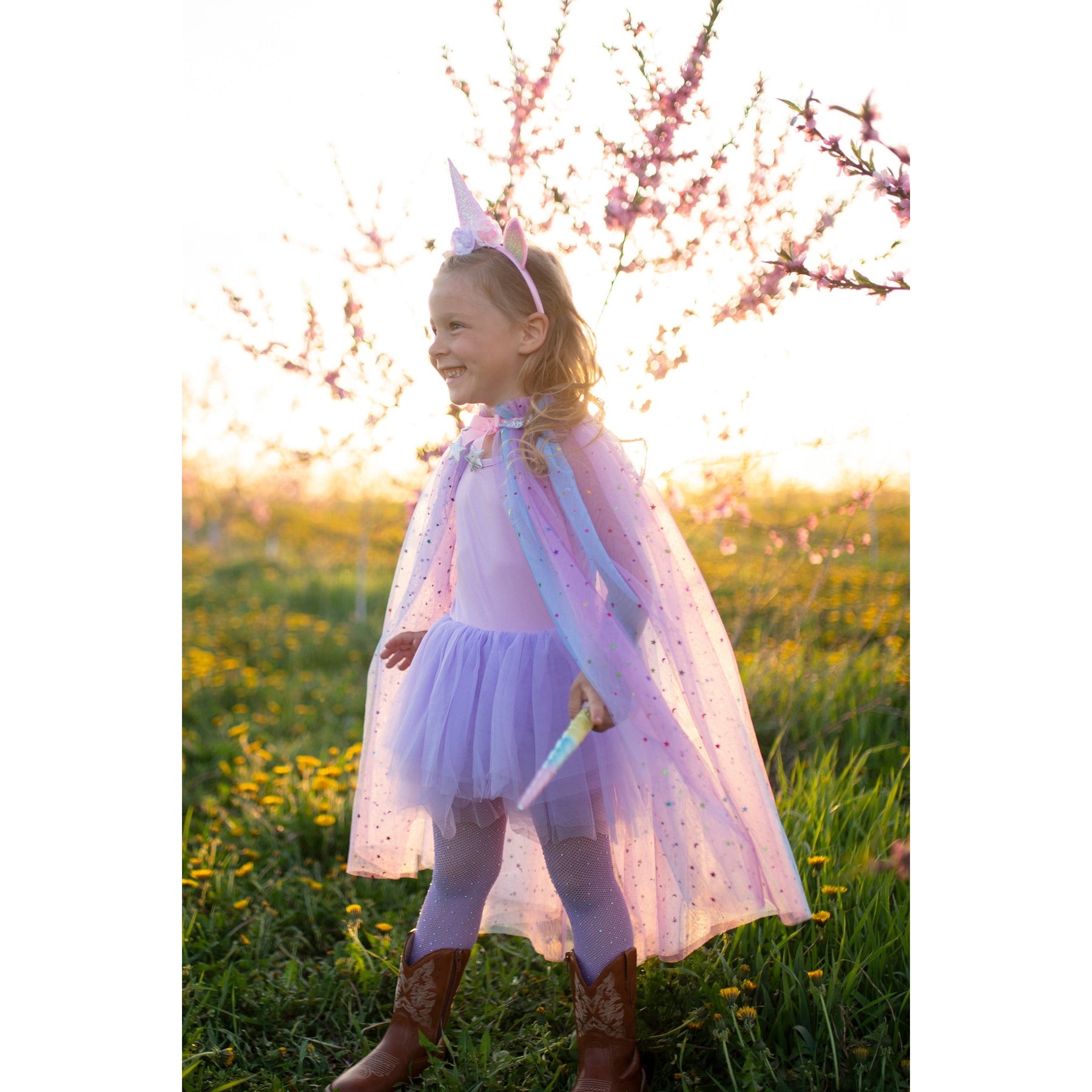Great Pretenders™ Butterfly Dress, Wings, and Wand 3-pc Set. This beautiful dress, wings, and wand set will transform all little fairies to a wonderful land of fantasy and imagination. The bodice is fully ruched satin and provides comfort and size flexibility. The skirt features layers of sparkly petals adorned with iridescent butterflies and is fully lined. Adorable 4-pc wings are very comfortable to wear because they come with satin covered elasticized straps. A matching wand completes the look to work the magic! Machine Washable. Great Pretenders™ products are made with durable, premium quality materials and exceptional workmanship.