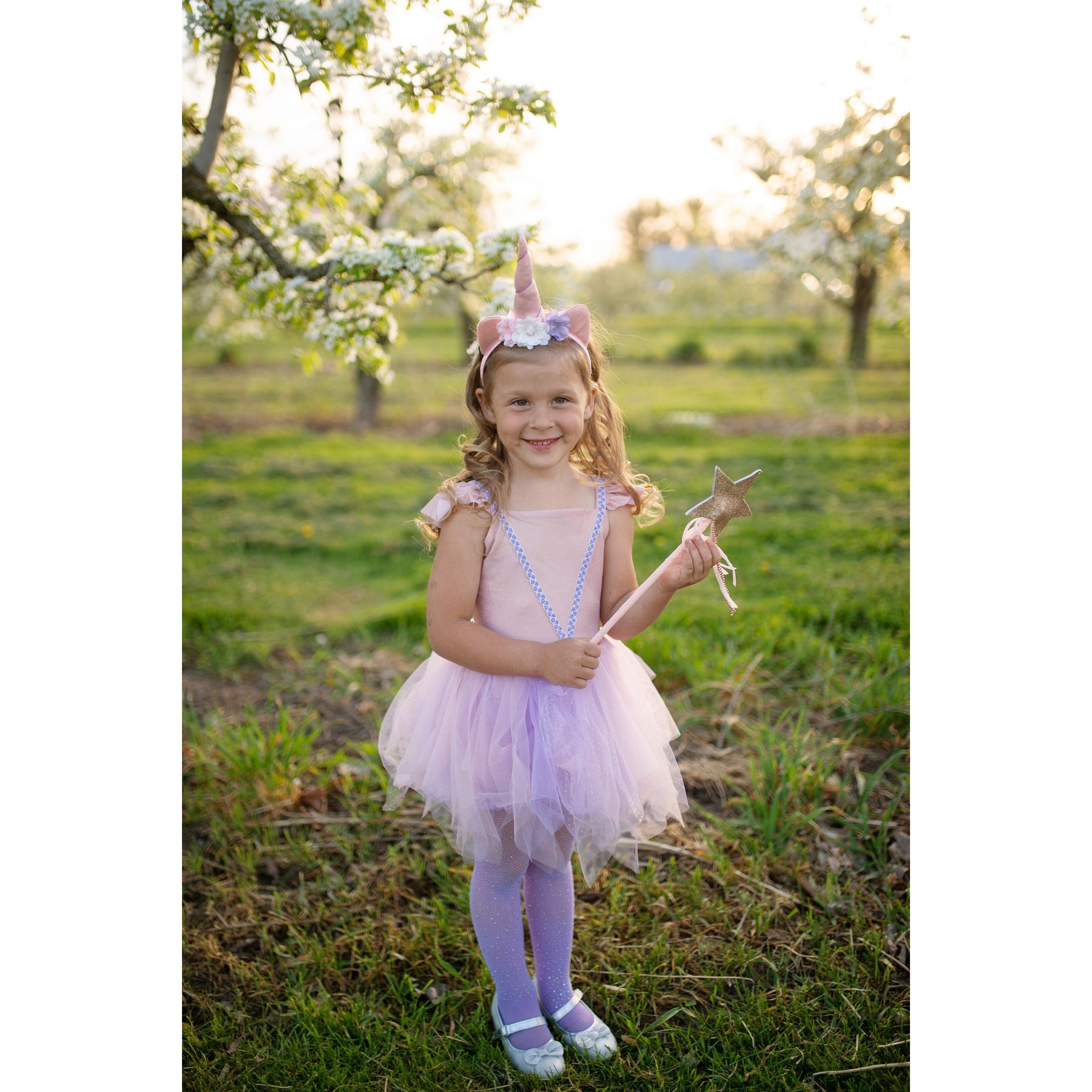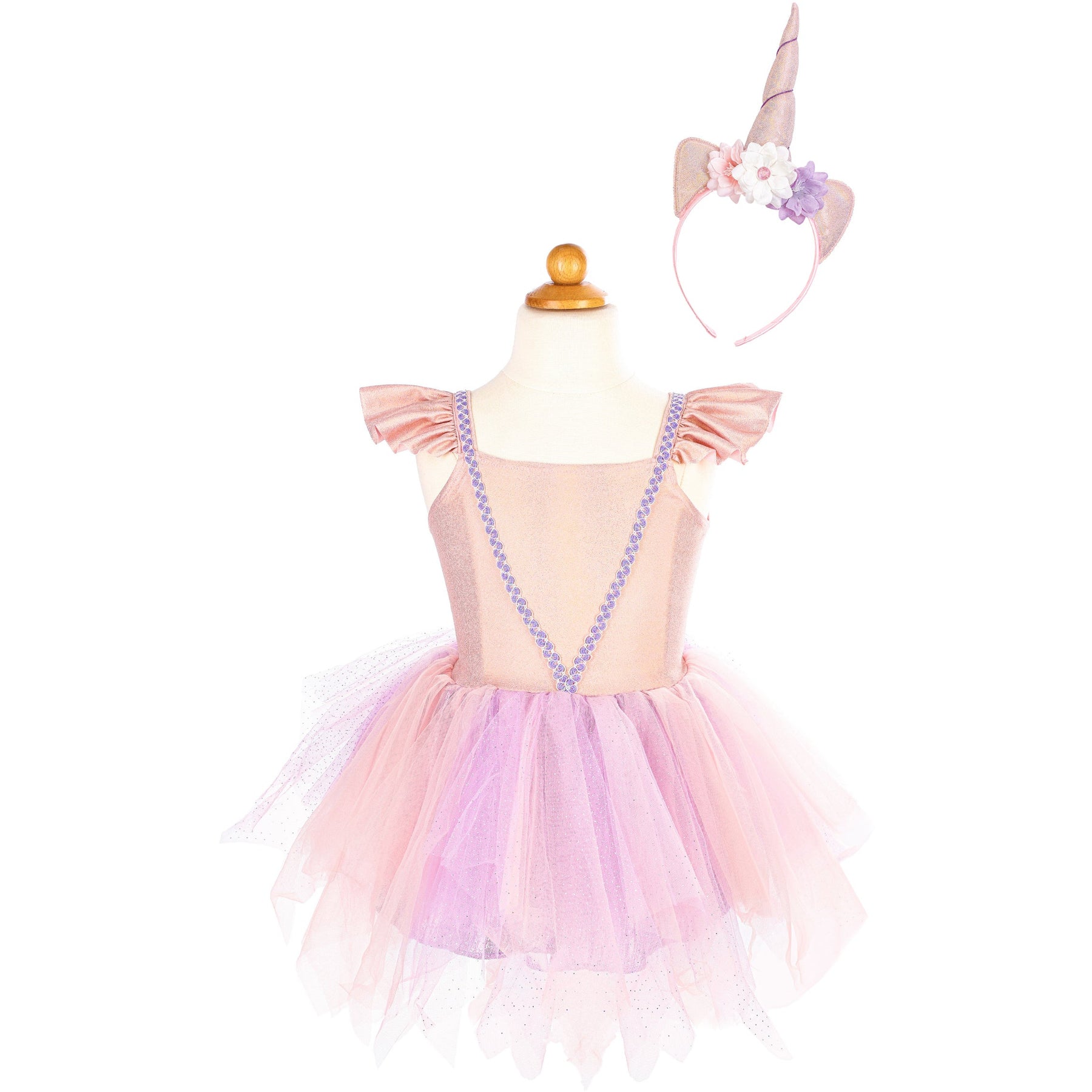 Look and feel as magical as a unicorn in our Shimmer Unicorn Dress & Headband set. This set features a soft pink dress with ruffled cap sleeves, purple detailing and a flouncy tulle skirt, and a floral unicorn headband.