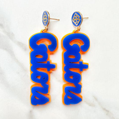 Brianna Cannon University of Florida Earrings Blue Gators Script Logo over Neon Orange with Blue BC Logo Top