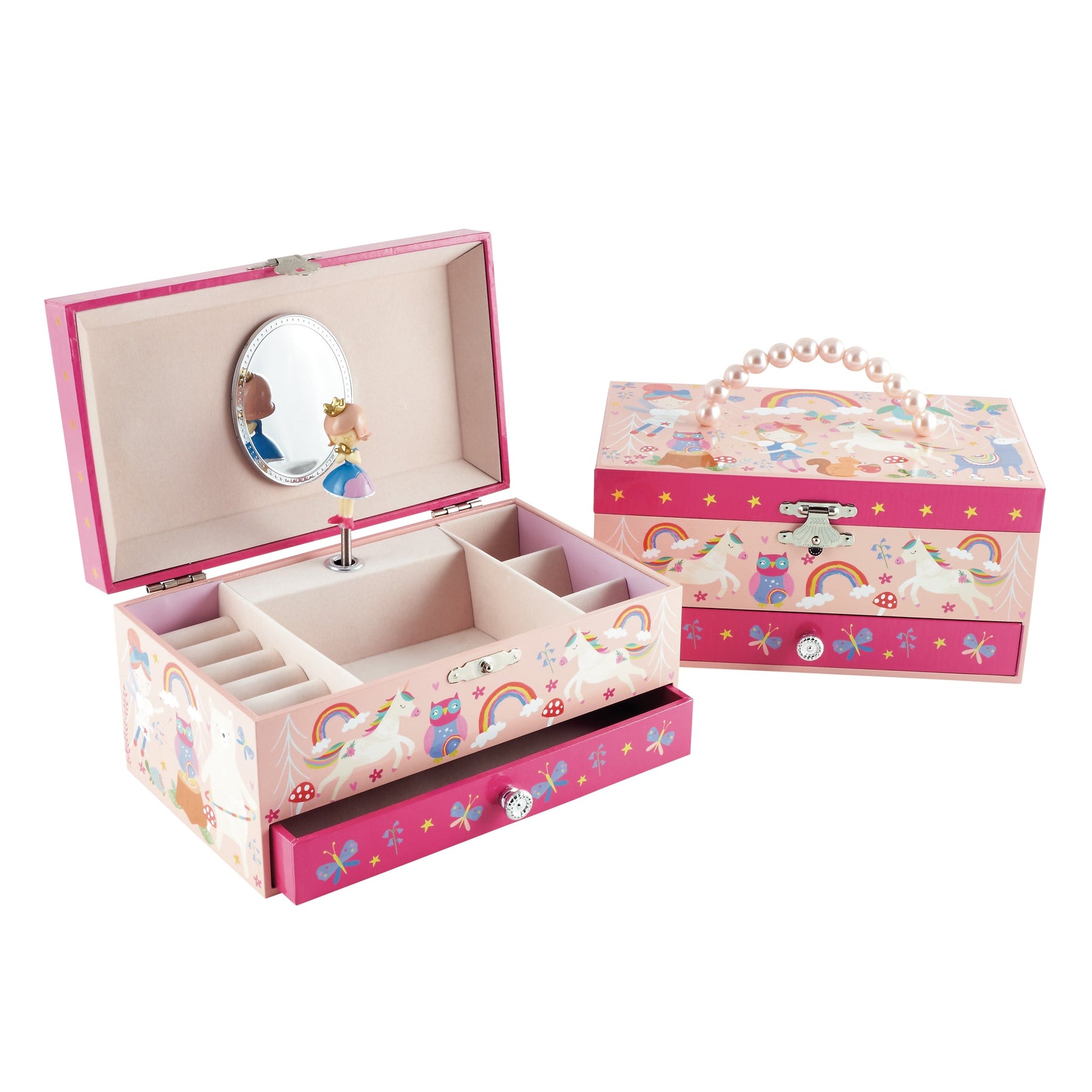 Floss & Rock musical jewelry boxes are one of their best selling products! With a pretty feathery and pearl handle and a drawer for extra storage space making this box a guaranteed best seller. Wind up the key at the back, open the lid and the FAIRY twirls to the beautiful music "Over the Rainbow". Size: 3.6 x 7. x 4.5 inches Recommended Age: 3+