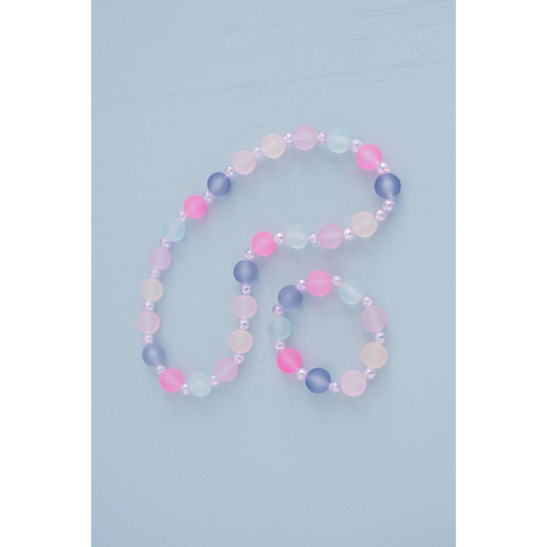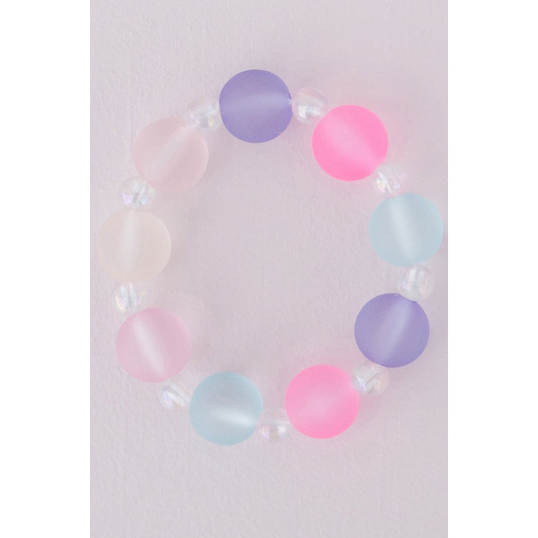 This bumpy bead bracelet is made with blue, pink, and purple frosted beads, alternating between smaller clear beads. This unique style is made perfectly for children's wrists.