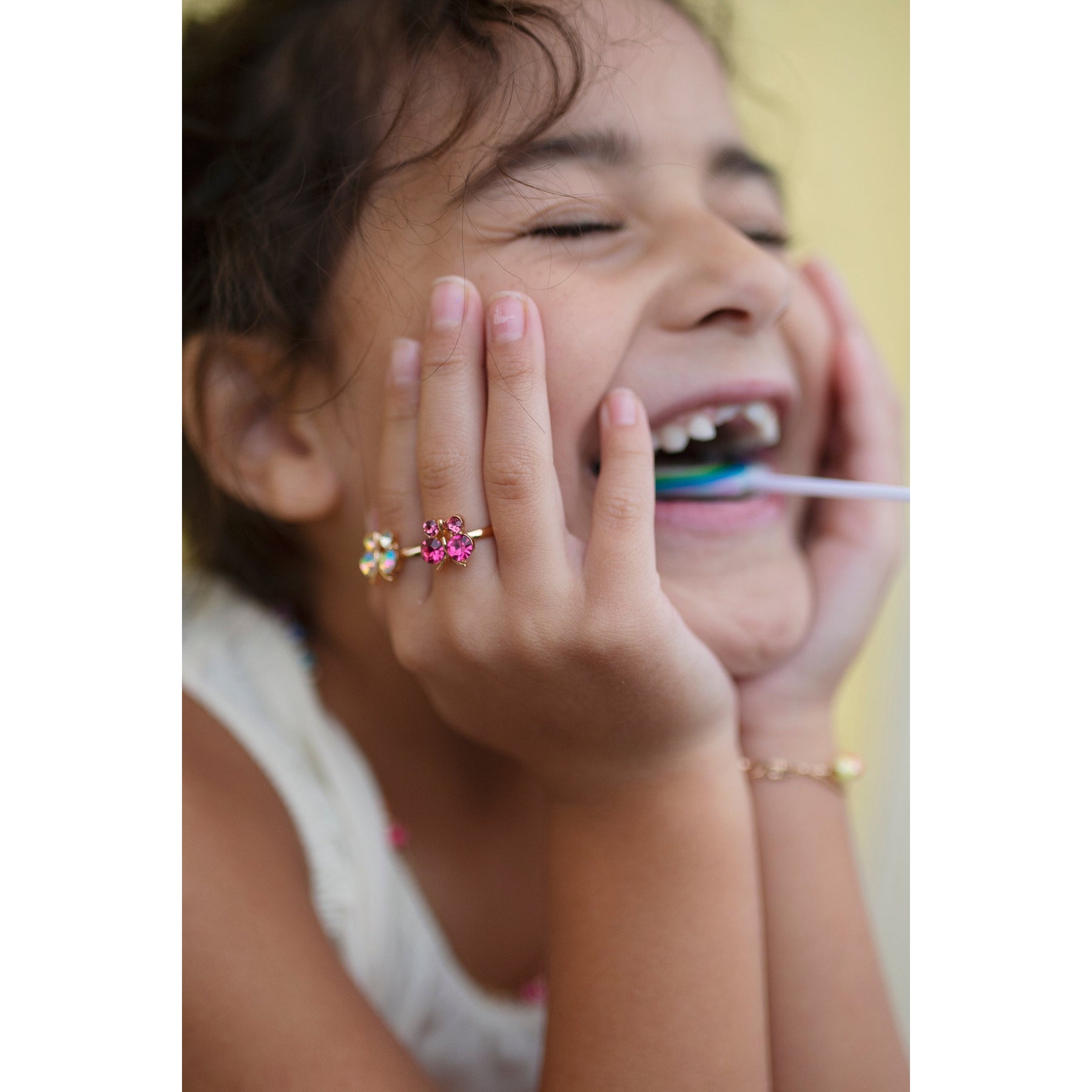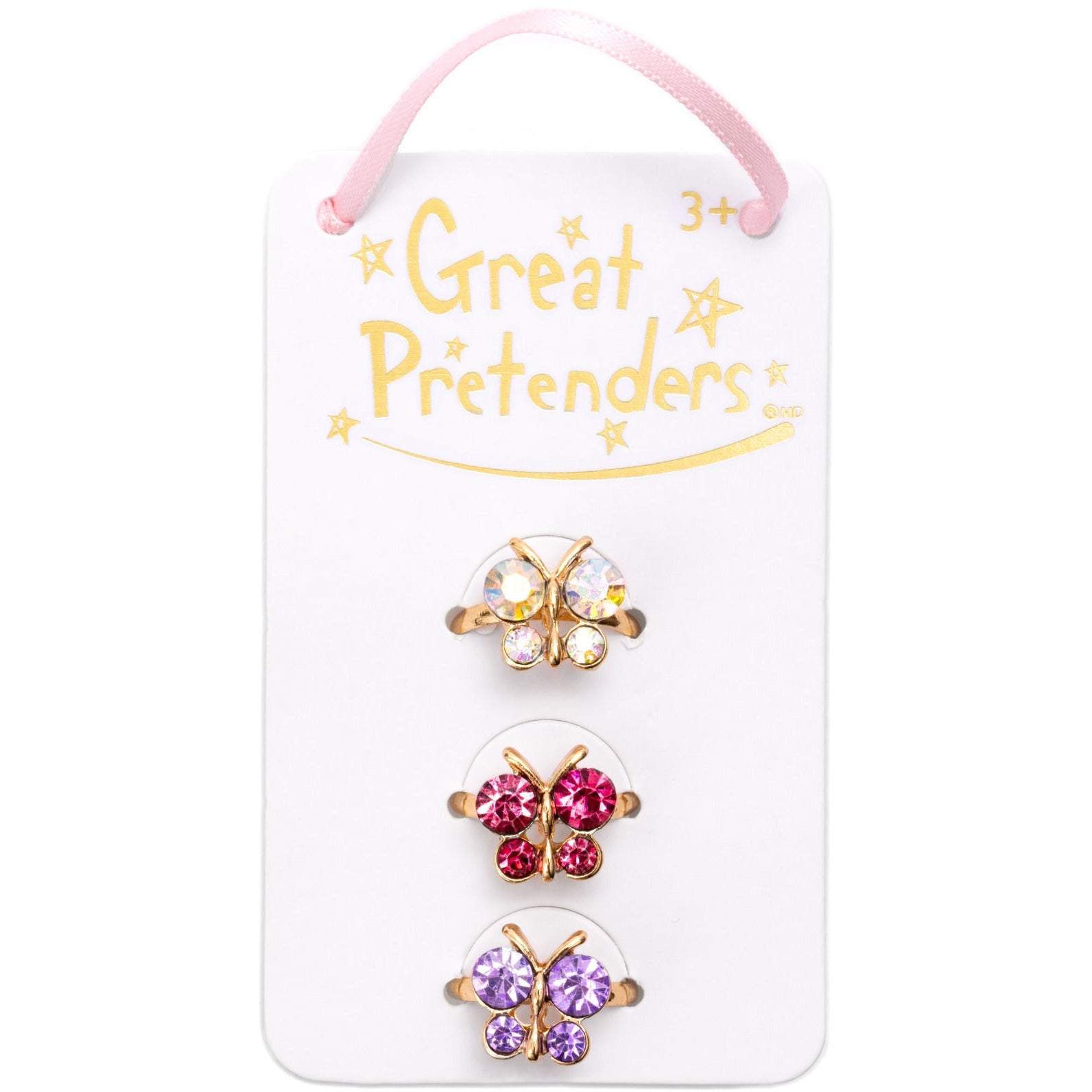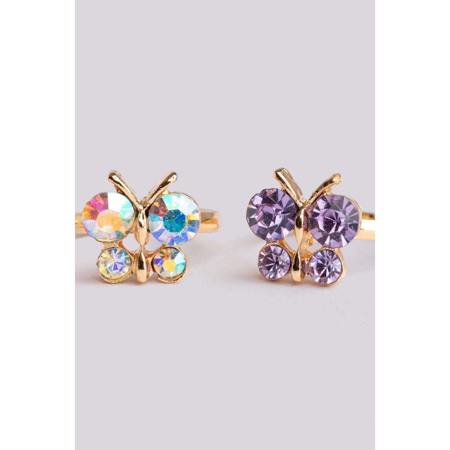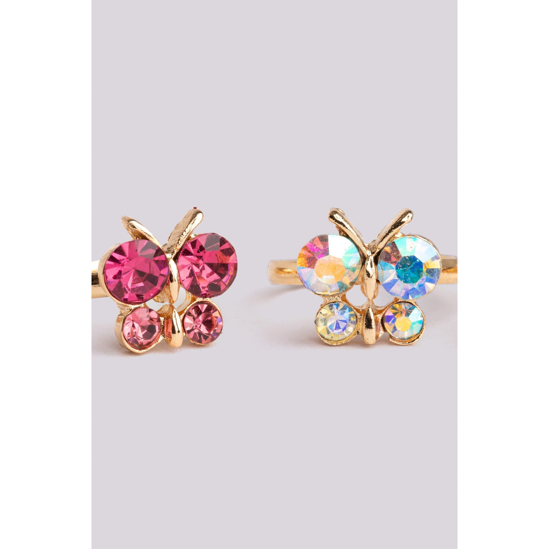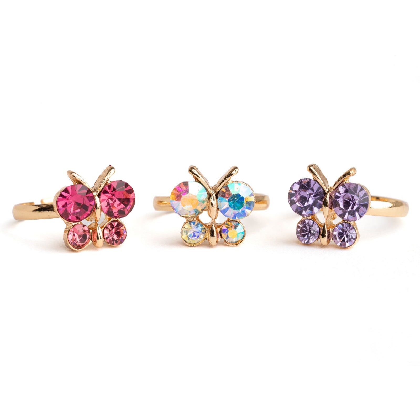 Bring on the sparkle and shine with our beautiful Boutique Butterfly Gem Rings. Each ring in this 3-piece set features a shimmery jewel-toned butterfly design on a gold-coloured band sized perfectly for little fingers.