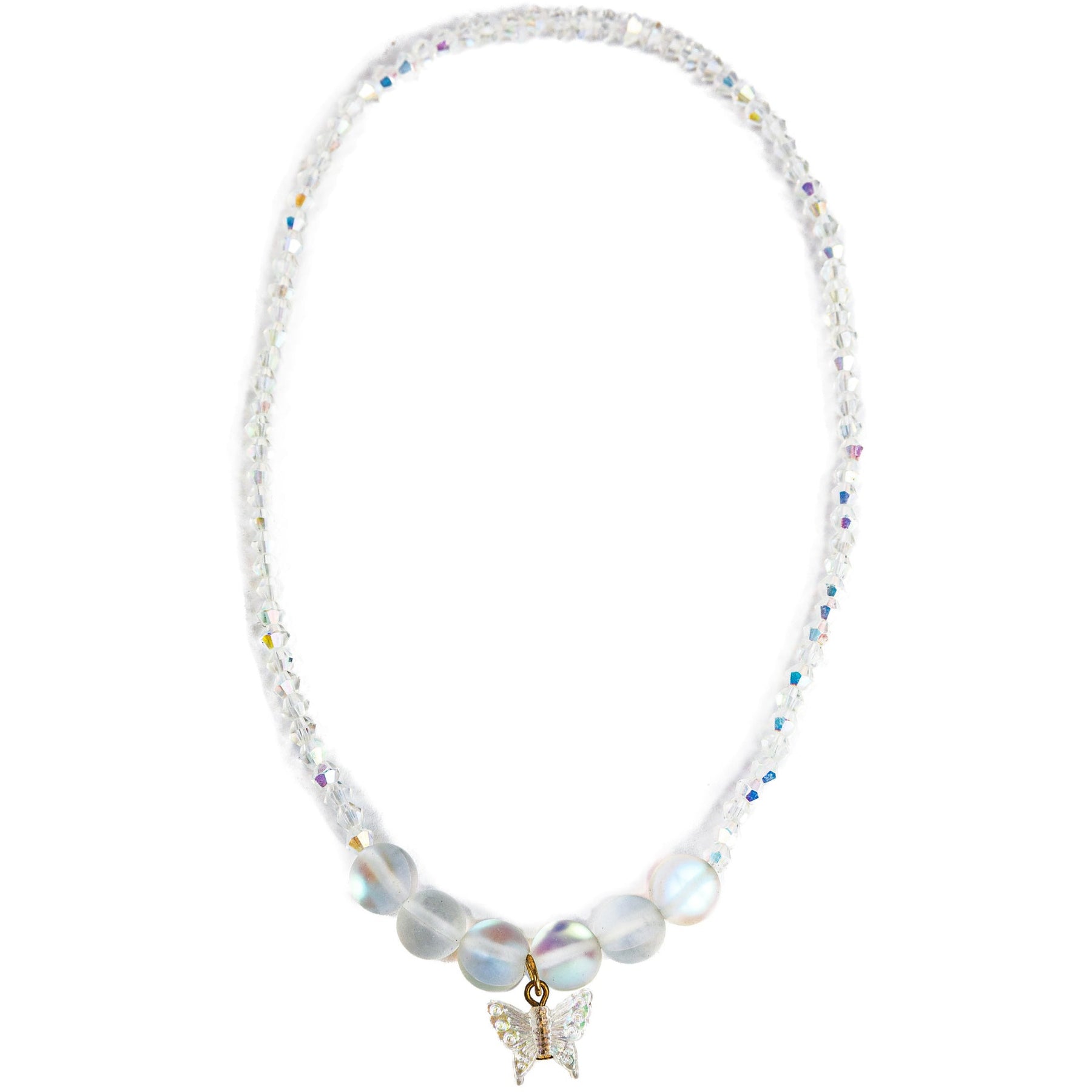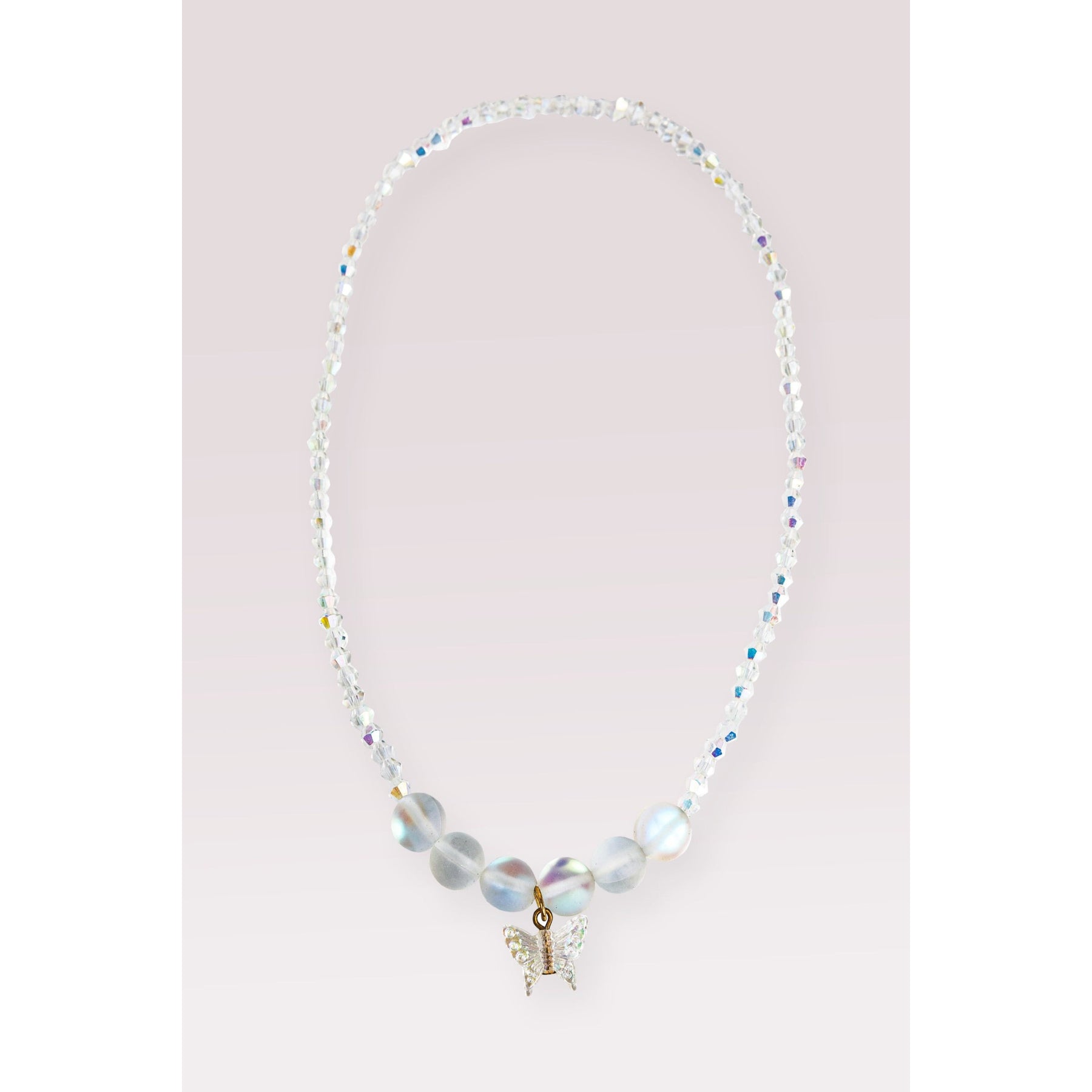 This is an epic combination of smooth iridescent glass beads and smaller faceted iridescent beads, paired with a fabulous glimmering iridescent butterfly charm. This necklace is glowing and magnificent. Hold it up to the light to get the true rainbow effect. Check out the matching bracelet to complete the look.