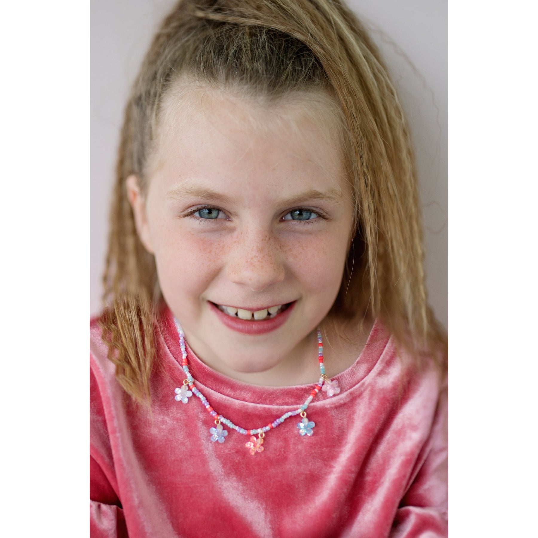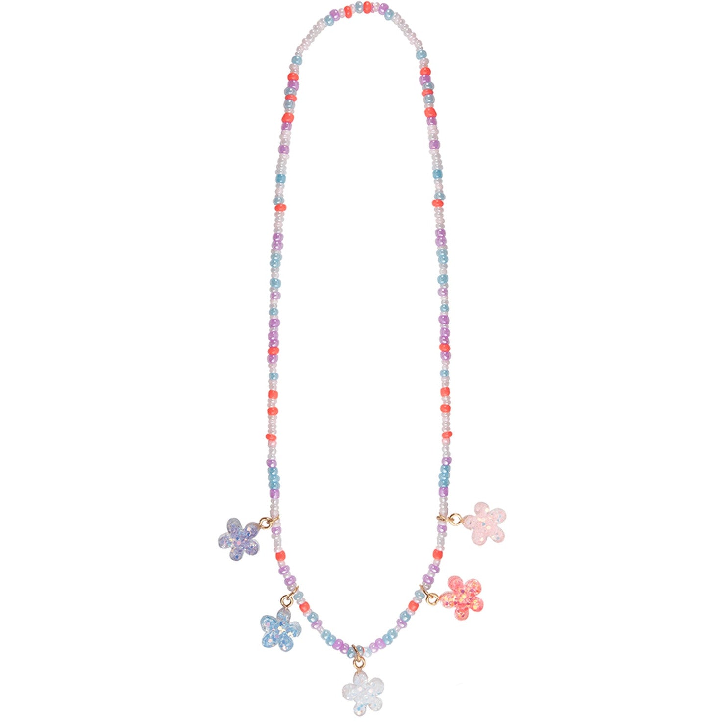 Your little one will love the colors in this shimmery necklace. Made in coral, blue, purple, pink, and white beads, and finished with 5 beautiful flower charms. The flowers are made with a glitter backing to give them a little sparkle.