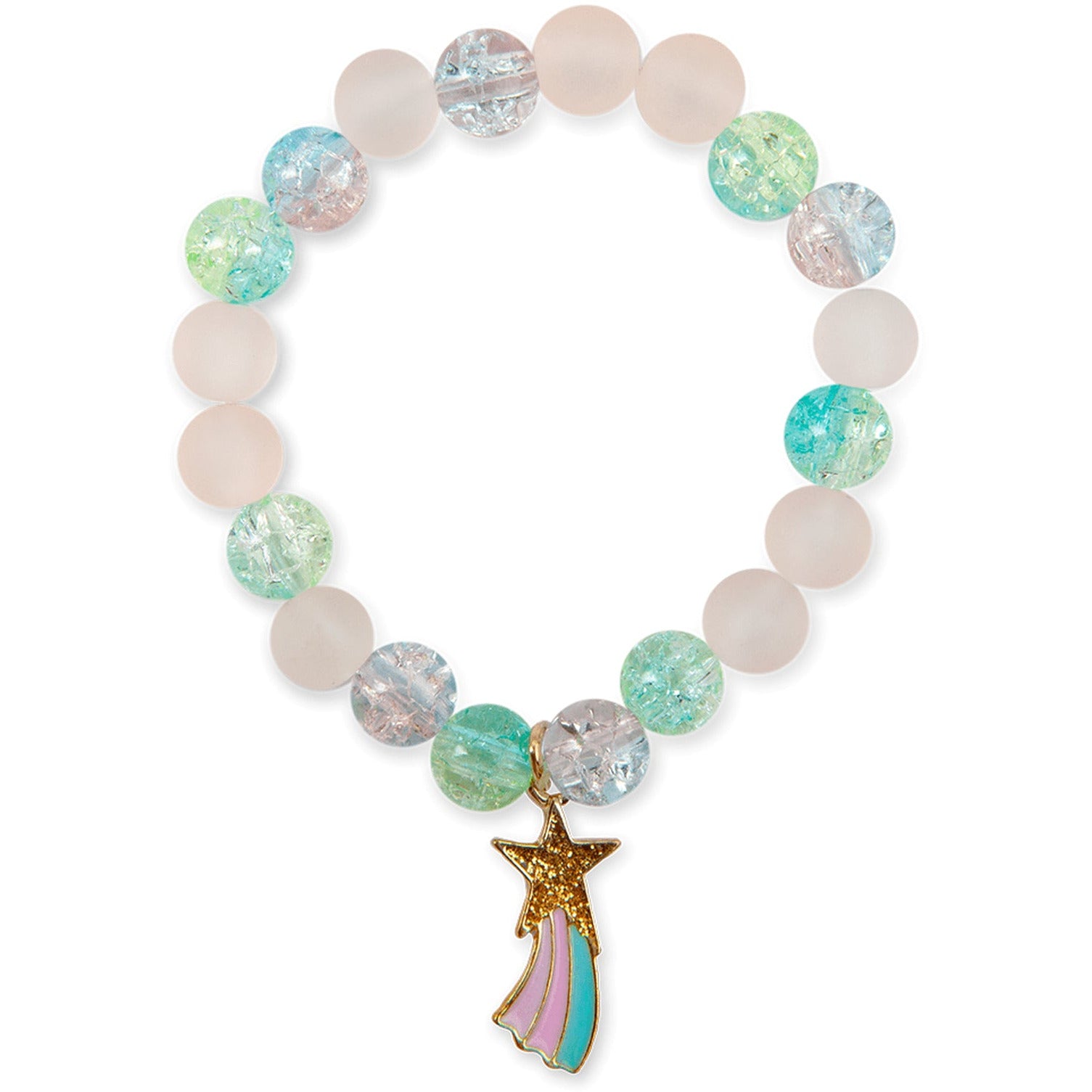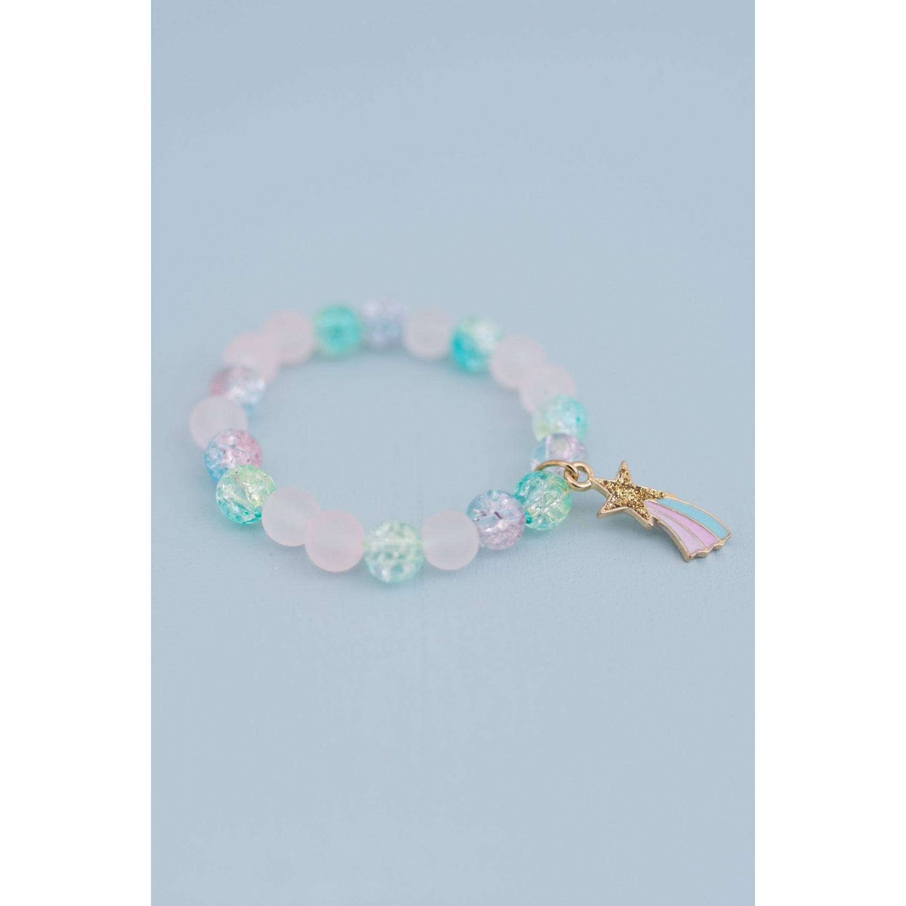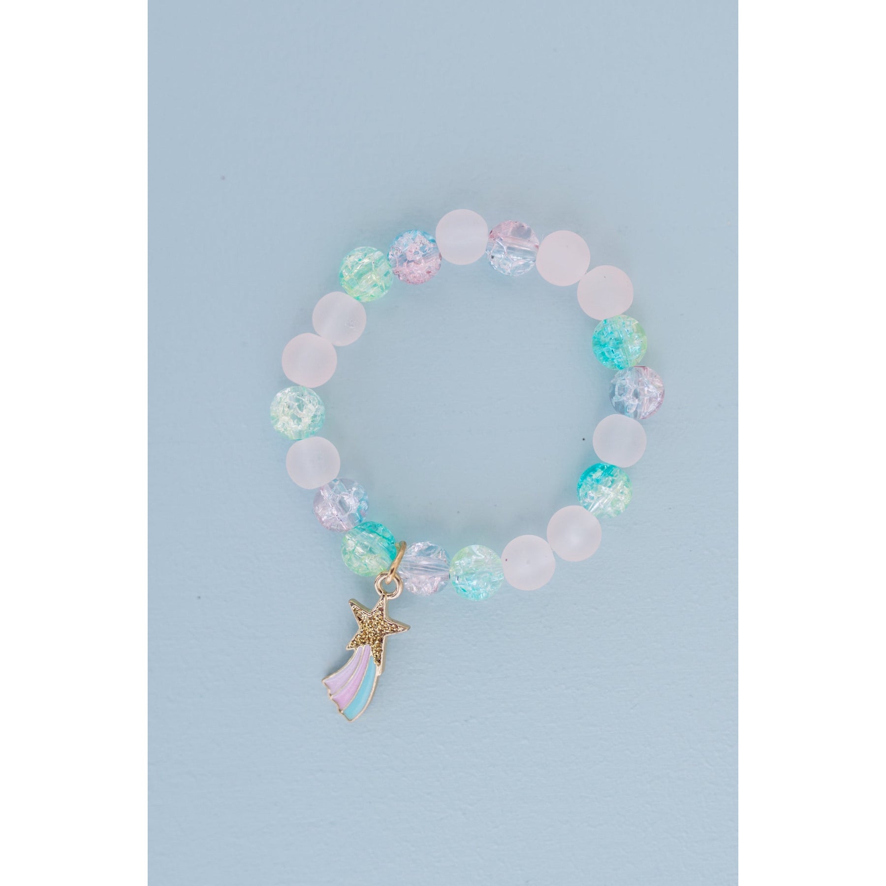 Great Pretenders USA's Boutique Superstar Bracelet is made with beautiful frosted pink beads & is paired with a sparkly teal and blue bead finished off with a shooting star pendant. Be sure to check out its matching necklace!